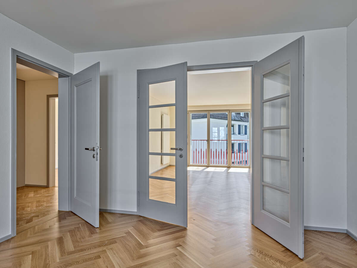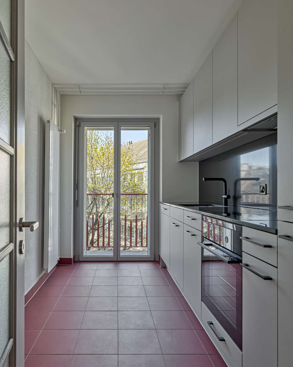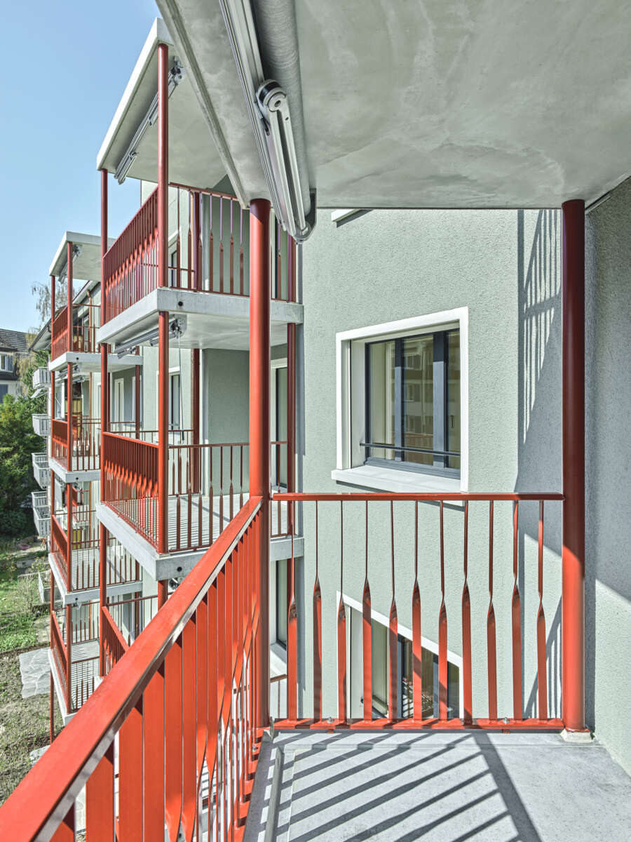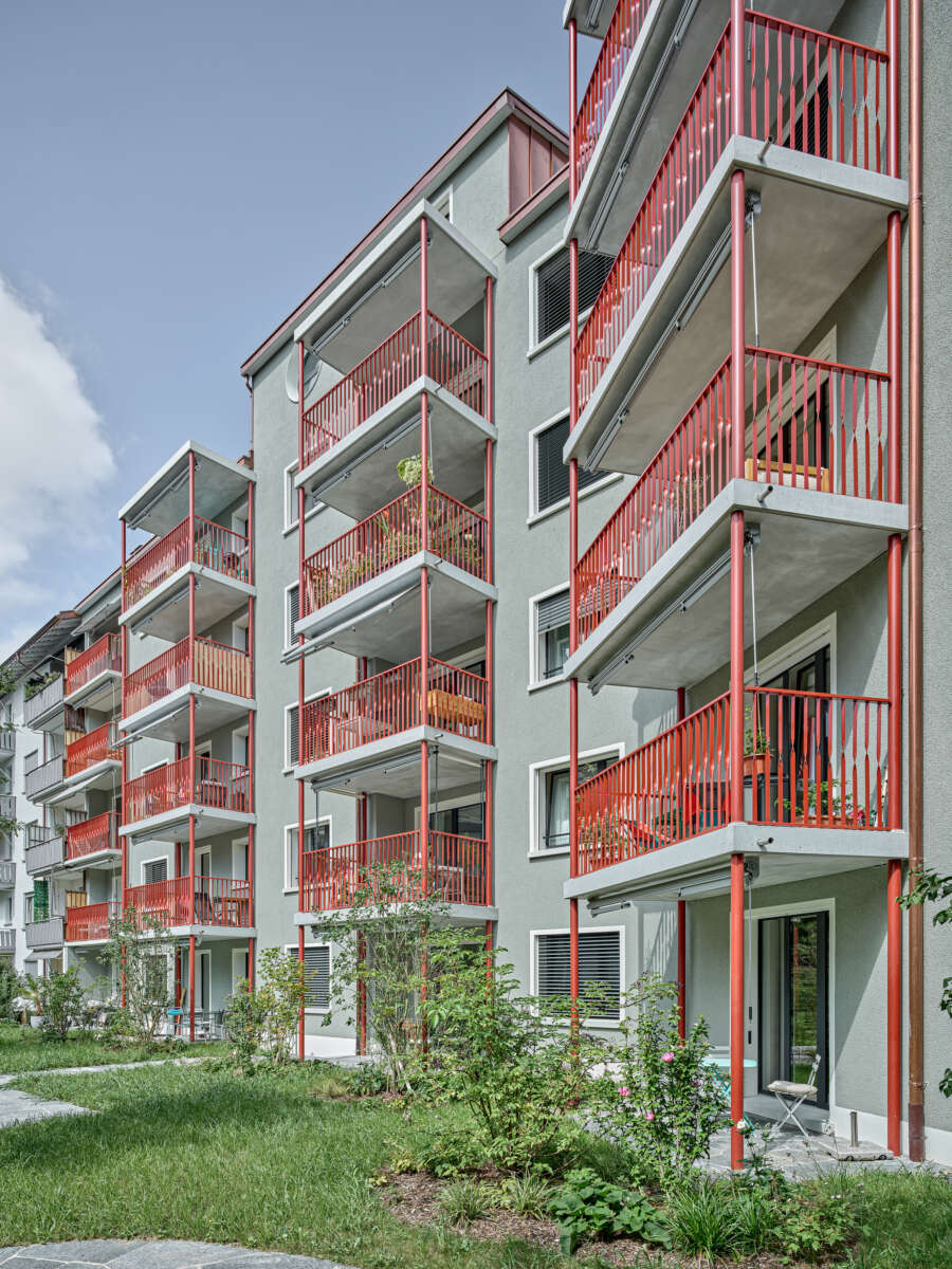 Im einen Bestandsbau führt zudem die Neudisposition zweier Wände zu einer zusätzlichen Wohneinheit pro Etage. Dies optimiert den Wohnungsmix weiter – und damit den Fokus auf eine breitere Nutzerschicht. Ansonsten bleibt die Eingriffstiefe in den Wohnungen auf liebevolle Restaurationsarbeiten und Oberflächensanierungen beschränkt. Letztere auch in interpretierender Zeitgeist-Manier wie z.B. neuem Fischgratparkett. Ebenso erhalten alle Wohnungen im Süden neue, geräumigere Balkone vorgelagert. Aufwändiger gestalteten sich indes Massnahmen zur Erdbebenertüchtigung und für verbesserten Schallschutz. Zusammen mit der gut gedämmten Fassade sorgen sie für einen komfortablen Betrieb. (mc)
