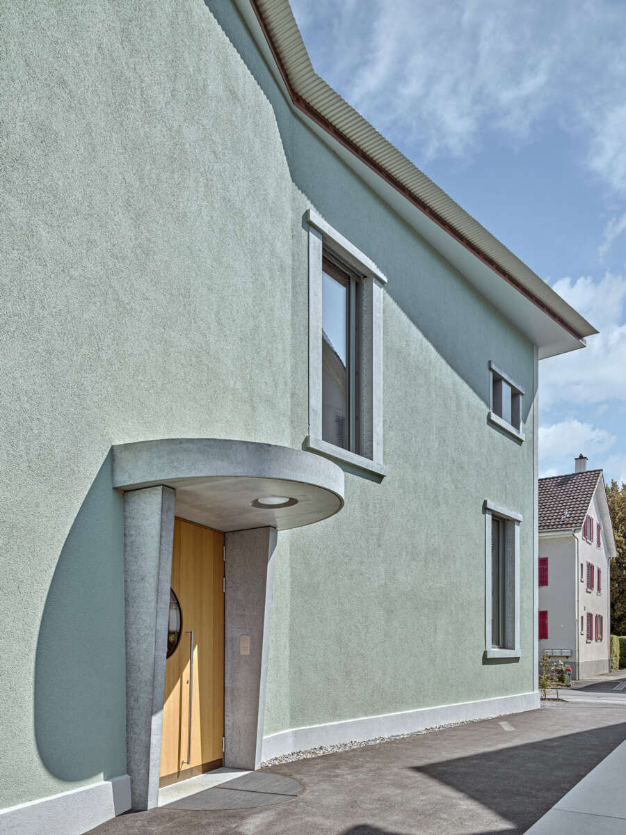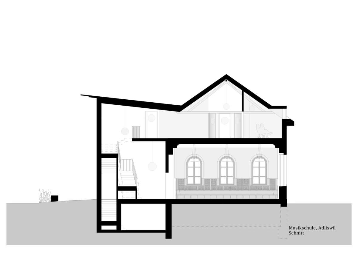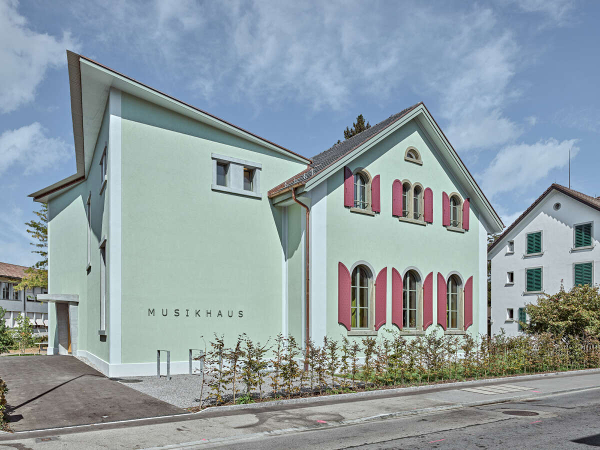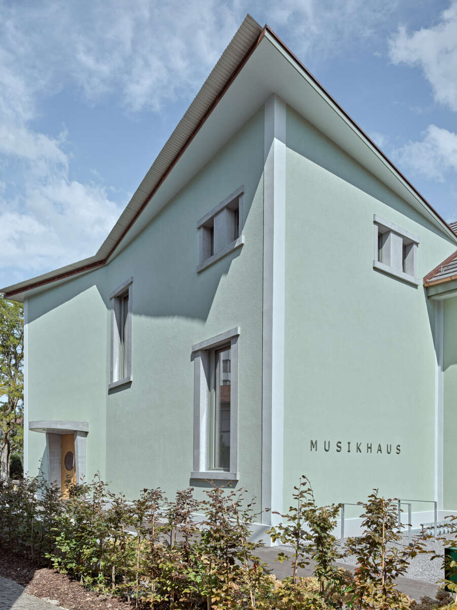 Angrenzend an die Schulanlage Kronenwiese hat eine Kapelle aus dem Jahre 1900 ein neues Gesicht erhalten. Bereits 1905 in einen Kindergarten transformiert, erfuhr das Gotteshaus über die letzten 120 Jahre ein Konglomerat von An- und Umbauten. Diese hingen wie Trauben an der Westfassade und verliehen ihm einen äusserst profanen Ausdruck. Ebenso liessen der einst hohe Kapellraum – der 1929 einem Zwischengeschoss zum Opfer fiel – wie auch die gekappten Rundbogenfenster längst keine sakrale Stimmung mehr aufkommen. Mittels Wettbewerbs wurde ein Architekturpartner gesucht, um die örtliche Musikschule künftig unter einem Dach zu vereinen.