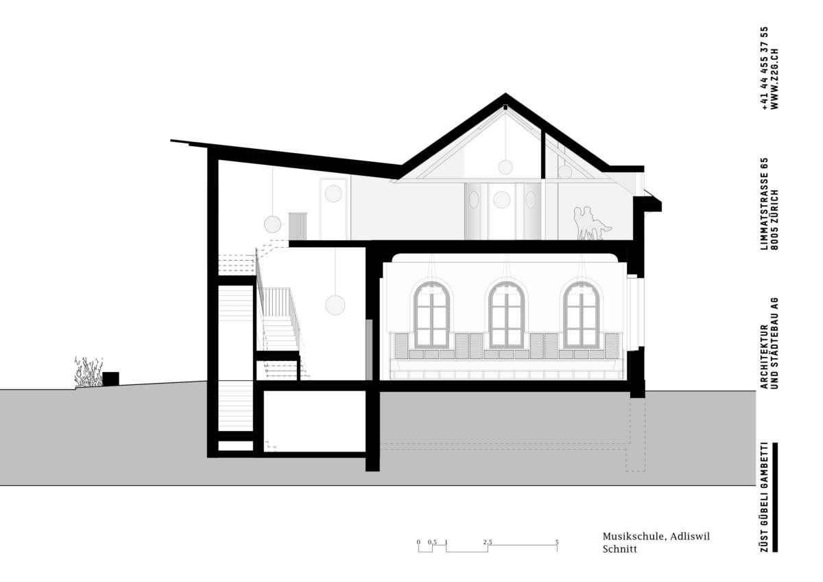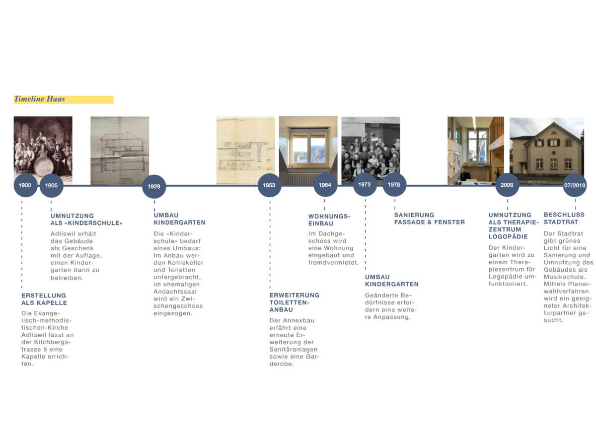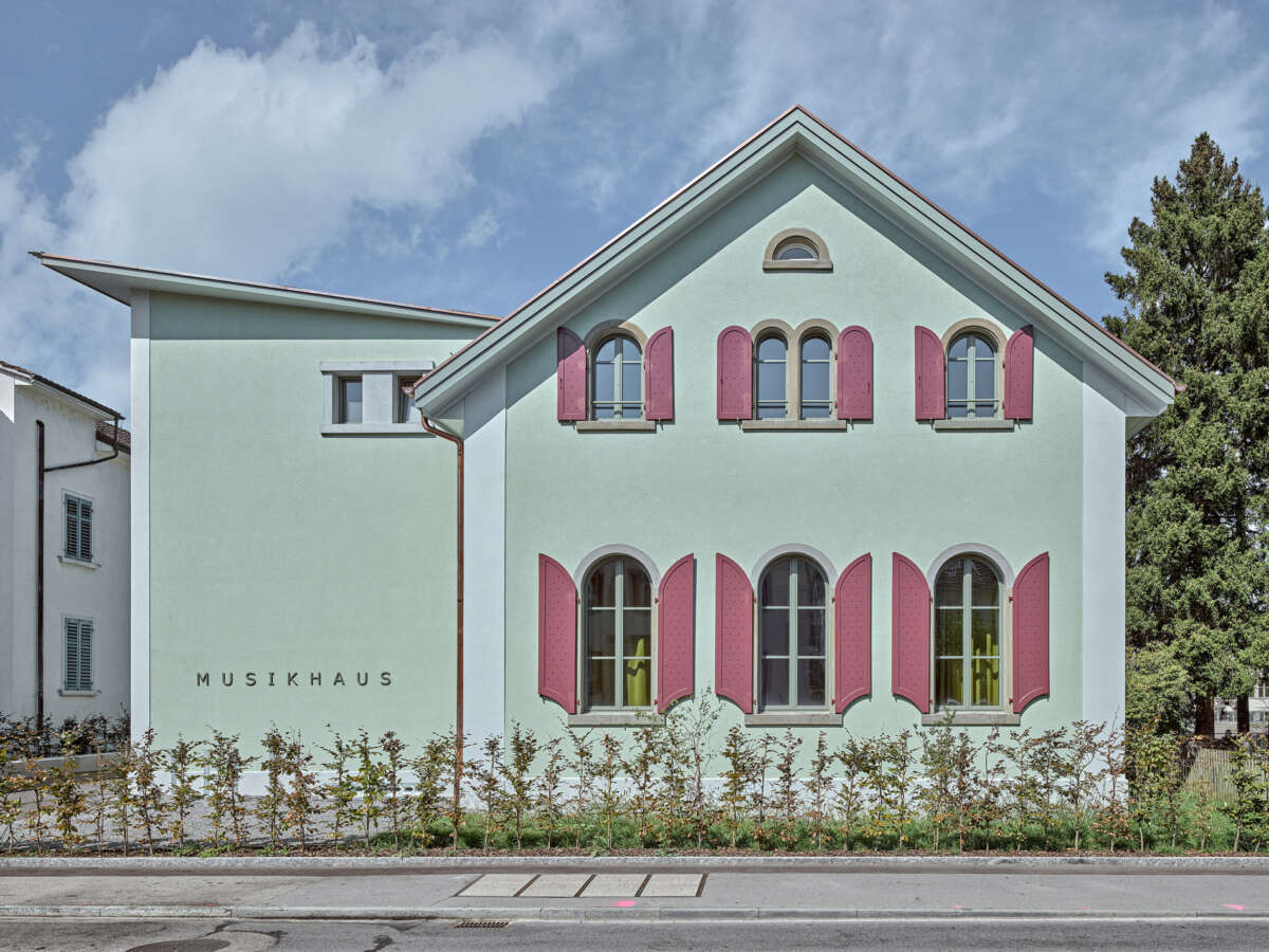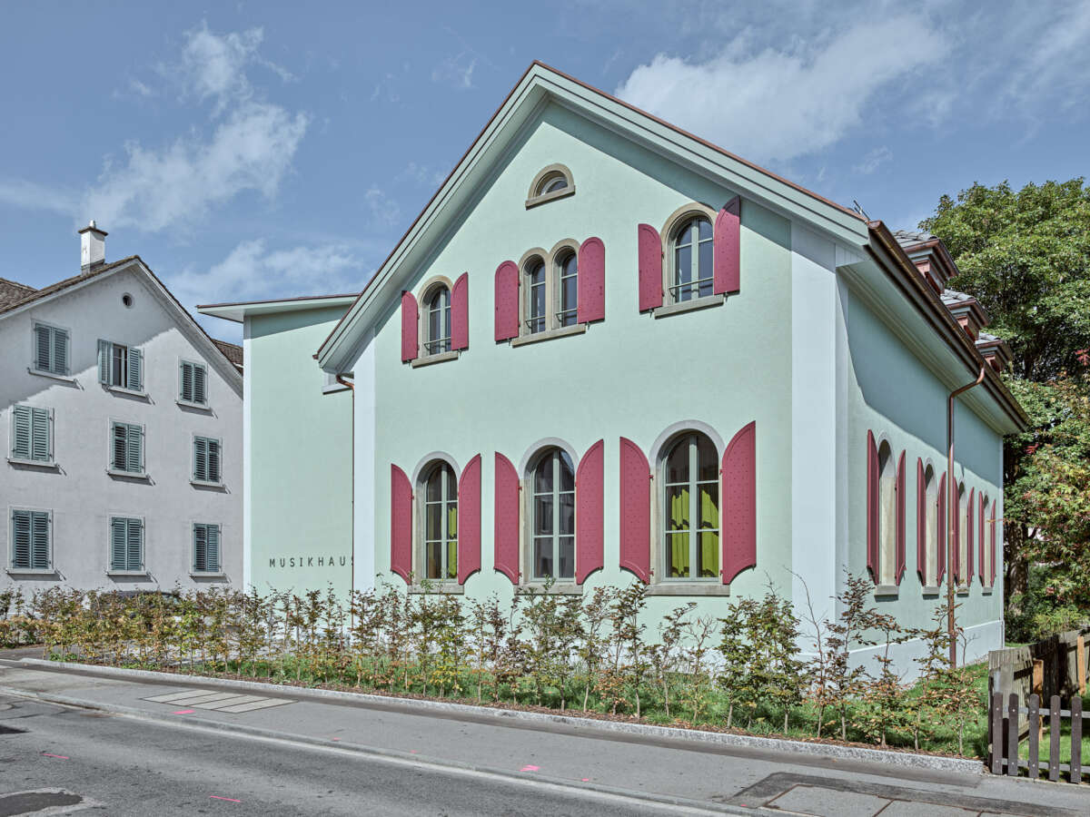 Angrenzend an die Schulanlage Kronenwiese hat eine Kapelle aus dem Jahre 1900 ein neues Gesicht erhalten. Bereits 1905 in einen Kindergarten transformiert, erfuhr das Gotteshaus über die letzten 120 Jahre ein Konglomerat von An- und Umbauten. Diese hingen wie Trauben an der Westfassade und verliehen ihm einen äusserst profanen Ausdruck. Ebenso liessen der einst hohe Kapellraum – der 1929 einem Zwischengeschoss zum Opfer fiel – wie auch die gekappten Rundbogenfenster längst keine sakrale Stimmung mehr aufkommen. Mittels Wettbewerbs wurde ein Architekturpartner gesucht, um die örtliche Musikschule künftig unter einem Dach zu vereinen.