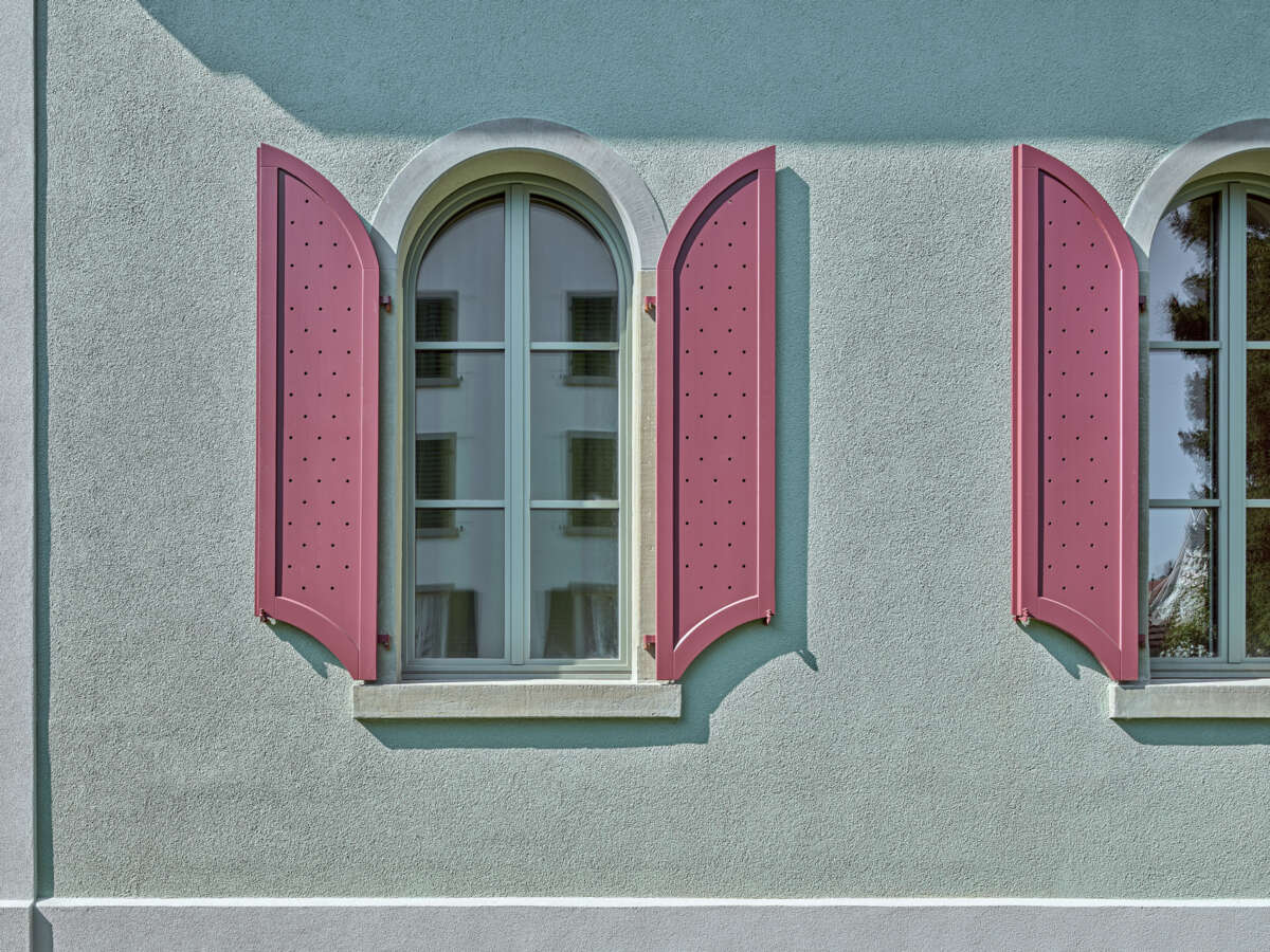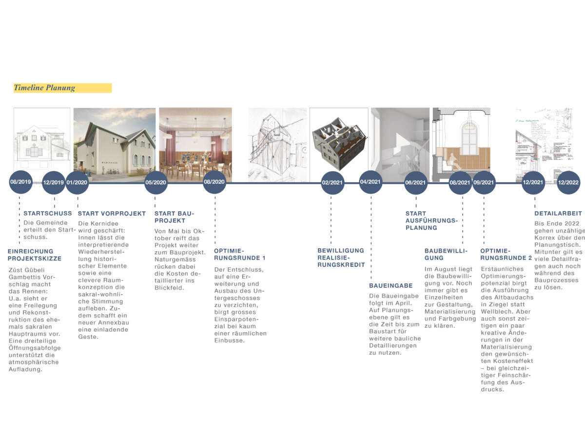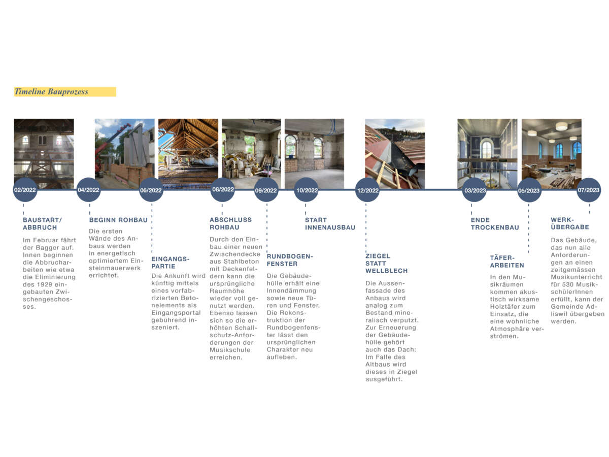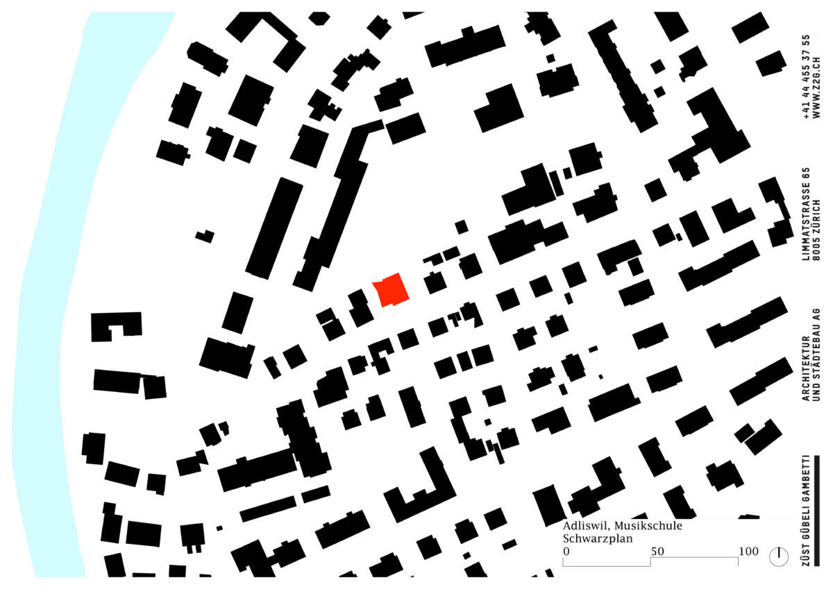 Angrenzend an die Schulanlage Kronenwiese hat eine Kapelle aus dem Jahre 1900 ein neues Gesicht erhalten. Bereits 1905 in einen Kindergarten transformiert, erfuhr das Gotteshaus über die letzten 120 Jahre ein Konglomerat von An- und Umbauten. Diese hingen wie Trauben an der Westfassade und verliehen ihm einen äusserst profanen Ausdruck. Ebenso liessen der einst hohe Kapellraum – der 1929 einem Zwischengeschoss zum Opfer fiel – wie auch die gekappten Rundbogenfenster längst keine sakrale Stimmung mehr aufkommen. Mittels Wettbewerbs wurde ein Architekturpartner gesucht, um die örtliche Musikschule künftig unter einem Dach zu vereinen.