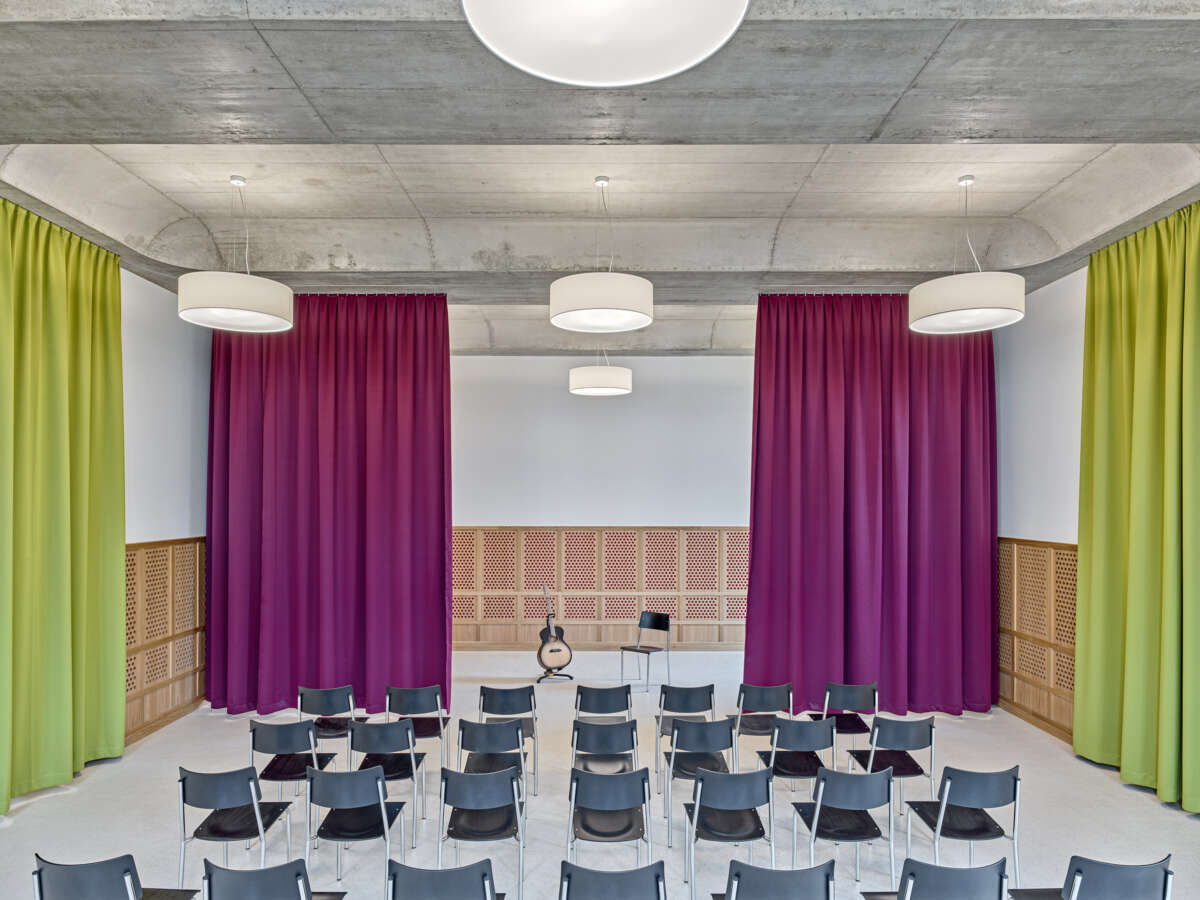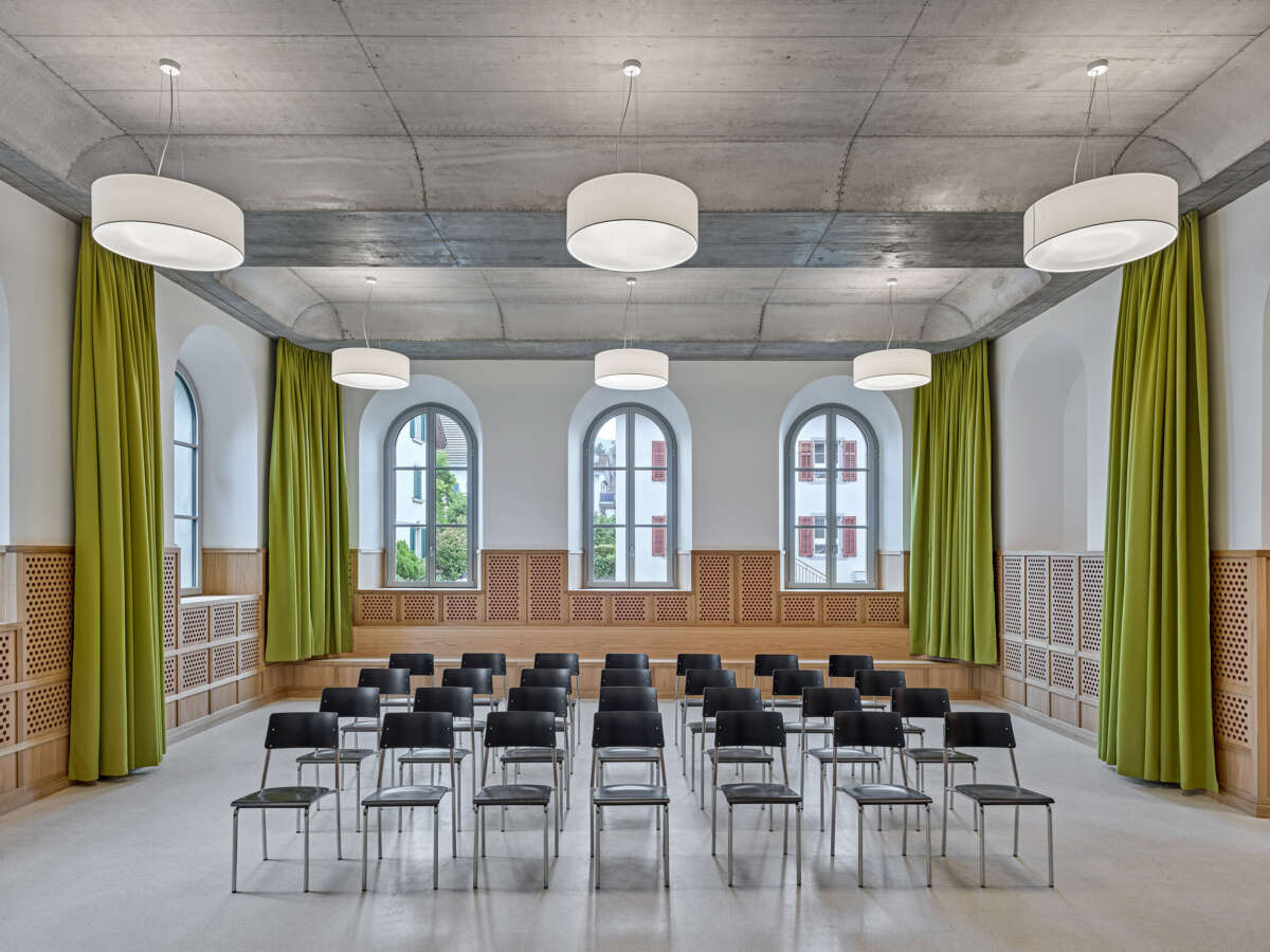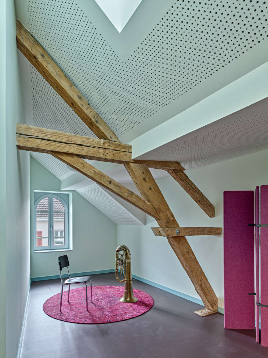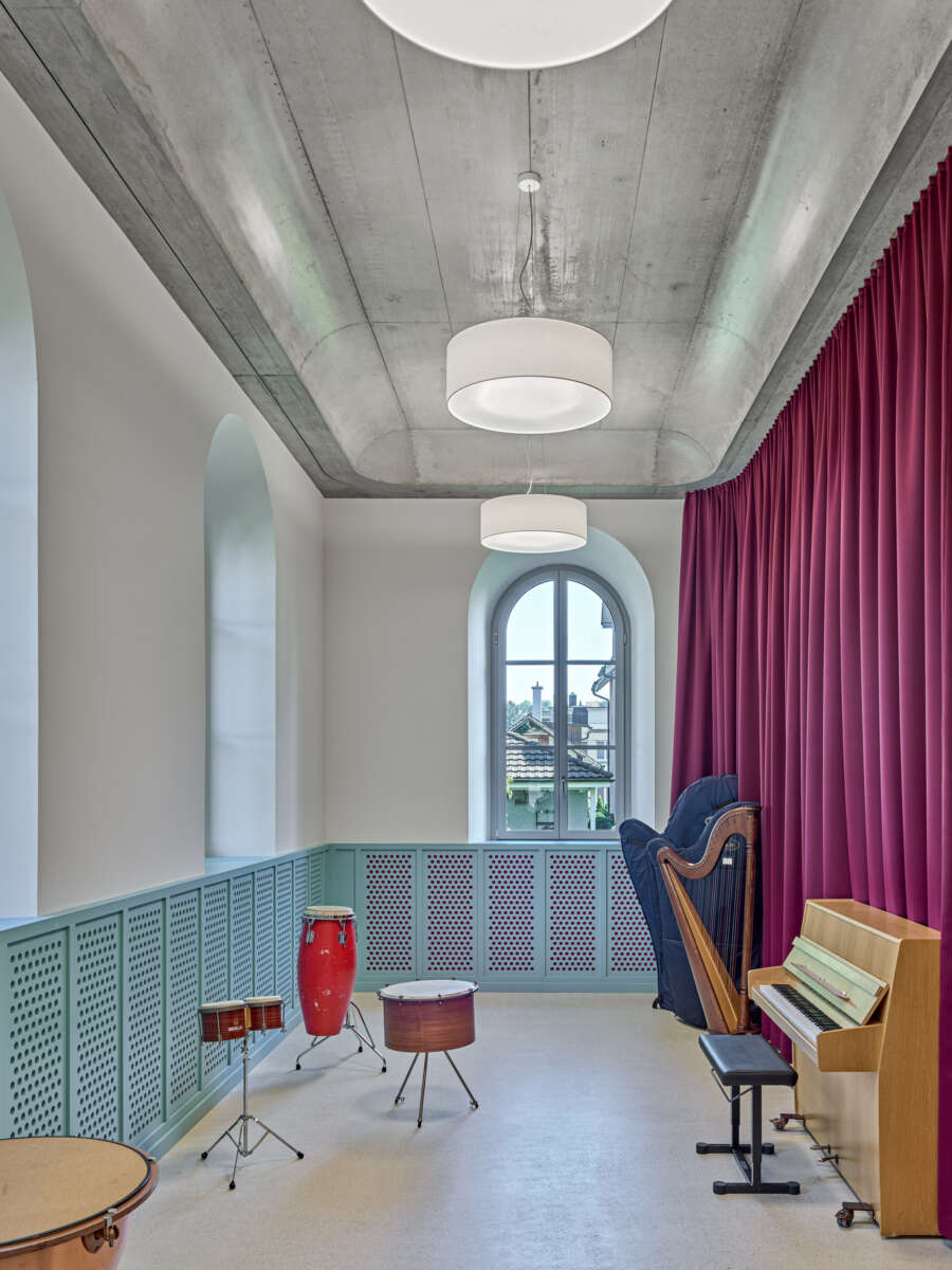 Innen setzt sich die starke Geometrie fort, woraus sich teils frappierende Details ergeben: Die Räume im Obergeschoss erreicht man über eine skulptural inszenierte Treppe. Dreh- und Angelpunkt ist ein zentraler Raum, um den sich das Unterrichtsleben kaleidoskopisch dreht. Trotz gewisser Dramatik wirken die sechs Kabinette intim – ihre Dachschrägen und schiefzulaufenden Wände sind der Akustikverbesserung geschuldet und haben etwas Beschützendes. Herzstück der einstigen Kapelle bleibt der von Bausünden befreite Musiksaal im Erdgeschoss, wo rekonstruierte Rundbogenfenster, neue Deckengewölbe, Holztäfer sowie raumhohe Vorhänge eine wohnlich-heitere Atmosphäre versprühen. (mc)