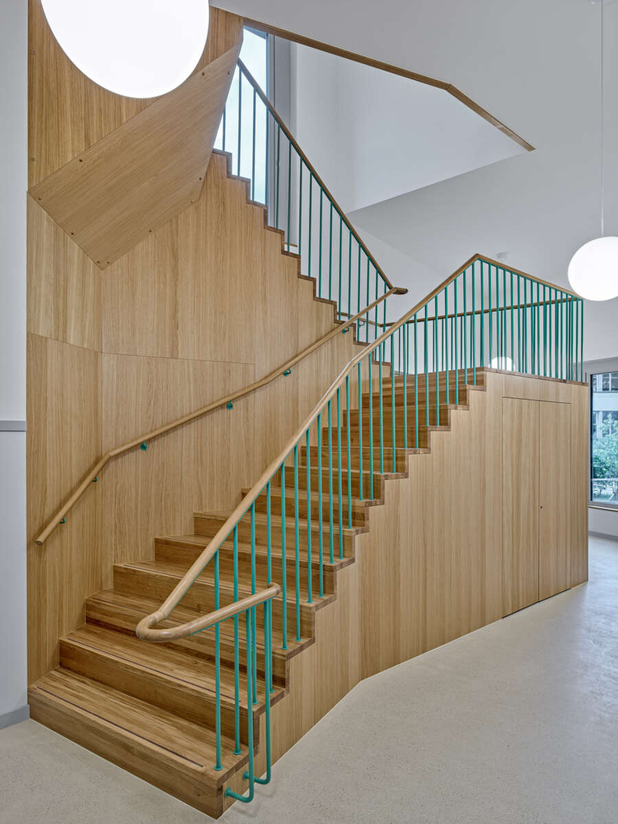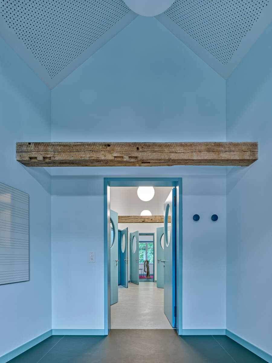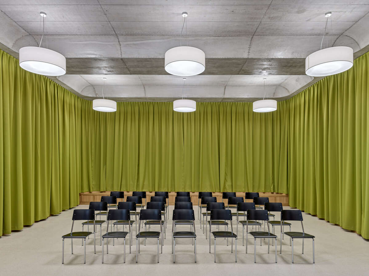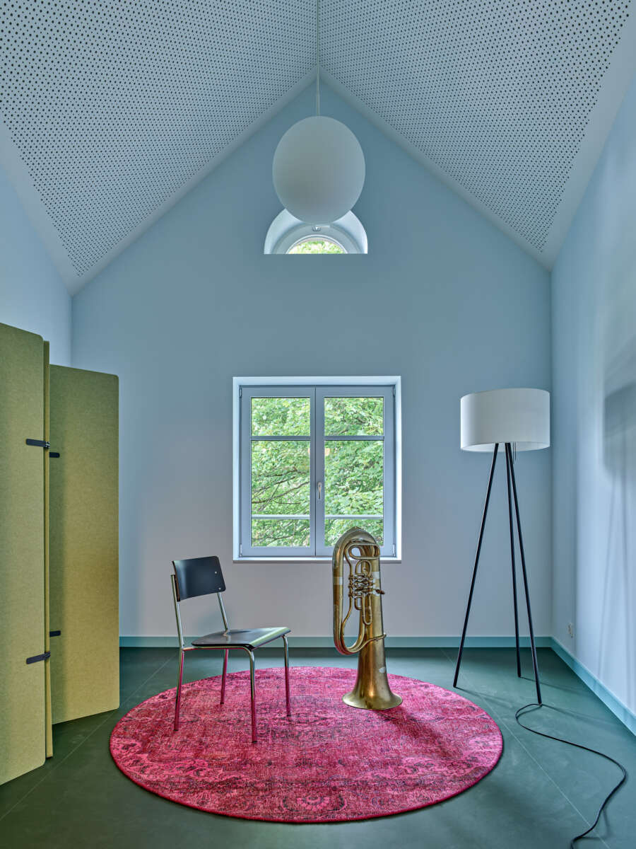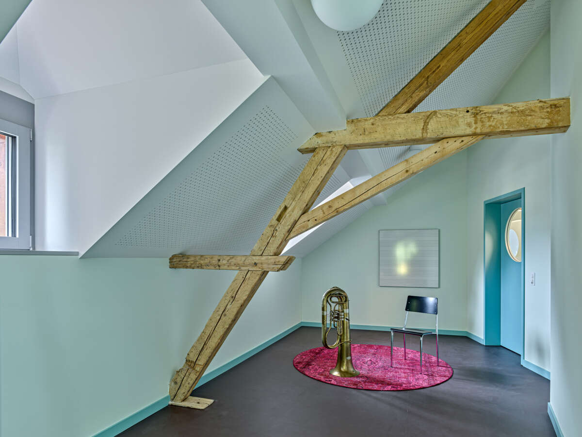Innen setzt sich die starke Geometrie fort, woraus sich teils frappierende Details ergeben: Die Räume im Obergeschoss erreicht man über eine skulptural inszenierte Treppe. Dreh- und Angelpunkt ist ein zentraler Raum, um den sich das Unterrichtsleben kaleidoskopisch dreht. Trotz gewisser Dramatik wirken die sechs Kabinette intim – ihre Dachschrägen und schiefzulaufenden Wände sind der Akustikverbesserung geschuldet und haben etwas Beschützendes. Herzstück der einstigen Kapelle bleibt der von Bausünden befreite Musiksaal im Erdgeschoss, wo rekonstruierte Rundbogenfenster, neue Deckengewölbe, Holztäfer sowie raumhohe Vorhänge eine wohnlich-heitere Atmosphäre versprühen. (mc)