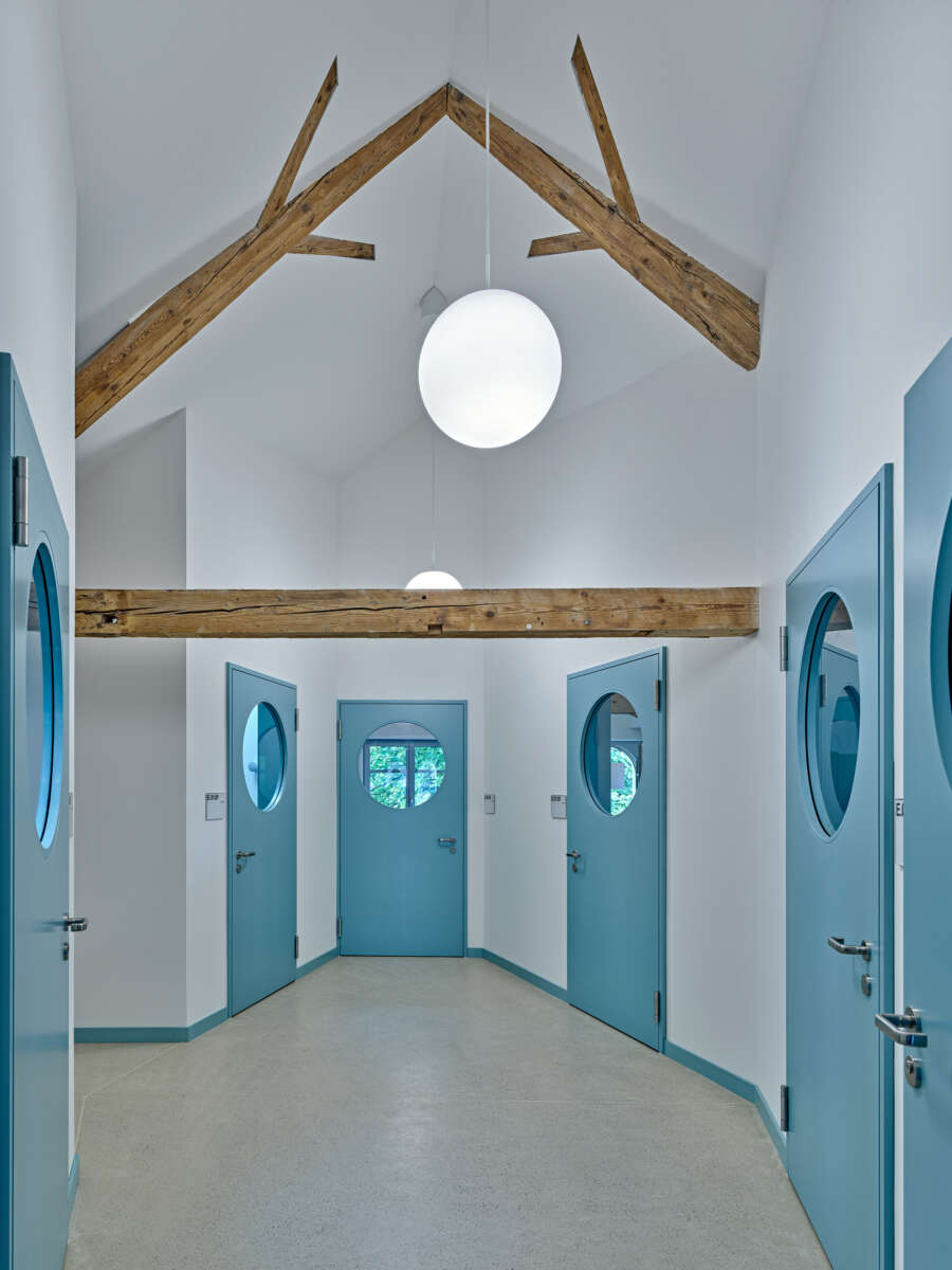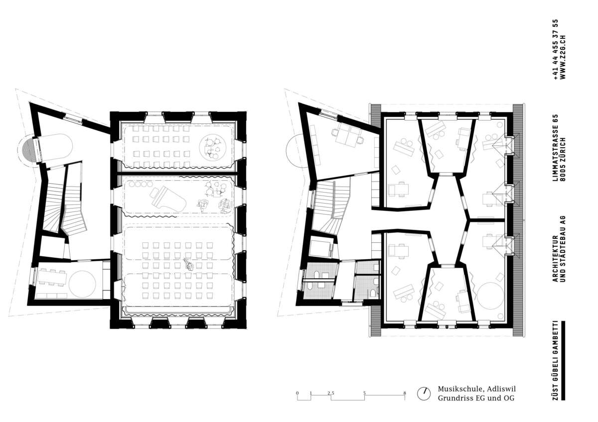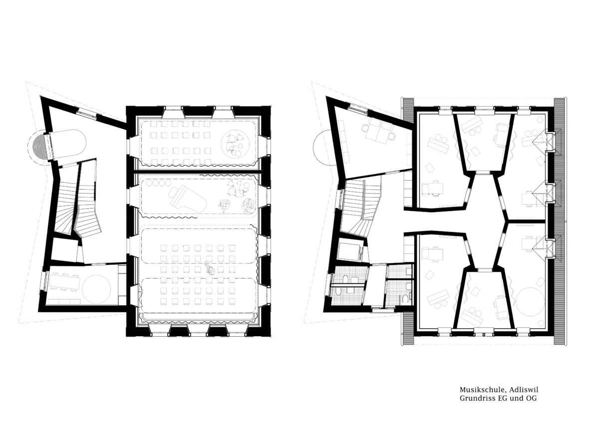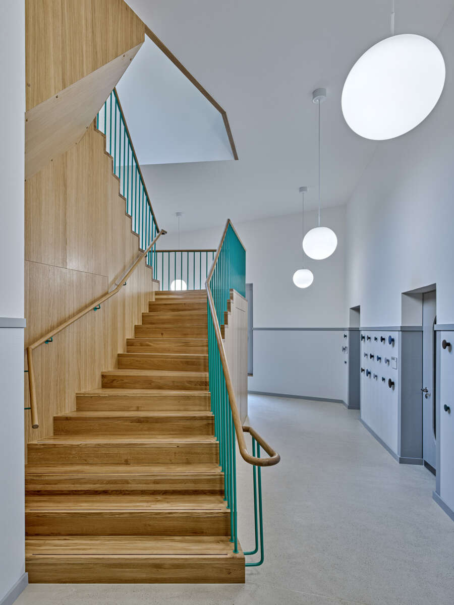 Innen setzt sich die starke Geometrie fort, woraus sich teils frappierende Details ergeben: Die Räume im Obergeschoss erreicht man über eine skulptural inszenierte Treppe. Dreh- und Angelpunkt ist ein zentraler Raum, um den sich das Unterrichtsleben kaleidoskopisch dreht. Trotz gewisser Dramatik wirken die sechs Kabinette intim – ihre Dachschrägen und schiefzulaufenden Wände sind der Akustikverbesserung geschuldet und haben etwas Beschützendes. Herzstück der einstigen Kapelle bleibt der von Bausünden befreite Musiksaal im Erdgeschoss, wo rekonstruierte Rundbogenfenster, neue Deckengewölbe, Holztäfer sowie raumhohe Vorhänge eine wohnlich-heitere Atmosphäre versprühen. (mc)