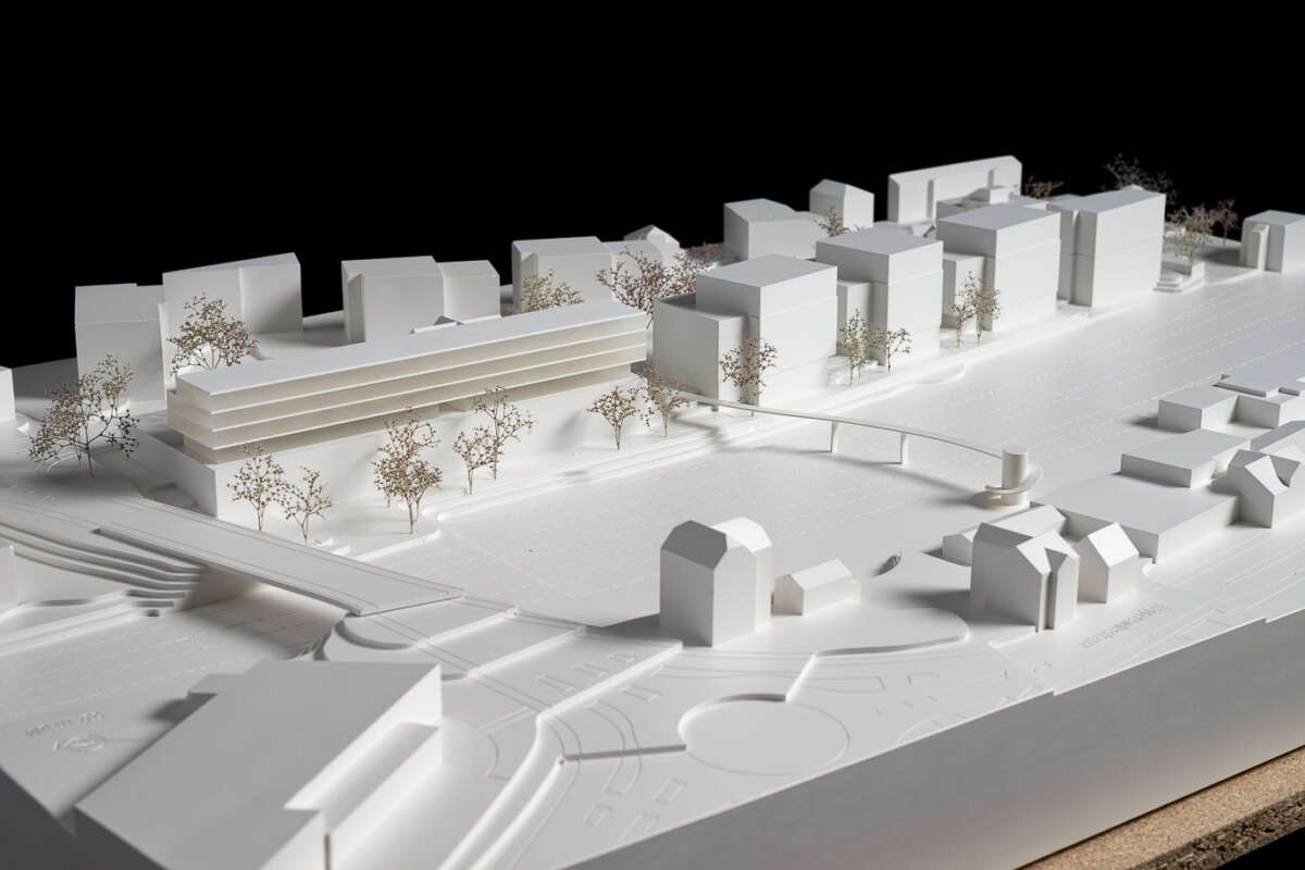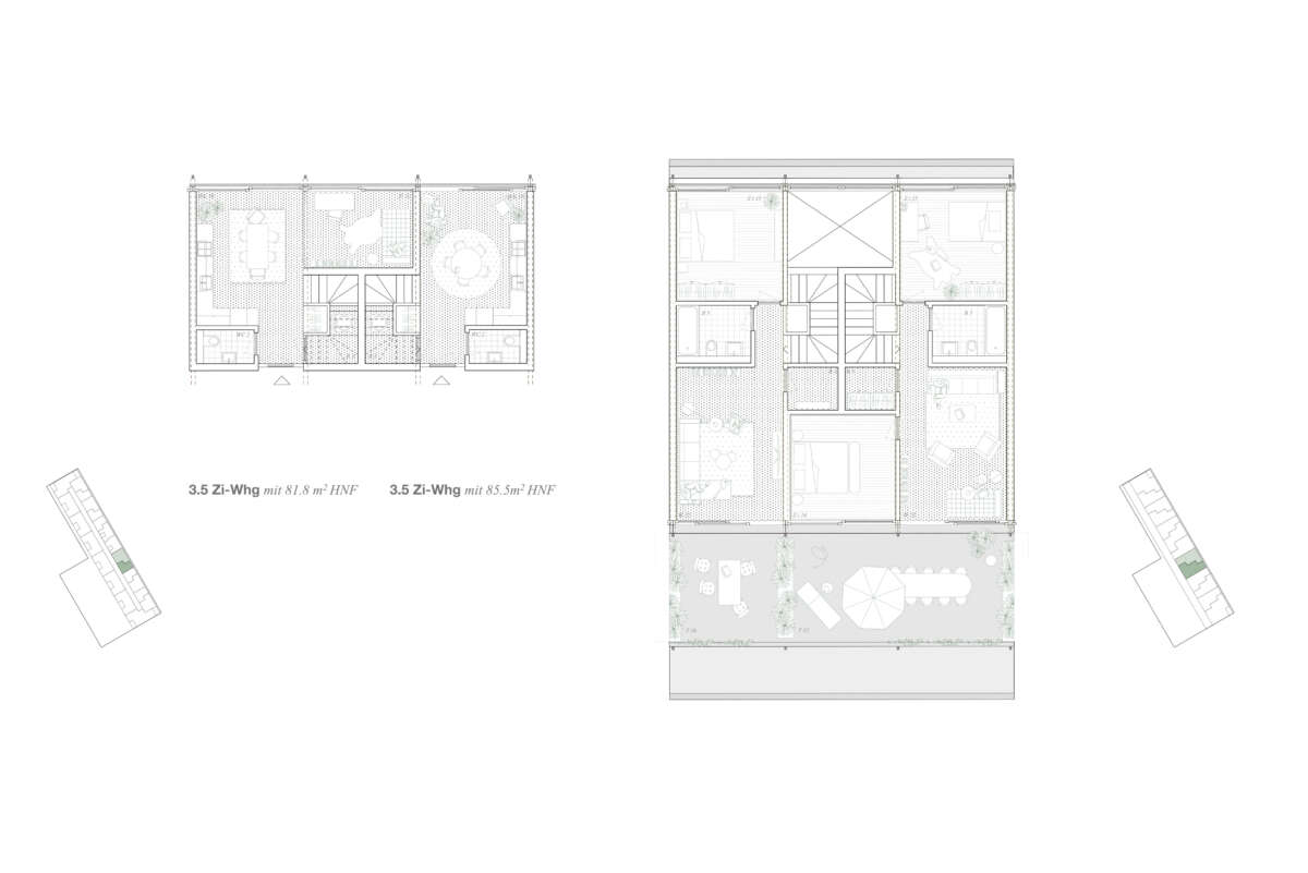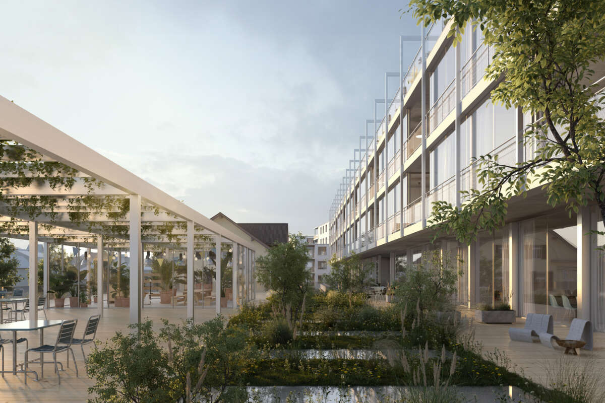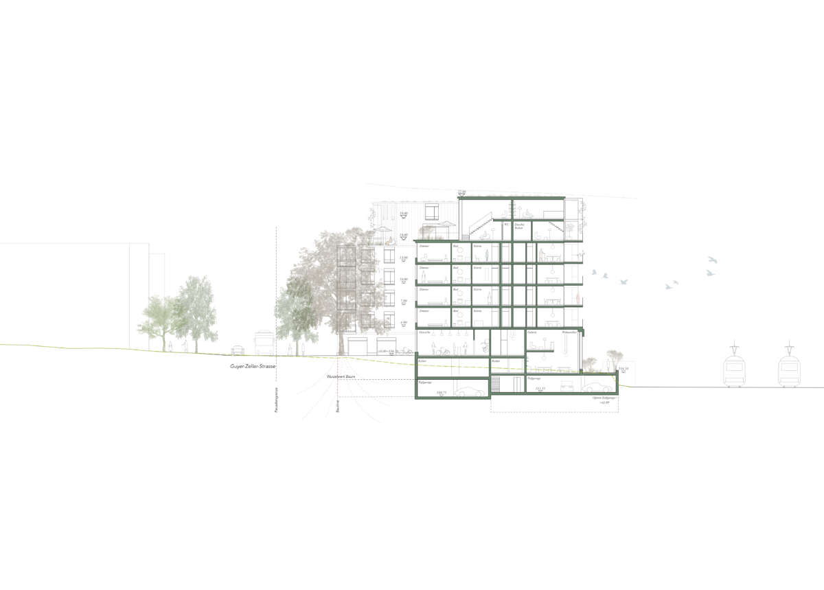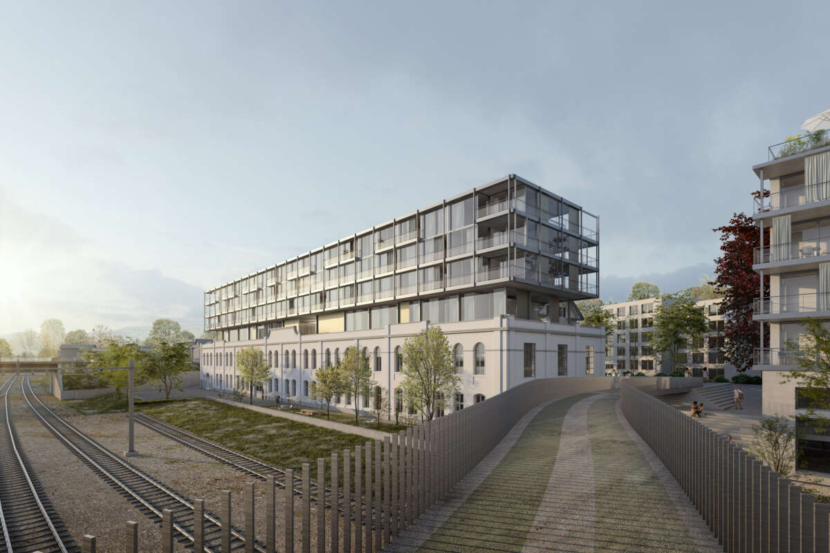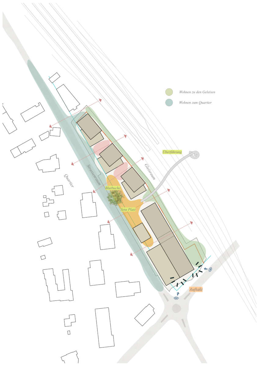 Die Fabrikaufstockung erfolgt als Holzbau. Eine Rue intérieure schafft Effizienz und Wohnvielfalt, wobei Bewohner auch von einem Dachgarten auf dem alten Fabrikdach profitieren. Von aussen kontrastiert der Bau in filigraner Metalloptik mit seinem massiven Träger. Sodann macht eine Passerelle den Brückenschlag über die Geleise – ausgehend vom neuen Seta-Platz, der die Buche inszeniert und eine Sitztreppe anbietet. Die drei allseits zugewandten Wohnbauten offerieren gute Besonnung und Weitsicht. Innen trägt die Geometrie zum speziellen Wohnungsmix bei. Im akzentuierten Sockel suchen flexible Ateliers mit Galerie die Strasse zu beleben. Sie setzen der Öffentlichkeit ein robustes Antlitz entgegen.