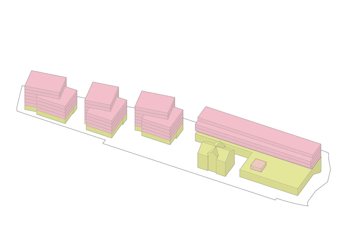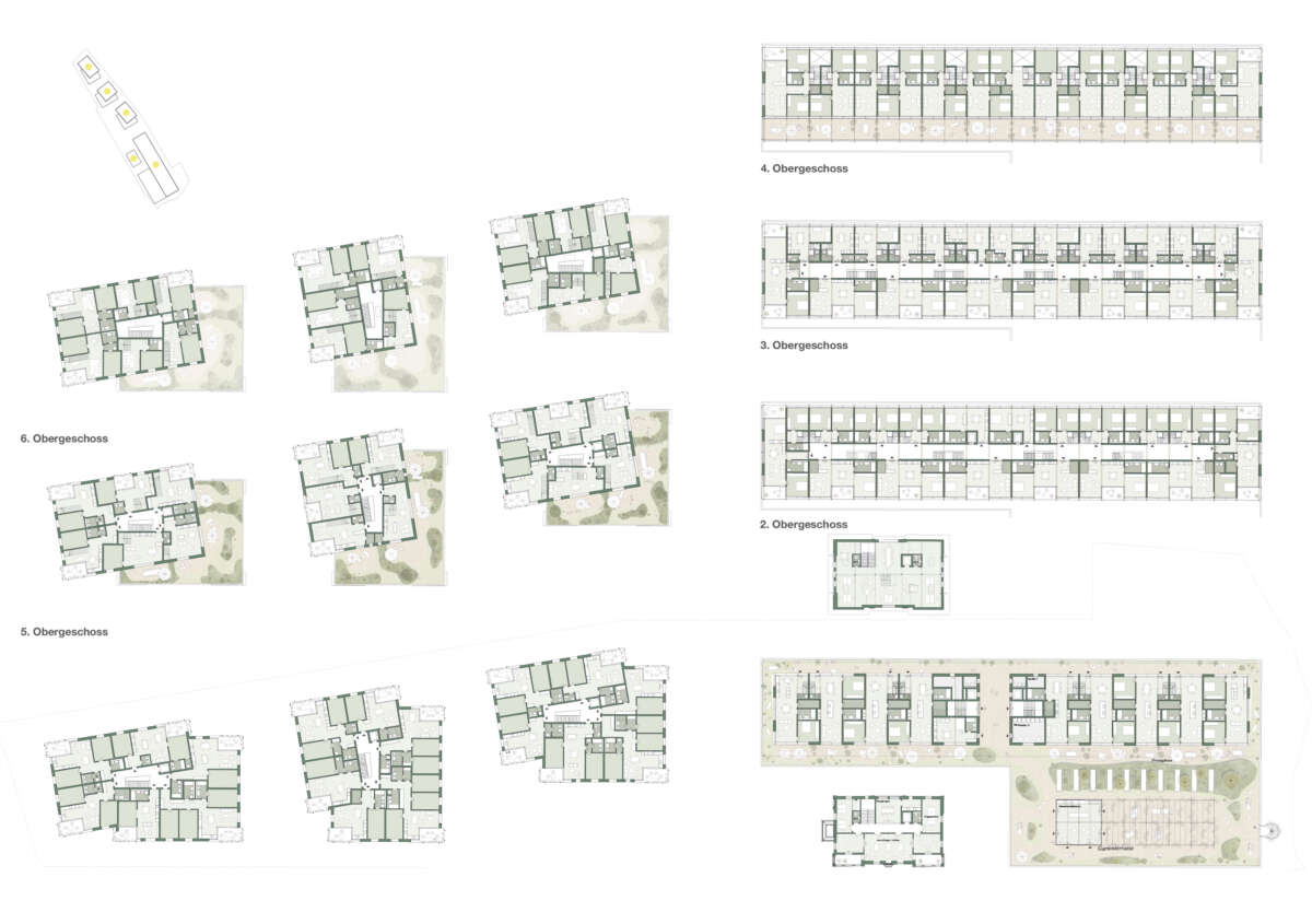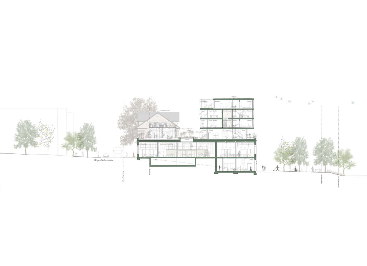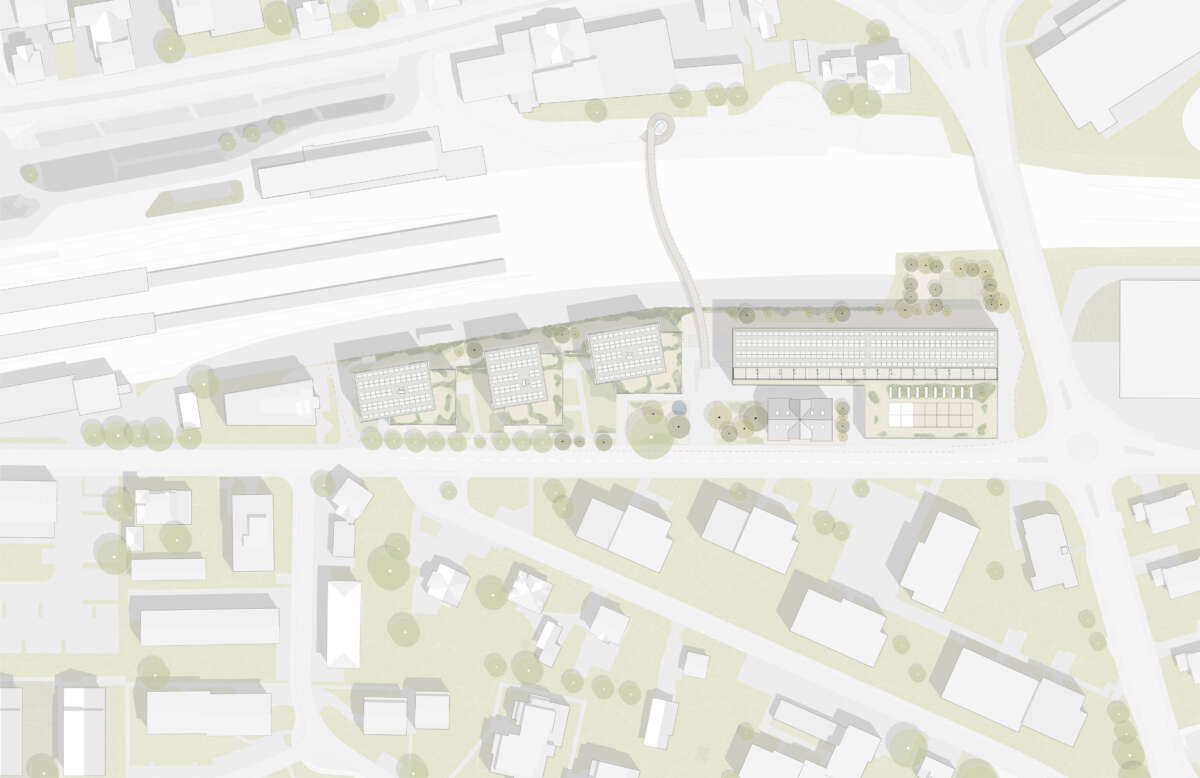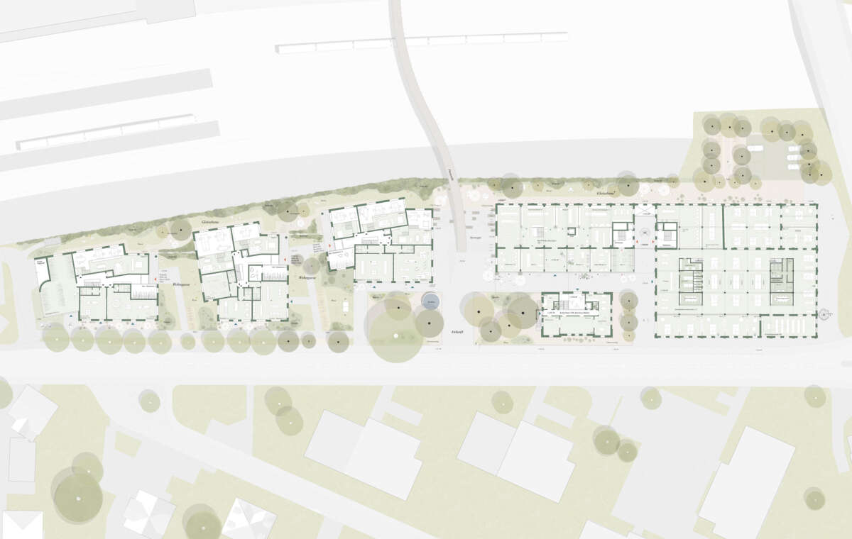 Der städtebauliche Entwurf zeigt sich als stimmiges Ensemble. Die Fabrikhallen werden gleisseits mit einem viergeschossigen Riegel aufgestockt, der auch als «Kopf» wirkt. Der wohlkalkulierte Abbruch einiger Erweiterungen spielt die Villa frei und schafft Raum. Im Anschluss nutzen drei Punktbauten die Grundstückstiefe. Ihre Vermählung verschiedener Geometrien sorgt für eine Höhenstaffelung, die zwischen Gleis- und Stadtraum vermittelt. Ebenso entsteht eine angemessene Porosität. Kurzum, der Entwurf extrahiert, schärft und kombiniert bestehende mit neuen Qualitäten und schafft so einen Ort, an dem Fabrik, Villa und Blutbuche ein identitätsstiftendes Trio bilden. Und ebenso garantiert er vielseitige Aussenräume und Wohnerlebnisse.