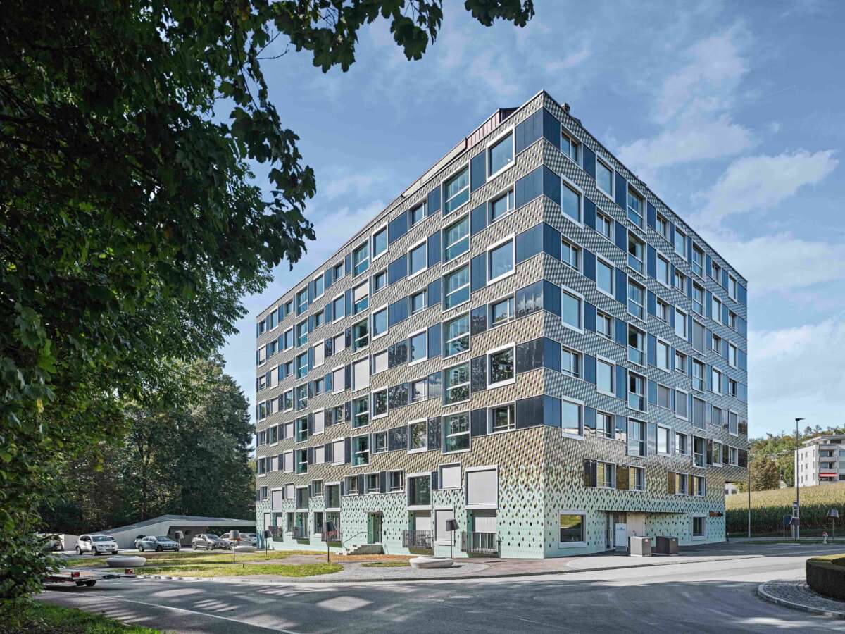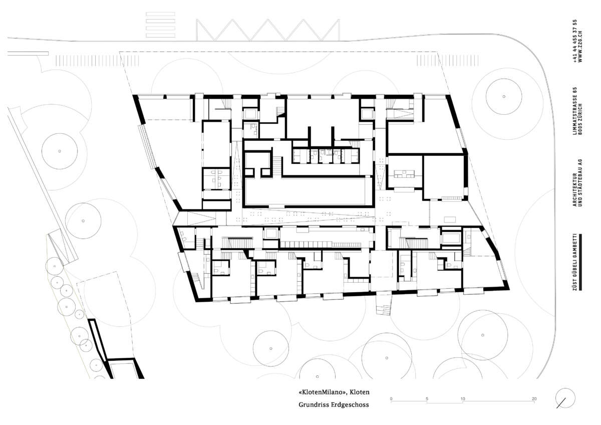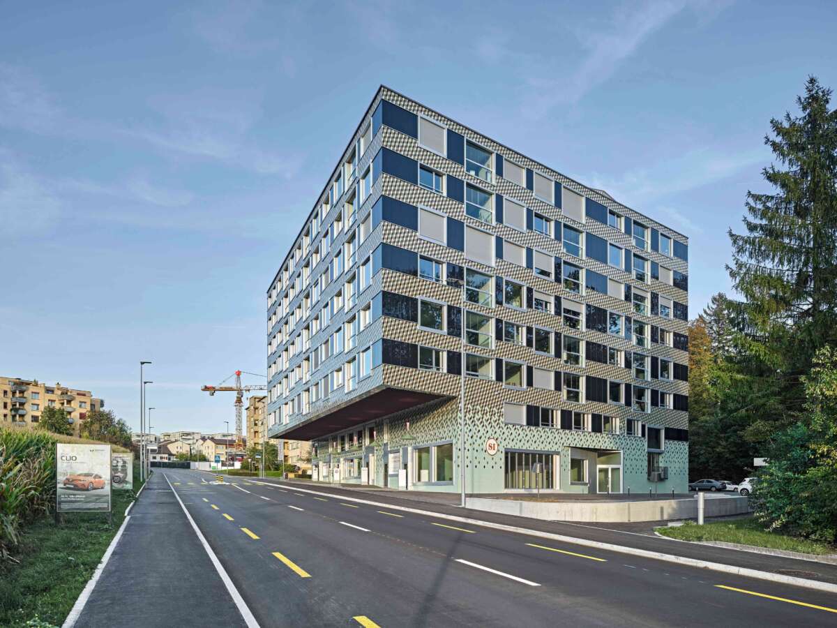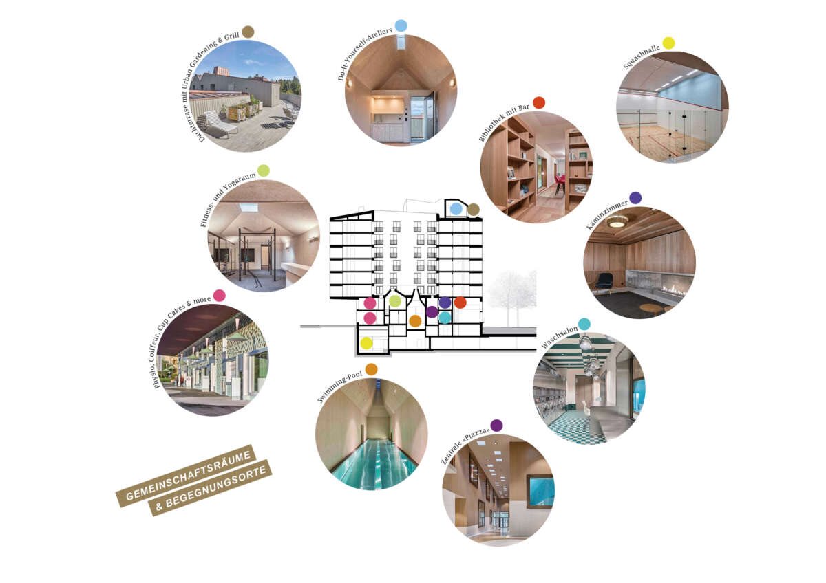 Auf acht Etagen wird hier nicht nur gewohnt und gearbeitet, sondern auch geschwommen, Fitness betrieben, Squash gespielt, gemeinsam gewaschen, gelesen und das Dach zum Relaxen, Handwerkern, Grillieren oder kollektiven Gärtnern genutzt. Mit seinen vielen Gemeinschaftsräumen und Begegnungszonen bietet der kompakte, auf Ökologie getrimmte Nutzungsstapel nicht nur erhebliche bauliche, sondern auch funktionale Verdichtung. Das Prinzip des Miteinanders war im Übrigen auch für seinen siebenjährigen Entstehungsprozess bezeichnend. KlotenMilano ist im engen Austausch mit einem innovativen Bauherrn und der Stadt Kloten entstanden. (mc)