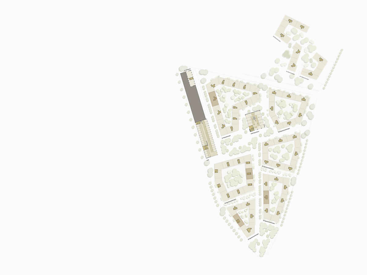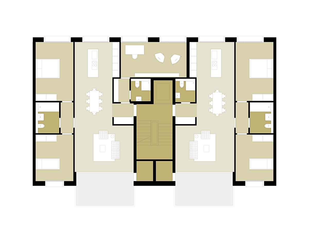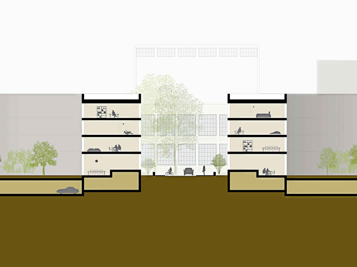 Ein wichtiger Punkt für die Wohnnutzungen ist die Adressbildung. Sie geschieht über die städtebauliche Anlage und in zweiter Linie über den spezifischen Innenraum des Blockrandes. Im Erdgeschoss werden – je nach Lage im Stadtkörper – Gewerbe, Wohnateliers oder Hochparterrewohnen angeboten.