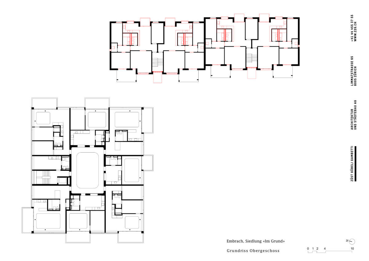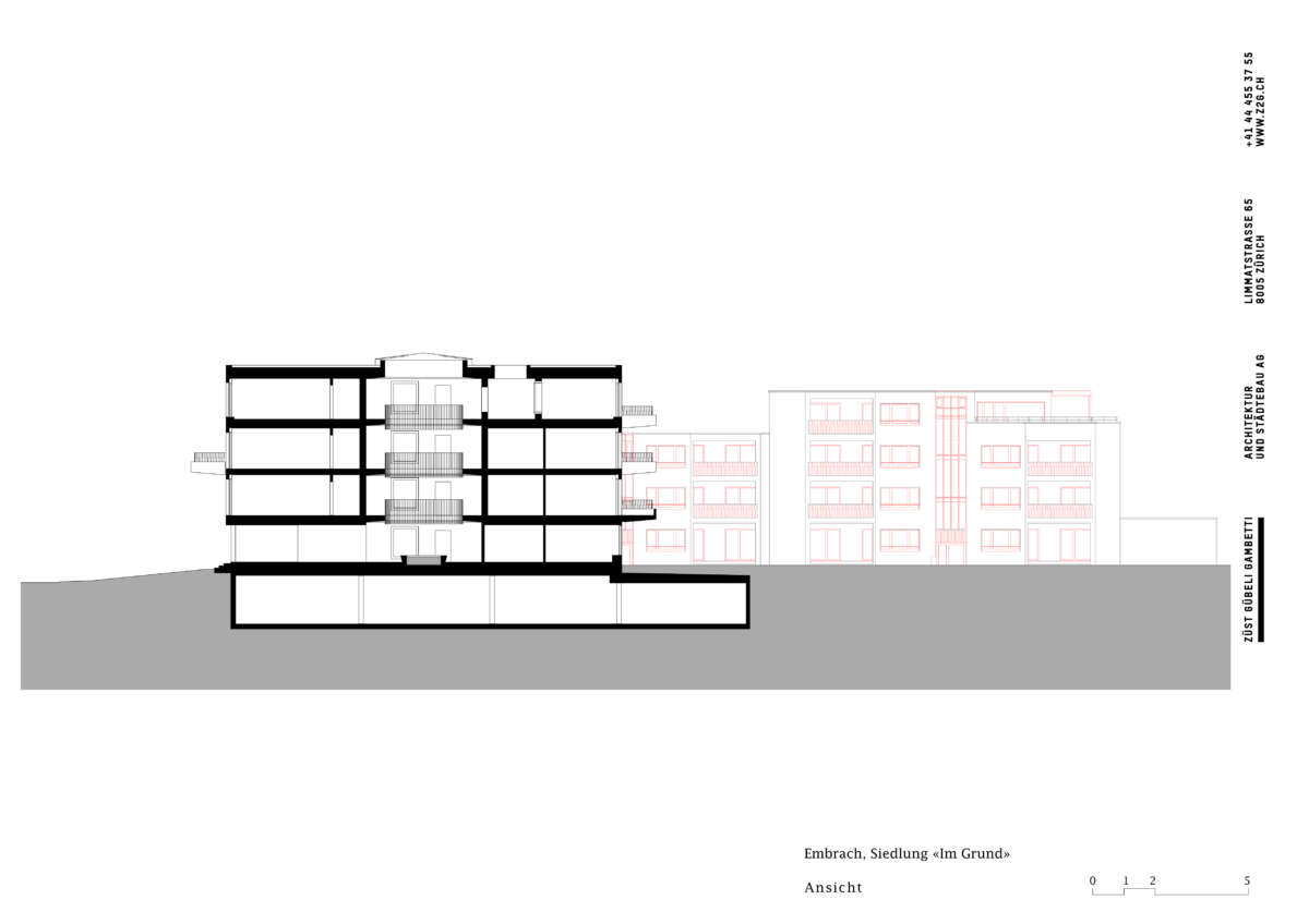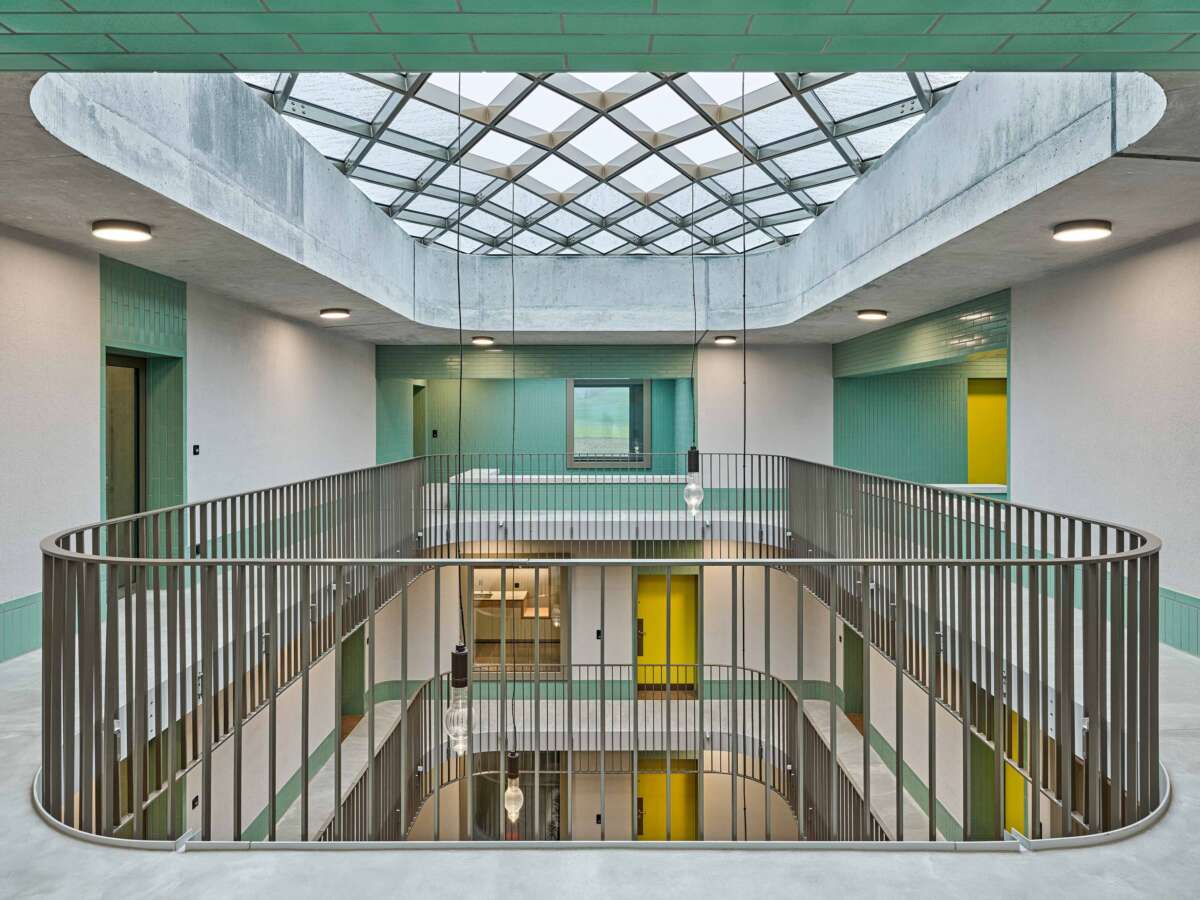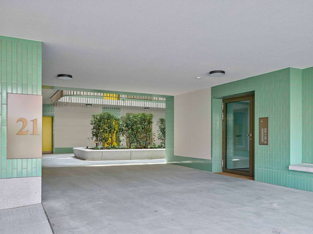 Bereits mit wenigen Eingriffen an den Eingangsfronten der Bestandszeilen wird das Versprechen eingelöst: Neu gibt es kein Vorne oder Hinten mehr und auch das Abstandsgrün ist einem Gemeinschaftshof gewichen. An den Enden setzen zwei Ersatzneubauten je einen Punkt: Mit Kleinwohnungen und Lift bestückt, ergänzen sie das Wohnangebot. Je ein Betonpfeiler – elementar und verfeinert zugleich – schultert die neuen Häuser. Darüber betonen geschuppte Brüstungsbänder und ausgreifende Balkone allseitige Zugewandtheit. In ihrem Innern wirkt ein Atrium – gekleidet in heitere Farbigkeit und mit Durchblicken in die Wohnungen – als kommunikatives Bindeglied zwischen den Sphären.