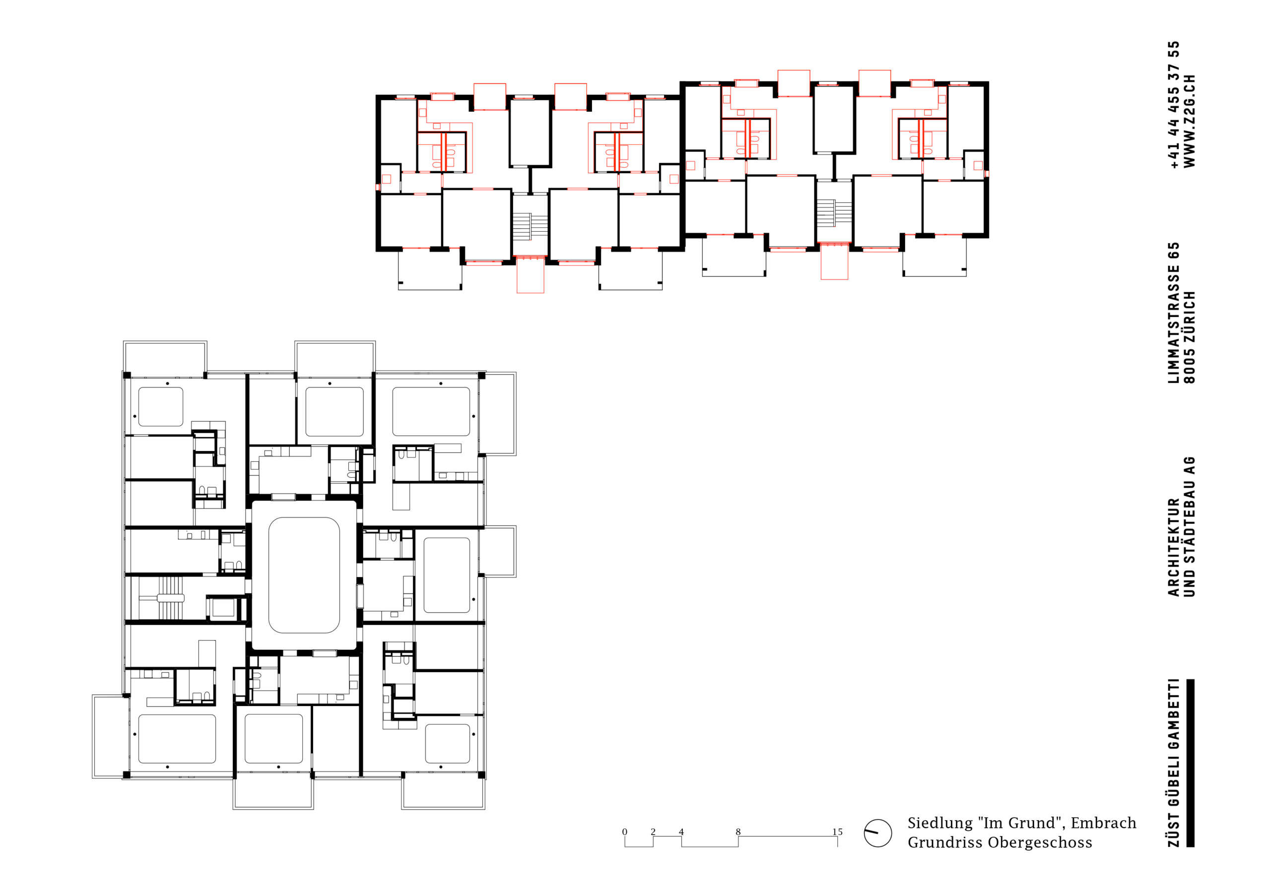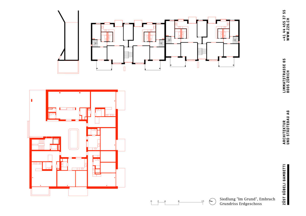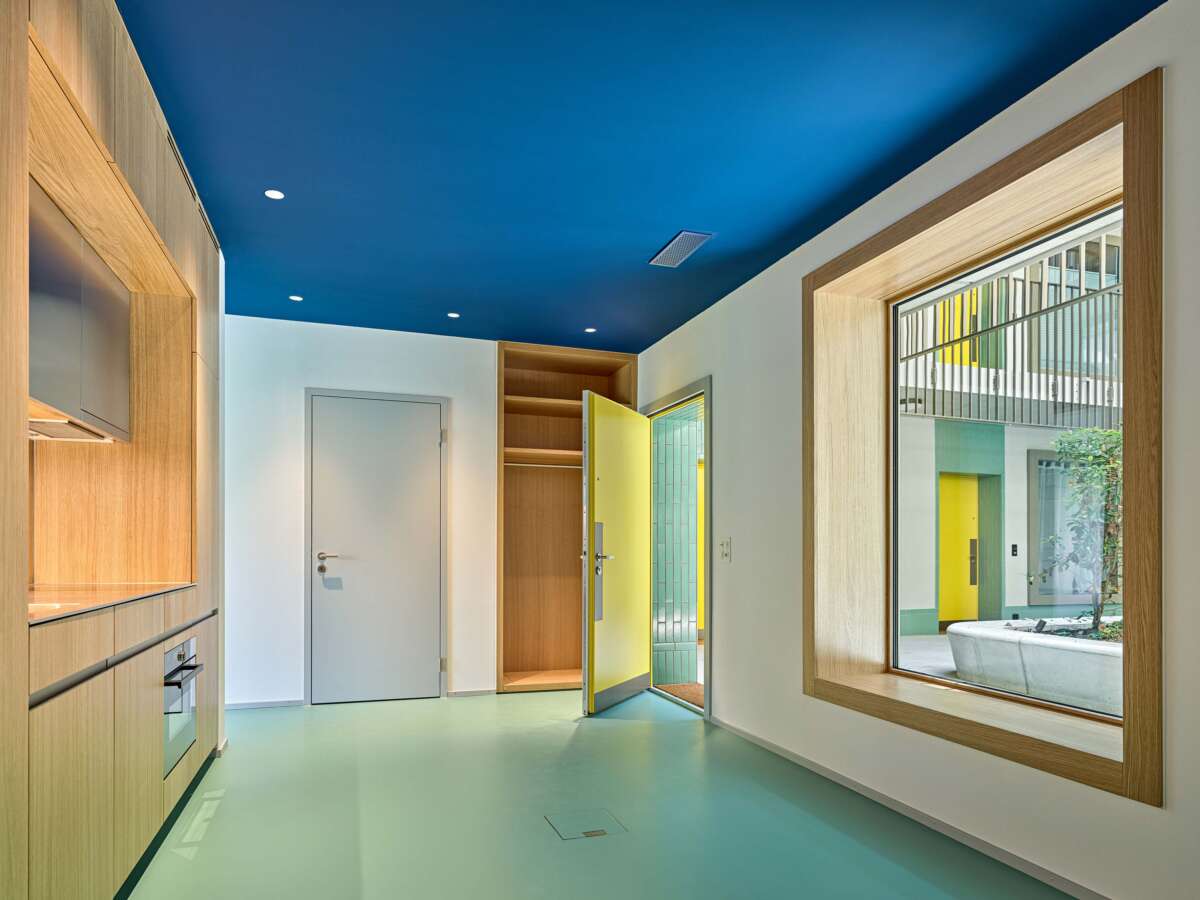 Bereits mit wenigen Eingriffen an den Eingangsfronten der Bestandszeilen wird das Versprechen eingelöst: Neu gibt es kein Vorne oder Hinten mehr und auch das Abstandsgrün ist einem Gemeinschaftshof gewichen. An den Enden setzen zwei Ersatzneubauten je einen Punkt: Mit Kleinwohnungen und Lift bestückt, ergänzen sie das Wohnangebot. Je ein Betonpfeiler – elementar und verfeinert zugleich – schultert die neuen Häuser. Darüber betonen geschuppte Brüstungsbänder und ausgreifende Balkone allseitige Zugewandtheit. In ihrem Innern wirkt ein Atrium – gekleidet in heitere Farbigkeit und mit Durchblicken in die Wohnungen – als kommunikatives Bindeglied zwischen den Sphären.