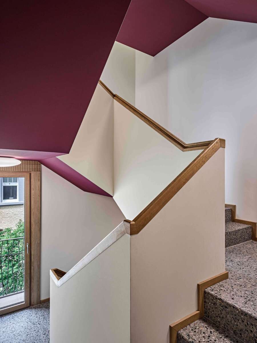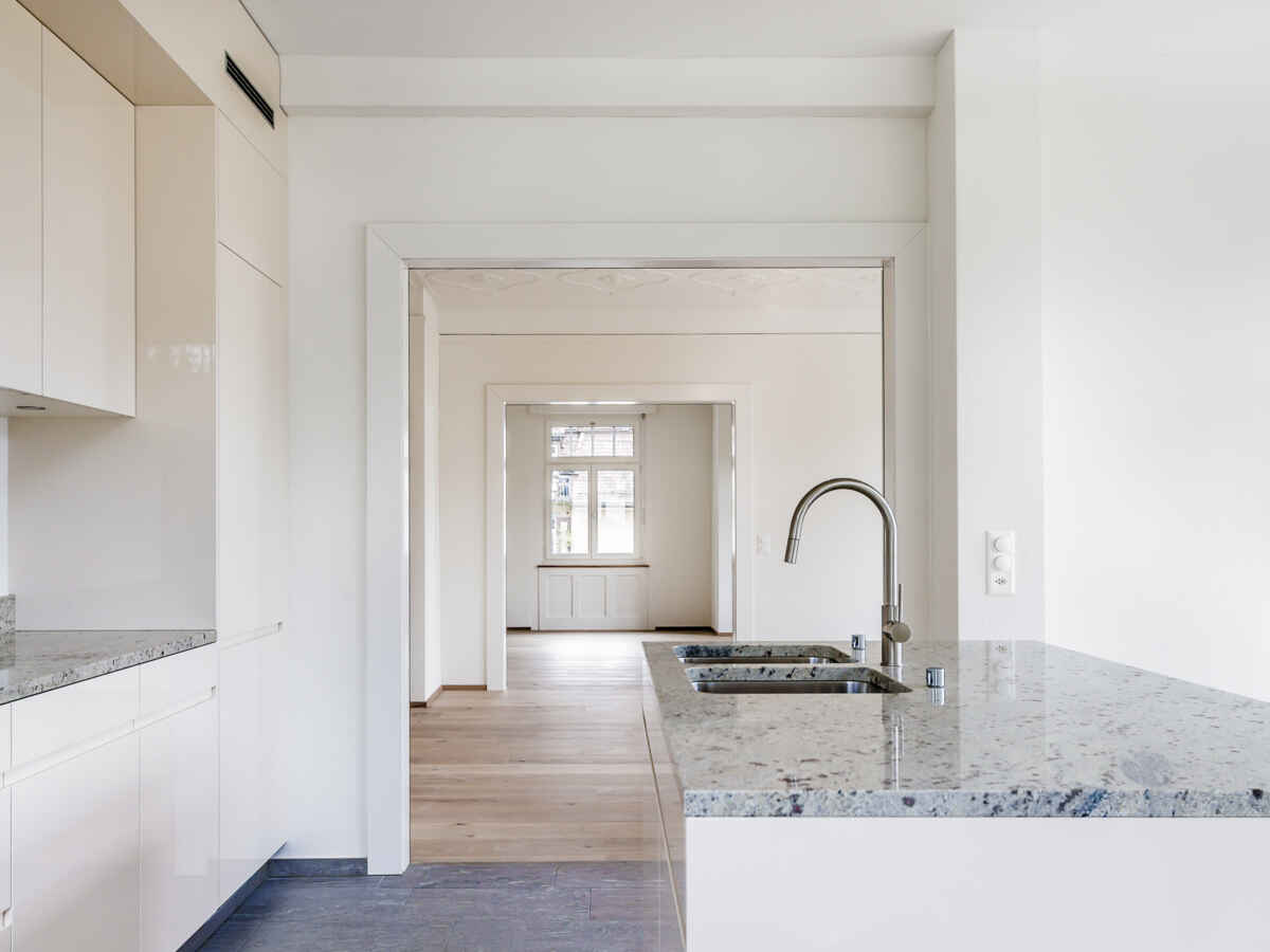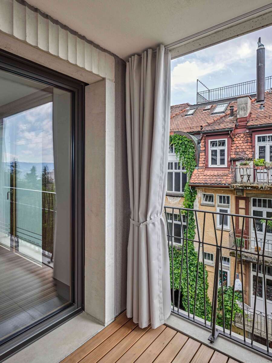 Auch sonst knüpft der Neubau an das Kammersystem gründerzeitlichen Wohnens an. Angedeutete Enfiladen, Durchblicke und Raumzugänge über die Diagonale bereichern die Wohnungen. Die Eckbalkone mit Vorhängen sind echte Raumerweiterungen und rufen Erinnerungen an die Veranden der Jahrhundertwende wach. Die Sorgfalt, die auf die Materialisierung verwendet wurde, ist auch bei der Altbausanierung zu spüren. Sie sollte das Exemplarische wieder sichtbar machen, ohne auf heutigen Komfort zu verzichten. An geeigneter Stelle wurde ein Lift eingebaut, während Täfer, Türen und Einbauten eine Auffrischung erfuhren. (mc)