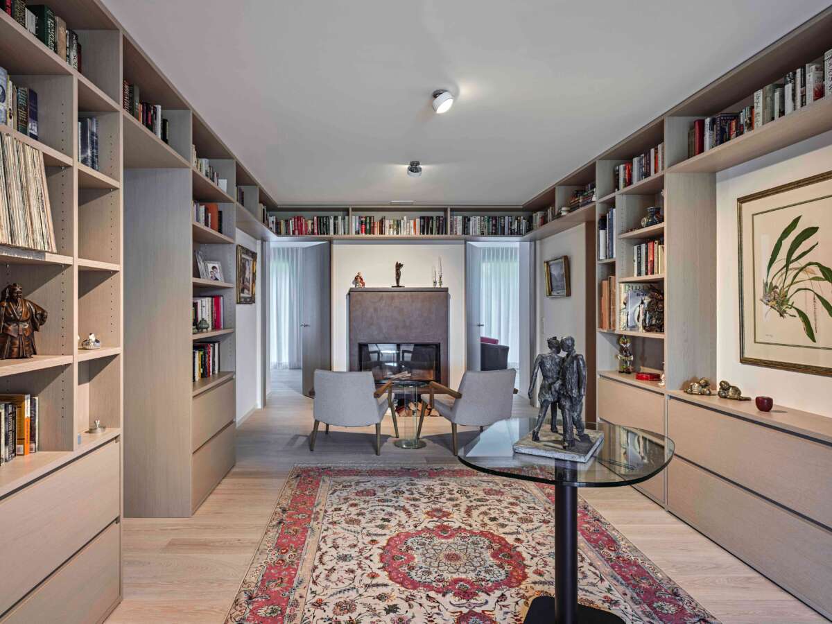 Mit seiner klassischen Dreiteilung, der feinen Detaillierung der Fassade sowie dem Spiel mit Mansardendach und Gauben wirkt der Neubau ganz selbstverständlich in das historische Umfeld eingearbeitet. Auf den zweiten Blick springen die französischen Fenster und vorgefertigten Betonelemente ins Auge. Sie gliedern die Fassade und paraphrasieren Gewände und Gesimse in zeitgenössischer Sprache. Auch das Innere ist eine Interpretation bürgerlicher Wohnkultur. Herzstück jeder Etagenwohnung ist eine zentrale Eingangshalle, die diesen Namen auch verdient: Mit 25 m2 und Kamin ausgestattet, übernimmt sie die Funktion eines eigentlichen Zimmers.