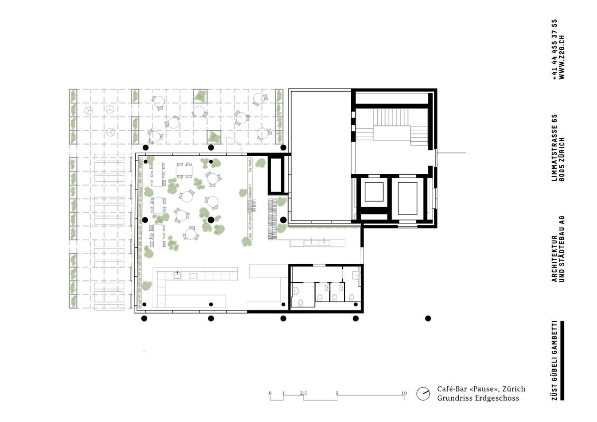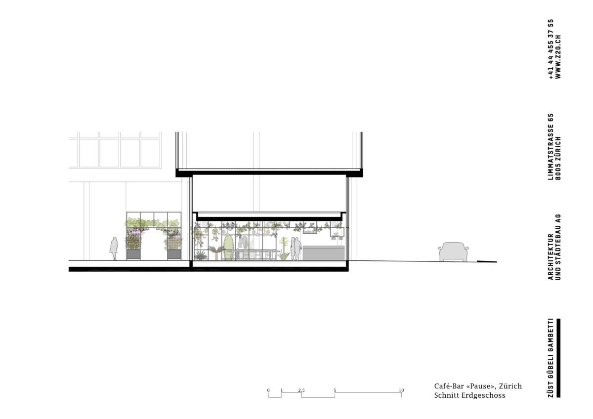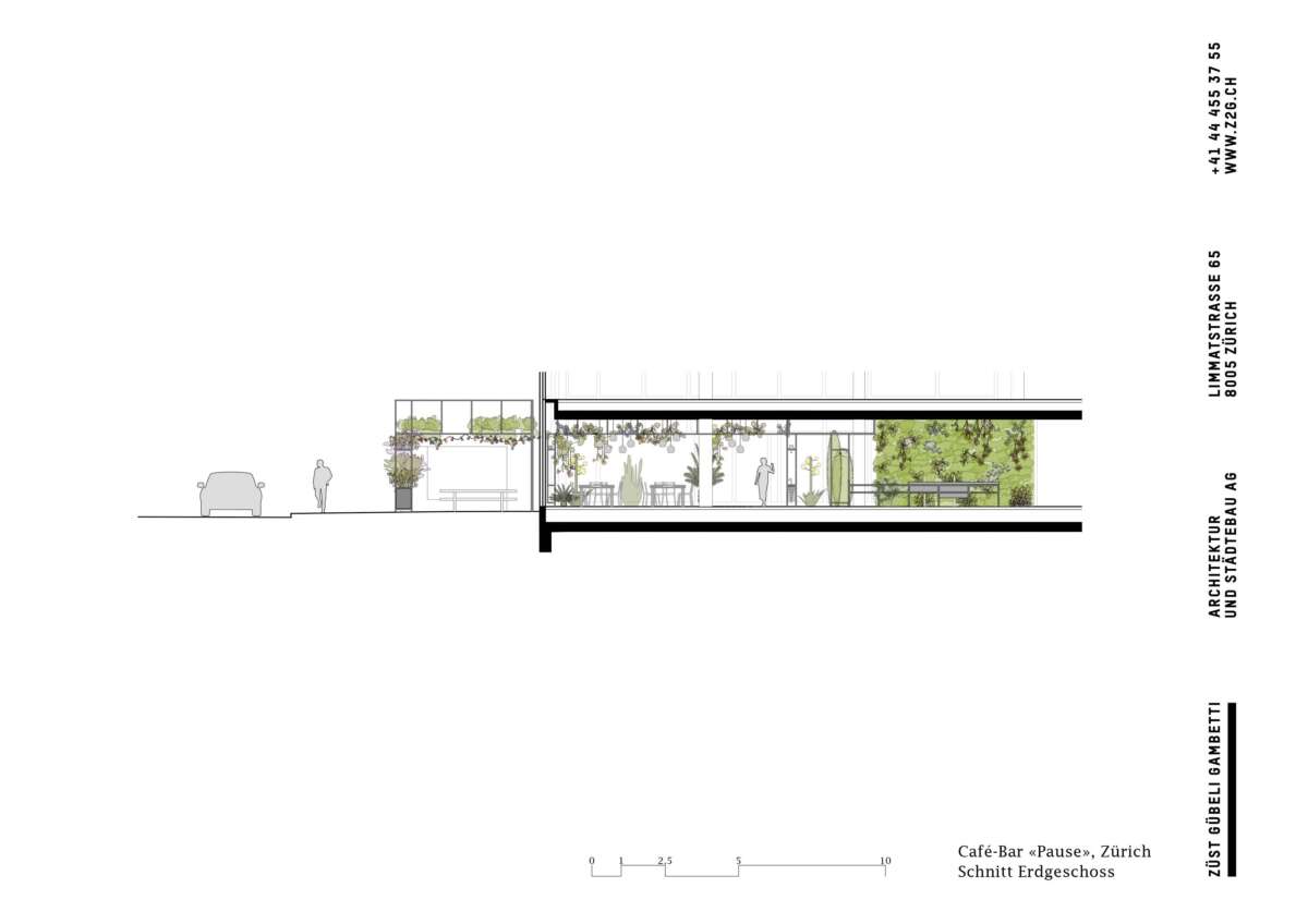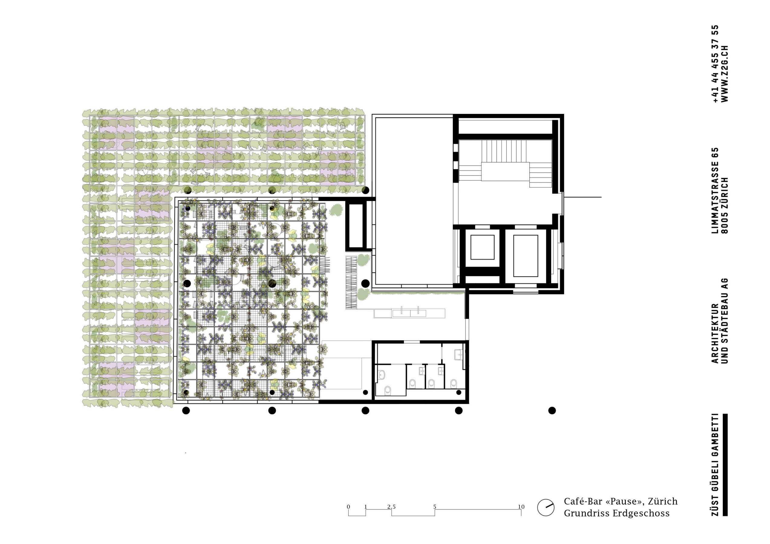 Ziel war ein vertikaler Garten, der dem grauen Asphaltdschungel Züri West eine grüne Grossstadtoase entgegensetzt. Ein Klima, in dem nicht nur das Naturwerk wächst, sondern auch Gedanken und Kreativität spriessen. In erster Linie für Mitarbeiter als Arbeitsbiotop, Rückzugsenklave oder Keimzelle für neue Ideen gedacht, will die «Pause» auch externen Besuchern offenstehen und den Vorplatz beleben. Mit der reizvollen Vorstellung im Kopf, dass die Natur das Kommando übernimmt, wurde ein modulares Gerüst gestaltet, das künftig auch den Strassenraum erobert und innen und aussen verschmelzen lässt.