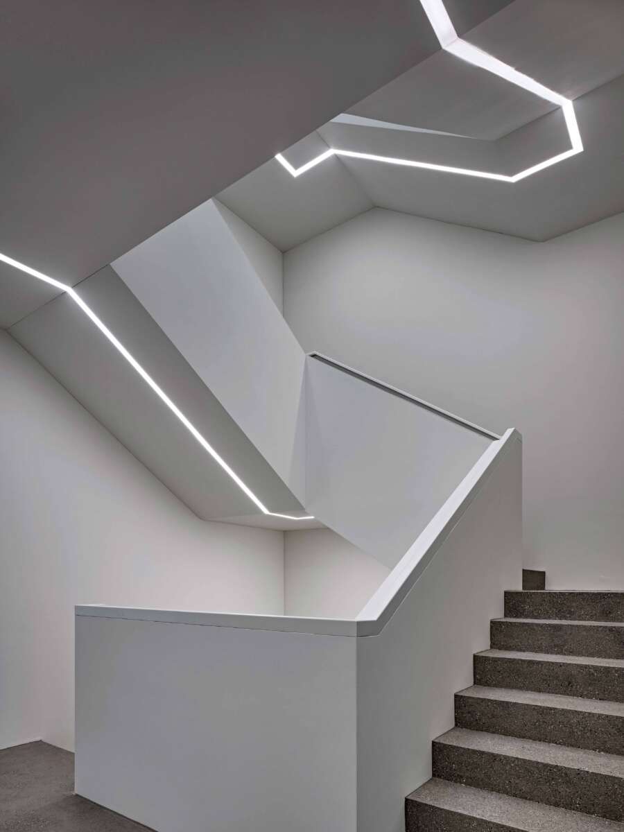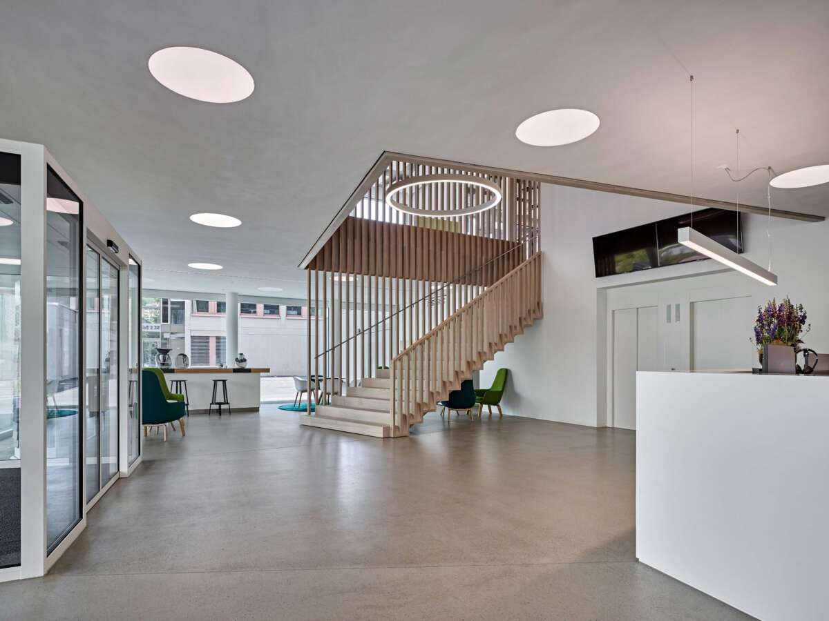 Eingebettet in ein Durcheinander von Gewerbe- und Wohnbauten, grenzt das Grundstück rückseits an eine lauschige Hügellandschaft. Die Architekten schlugen einen kompakten, mittels Knicken fein differenzierten Baukörper vor, der das baurechtliche Potenzial auslotet und zwischen den Polen vermittelt. Nun thront das Gebäude auf einer klar artikulierten Hangkante, an der sich die Themen Ankunft und Landschaftsraum um ein Geschoss versetzt gegenüberstehen. Der Eingangsbereich wird durch das zurückversetze Erdgeschoss akzentuiert. Dahinter trifft man auf eine zweigeschossige Halle, die sich über eine skulpturale Treppe ins Grüne weitet.
