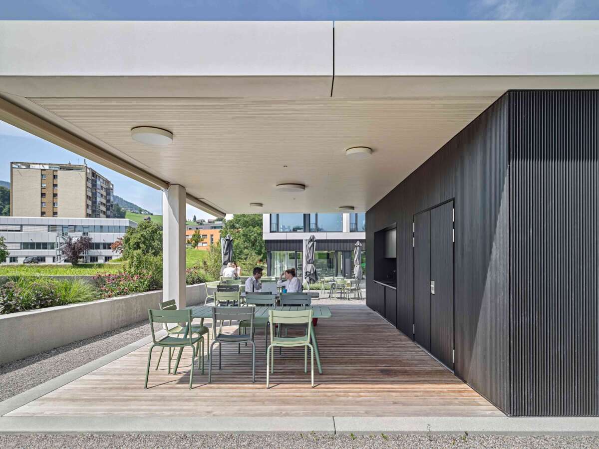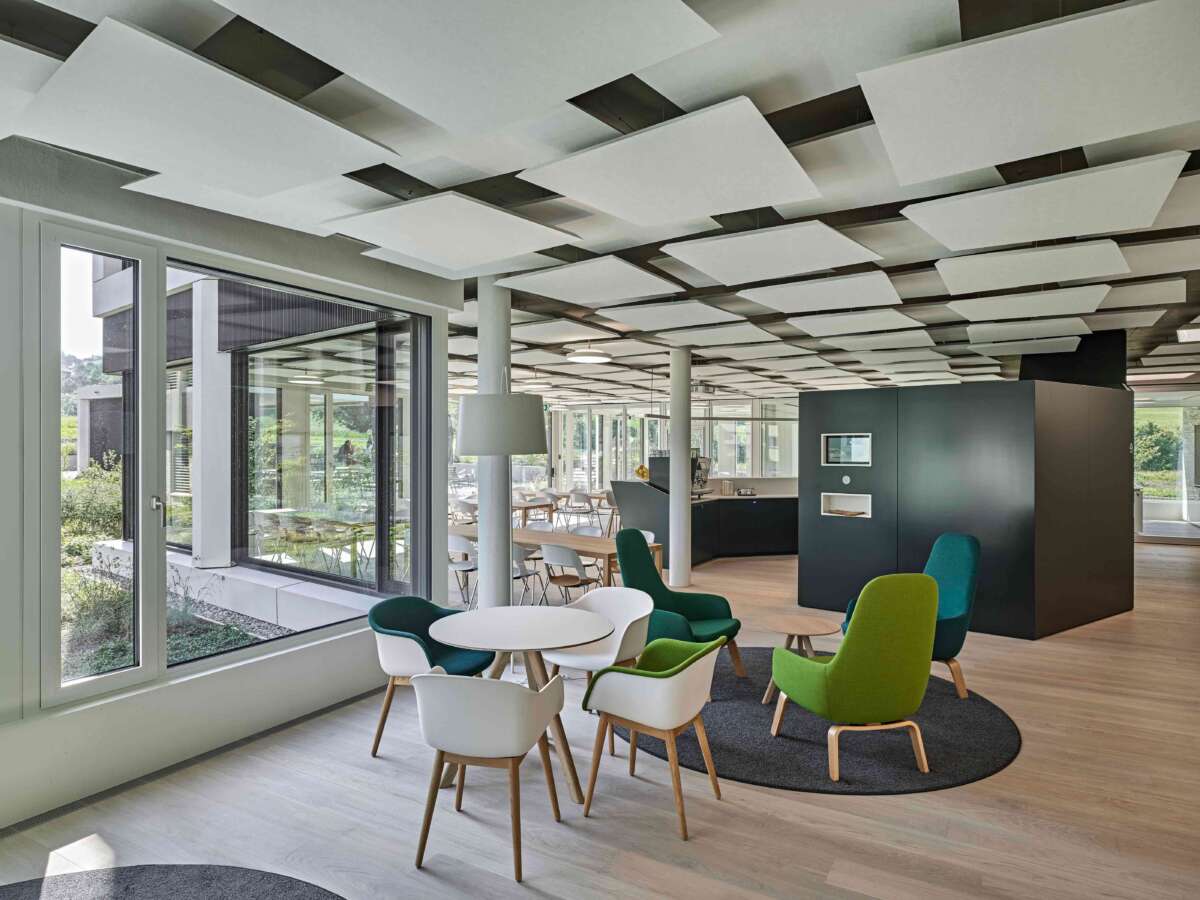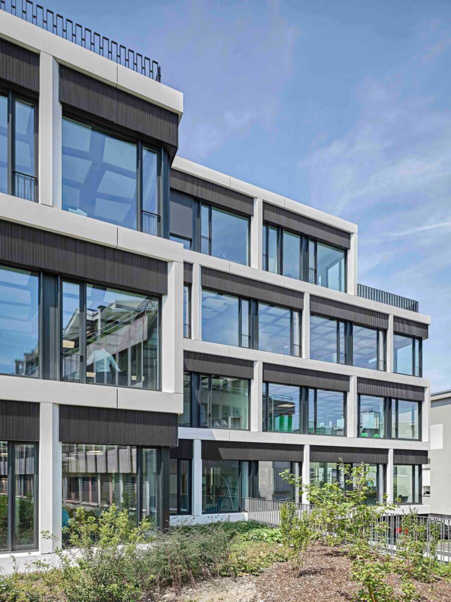 Dieser Raum, der den ganzen Bau durchsticht, ist das Herz des Hauses. Die nach neusten Erkenntnissen gestaltete Arbeitswelt drum herum verfügt dank polygonaler Grundrisse über variabel tiefe Flächen. Von aussen umspannt das Haus ein Rahmenwerk aus Glasfaserbetonelementen und schwarzbraunen Strangpressprofilen. Durch die versetzten, über Eck laufenden Fensterfelder entsteht der Eindruck von horizontalen Bändern, was alle Fassadenseiten optisch zu einem Kontinuum verbindet. Indes widerspiegeln die plastische Qualität und hochwertige Materialisation Firmenwerte wie technische Perfektion und eine sprichwörtlich lange Lebensdauer. (mc)