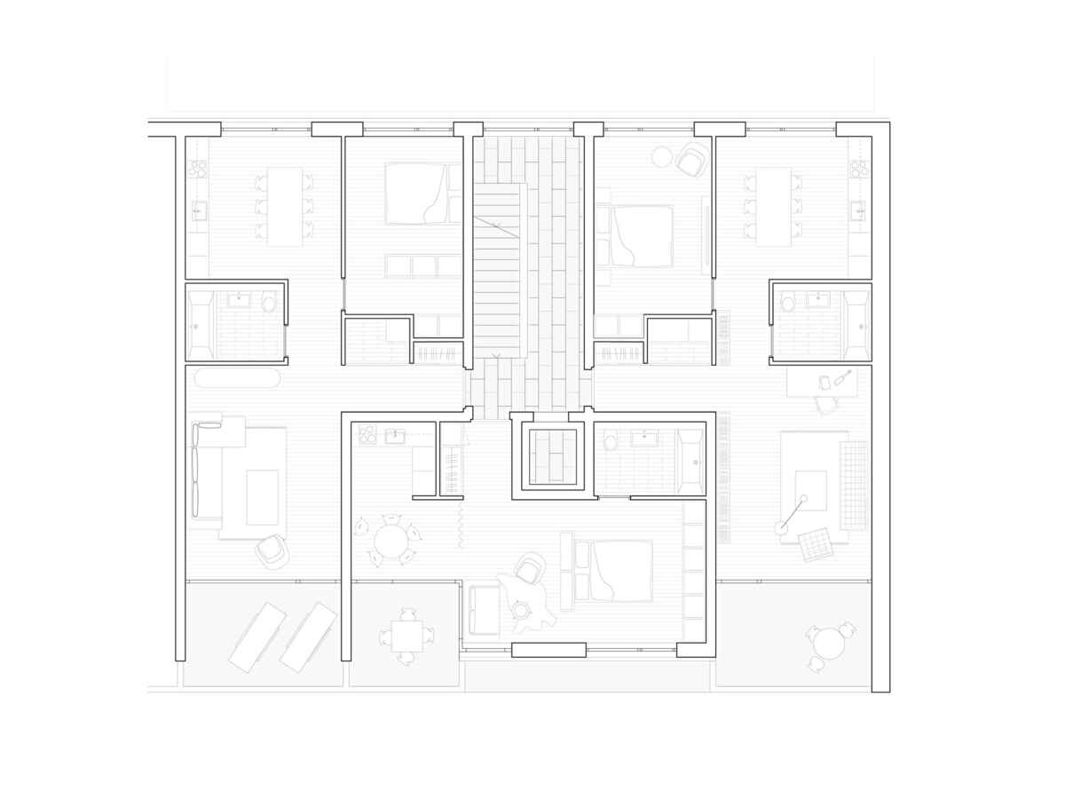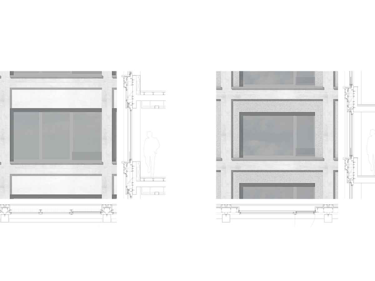 Der sich bildende, lärmgeschützte Innenhof dient als urbane Aufenthaltszone sowohl für Büronutzer als auch für die Bewohner. Die Gewerbeeinheiten sind vom Aussenbereich erschlossen und besitzen bei Bedarf die Möglichkeit, Eingänge und Schaufenster zum Innenhof zu realisieren.