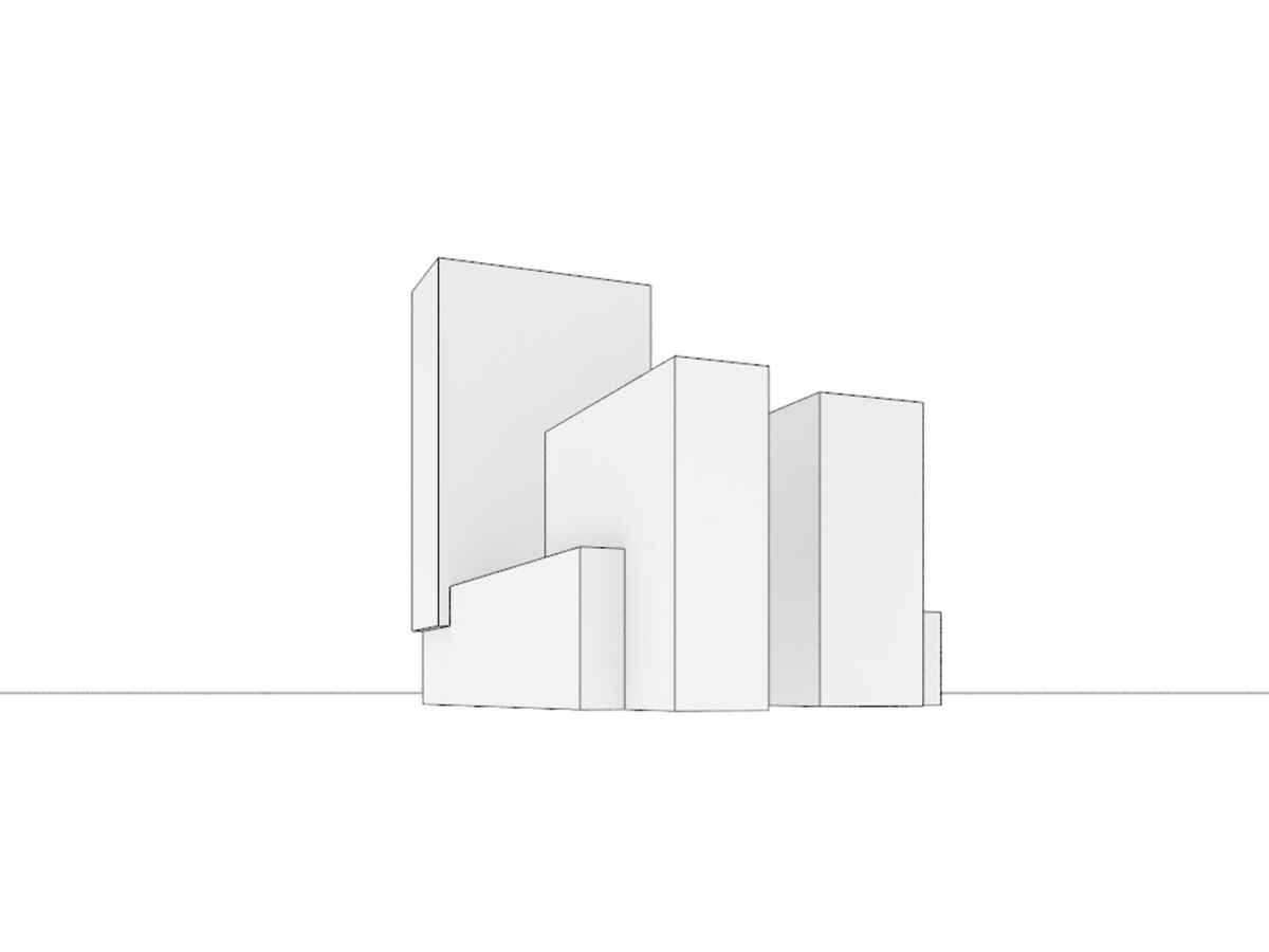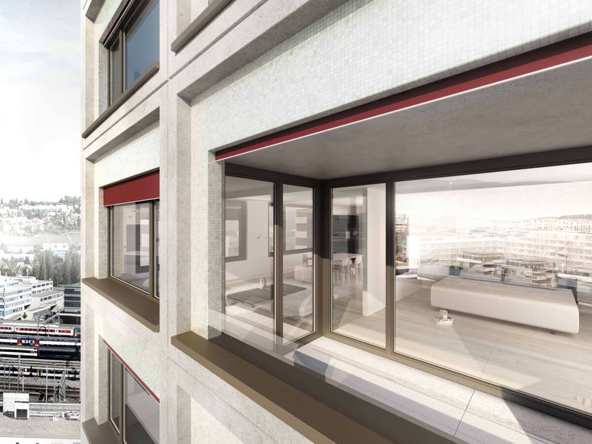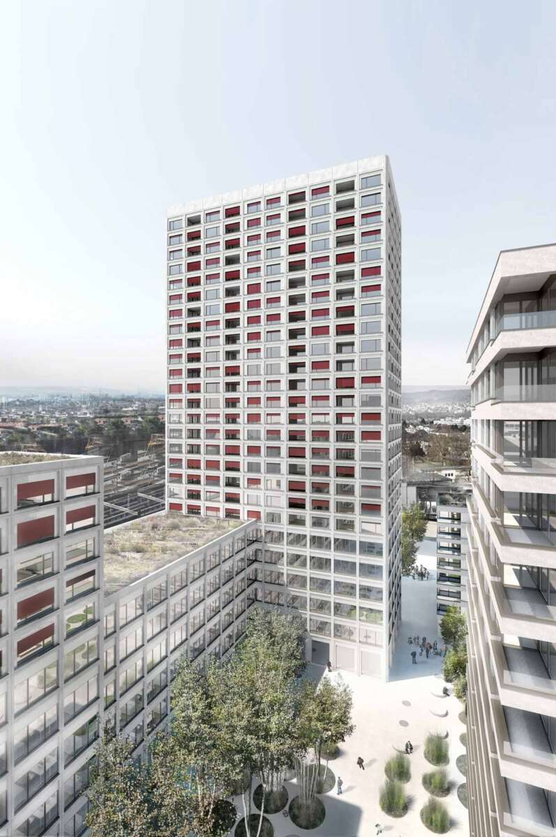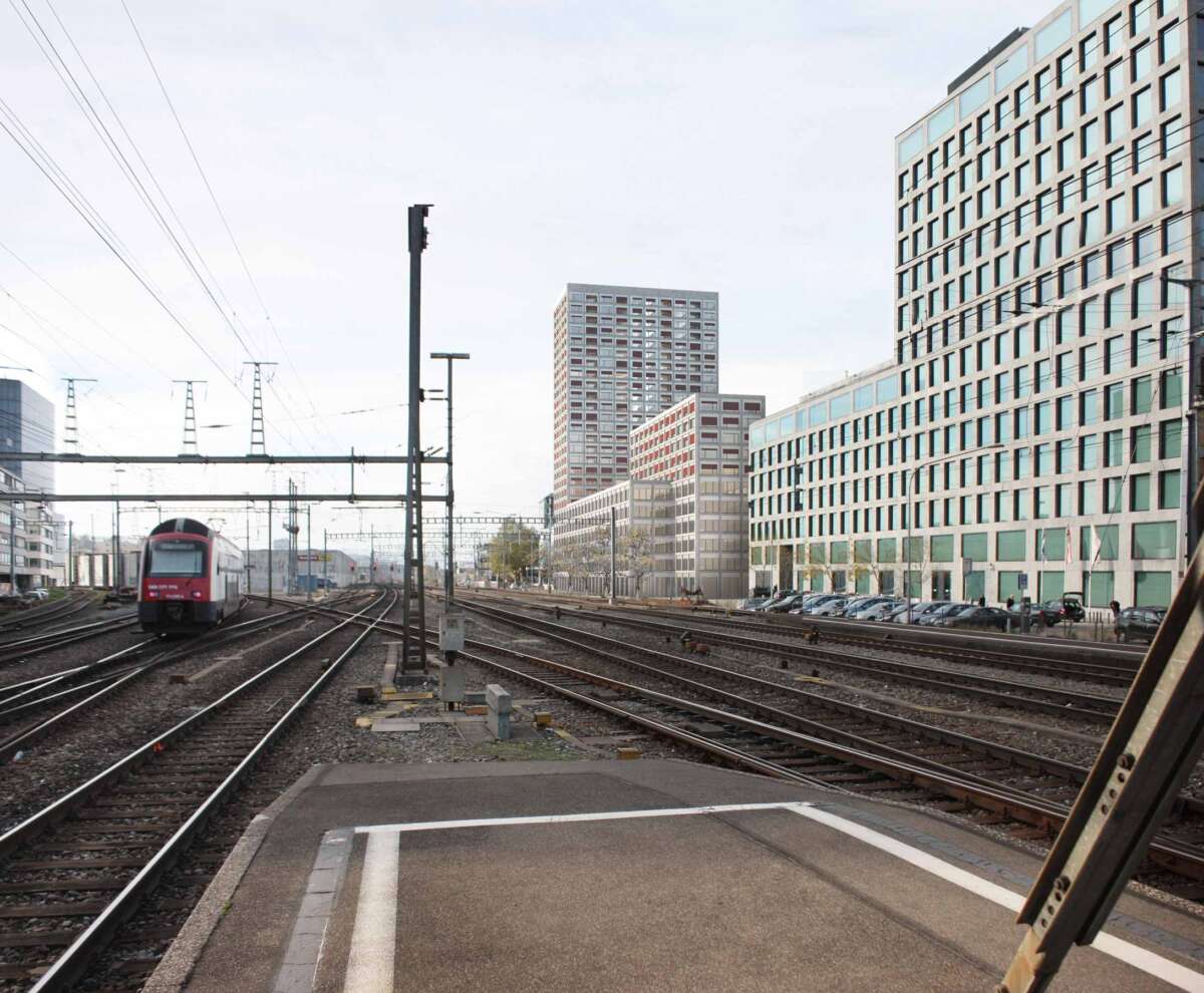 Der Entwurf im Spannungsfeld von Gleisen, Autobahn und Gewerbebauten reagiert mit drei verschiedenen, präzise gesetzten Hochpunkten. Diese bilden ein städtebauliches Ensemble, das sich zum einen auf den grösseren Massstab der Zürcher Hochhauszone bezieht, zum anderen den Anforderungen an lärmgeschütztes und belichtetes Wohnen an einer prägnanten Adresse Rechnung trägt.