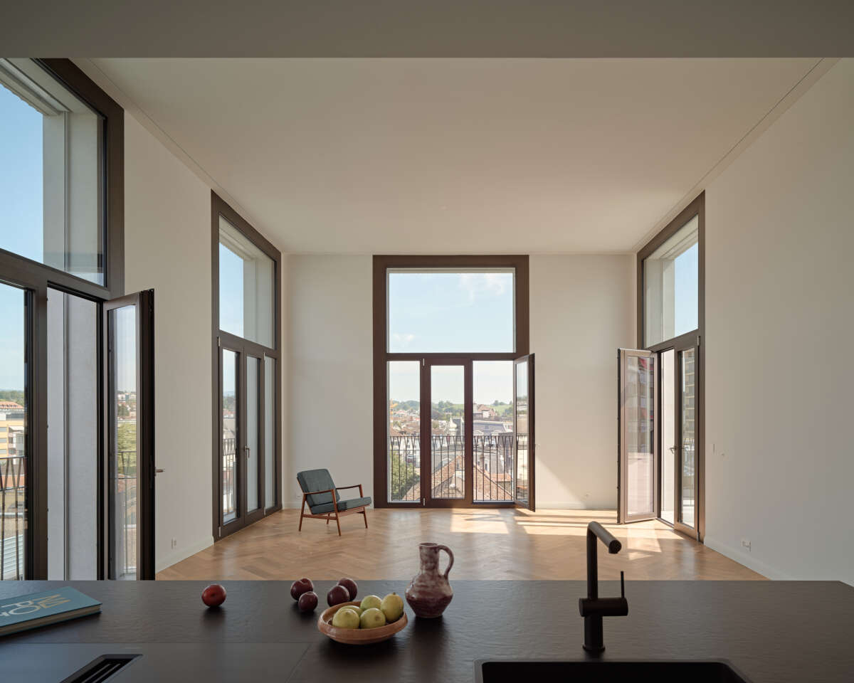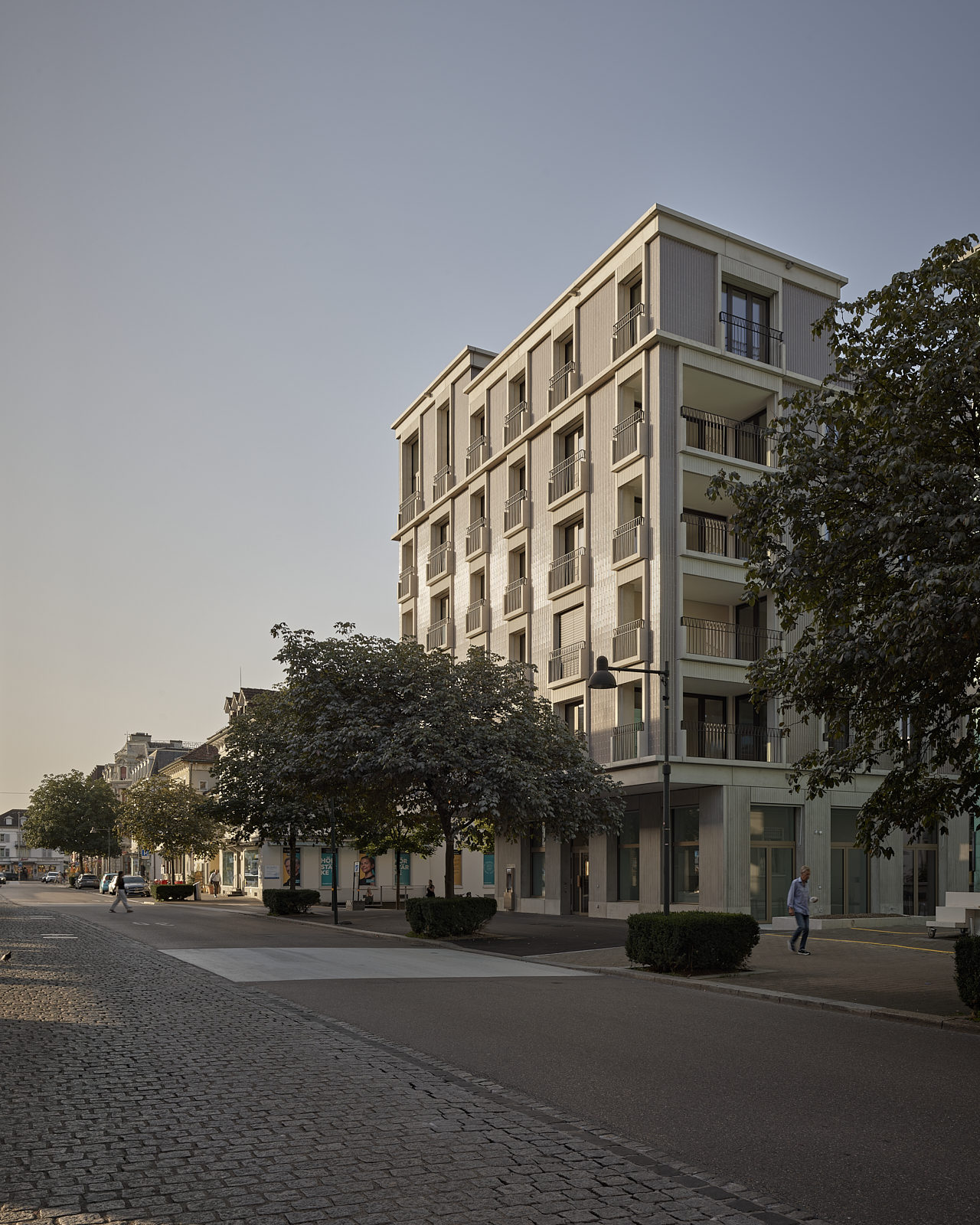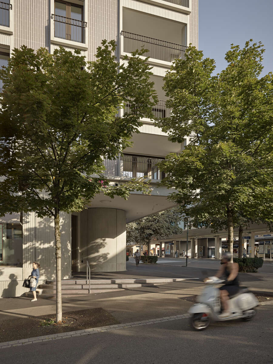 Das neue Haus am Platz besetzt ebenso selbstbewusst wie freundlich die Strassenecke. Seine angenehme Präsenz hat mit der kraftvollen Wirkung – je nach Blickwinkel als lange Strassenfront oder Turm – und der dynamischen Rundung des Übereckeingangs zu tun. Letzterer lädt ein, das Erdgeschoss-Lokal zu betreten. Überhaupt erfährt der öffentliche Raum eine Aufwertung: Zum einen, weil die Stadt mit dem Gebäude ein attraktives Entrée erhält. Zum anderen, weil dank der hohen, eingezogenen Sockelpartie ein geschützter Ort entsteht, der die Grenze zum öffentlichen Raum aufweicht. Darüber hinaus profitiert der Stadtraum von einem neuen Platz zwischen Neubau und benachbarter Bibliothek.