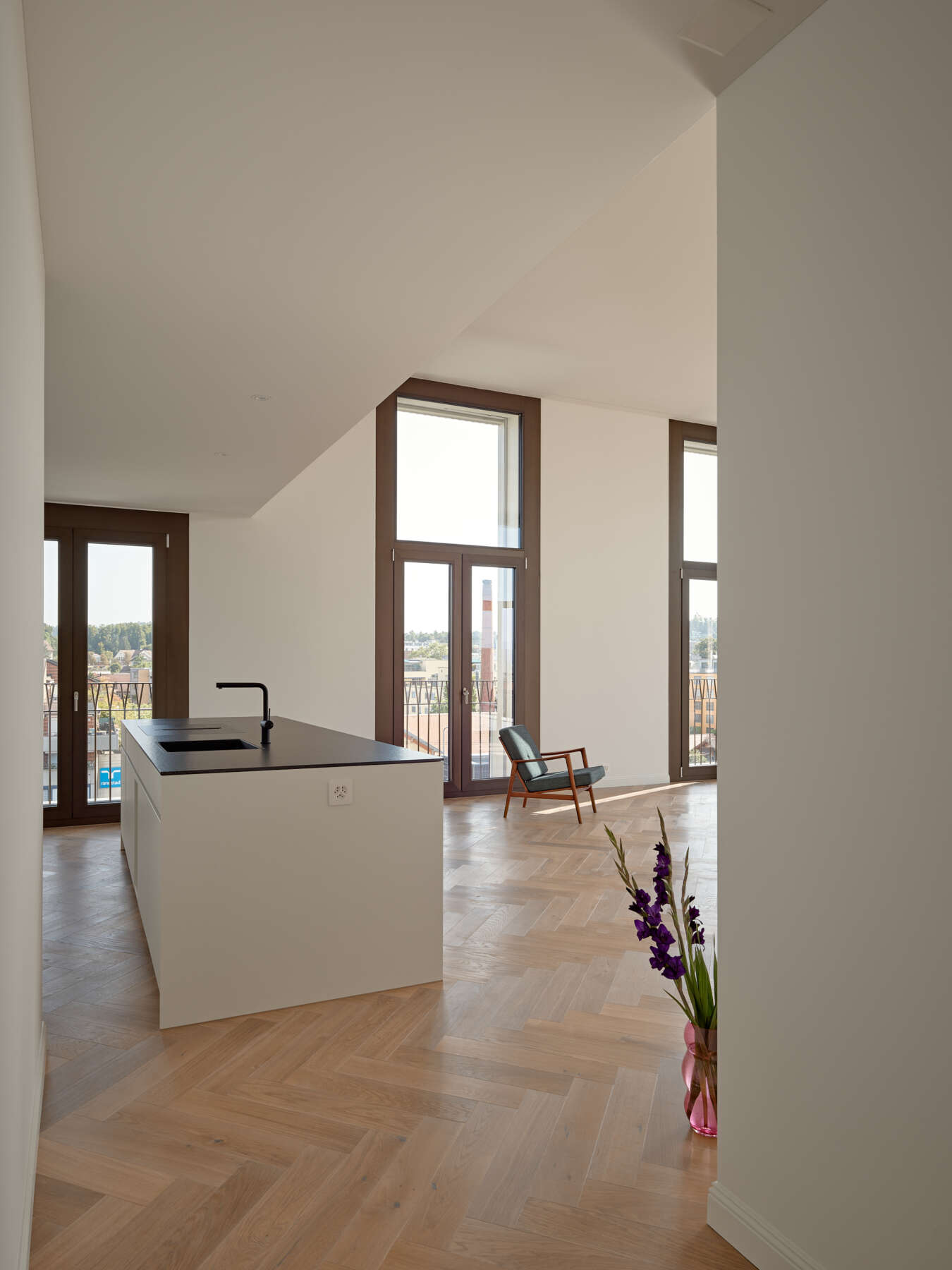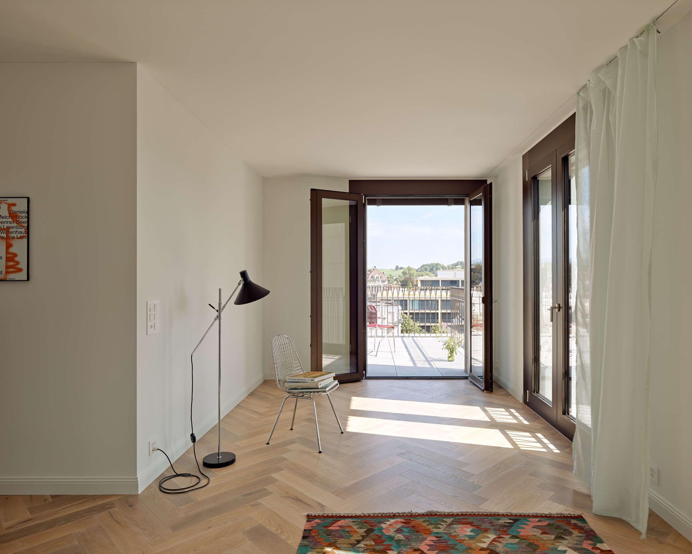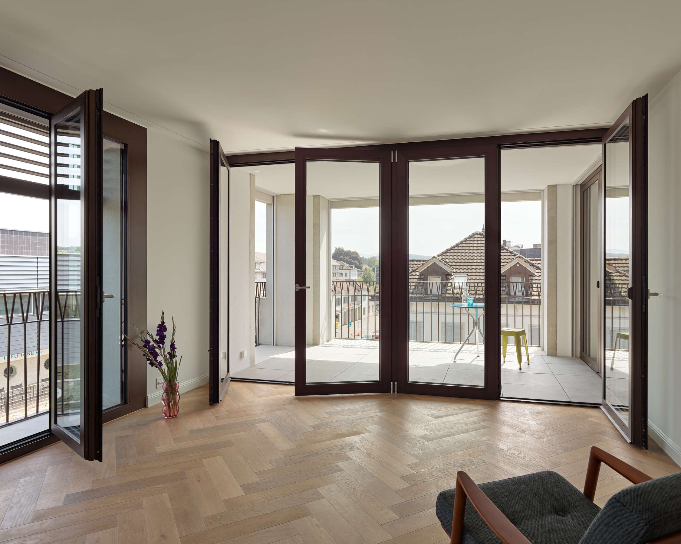 Das neue Haus am Platz besetzt ebenso selbstbewusst wie freundlich die Strassenecke. Seine angenehme Präsenz hat mit der kraftvollen Wirkung – je nach Blickwinkel als lange Strassenfront oder Turm – und der dynamischen Rundung des Übereckeingangs zu tun. Letzterer lädt ein, das Erdgeschoss-Lokal zu betreten. Überhaupt erfährt der öffentliche Raum eine Aufwertung: Zum einen, weil die Stadt mit dem Gebäude ein attraktives Entrée erhält. Zum anderen, weil dank der hohen, eingezogenen Sockelpartie ein geschützter Ort entsteht, der die Grenze zum öffentlichen Raum aufweicht. Darüber hinaus profitiert der Stadtraum von einem neuen Platz zwischen Neubau und benachbarter Bibliothek.
