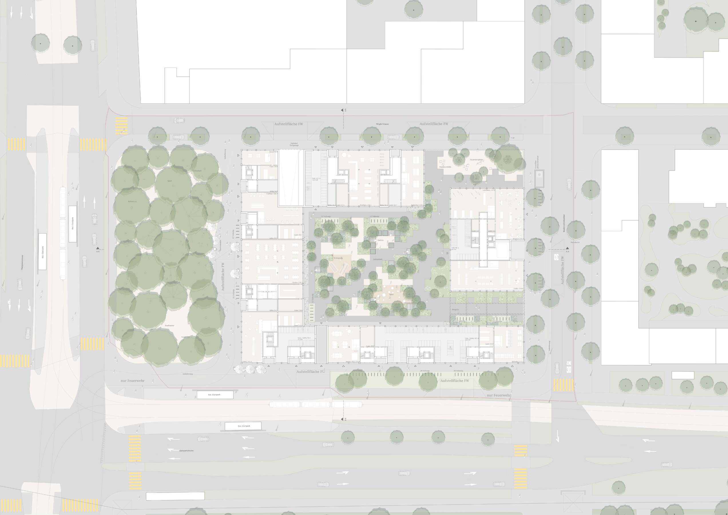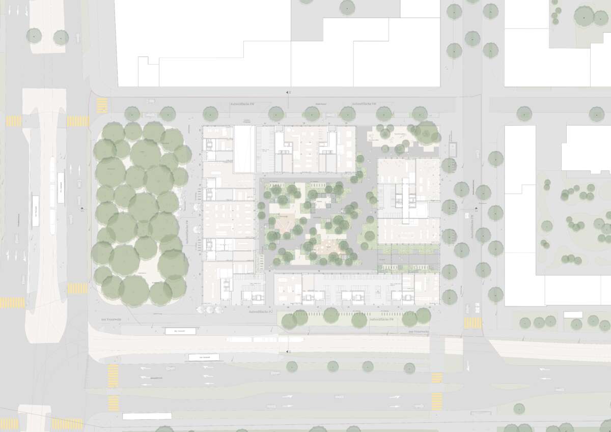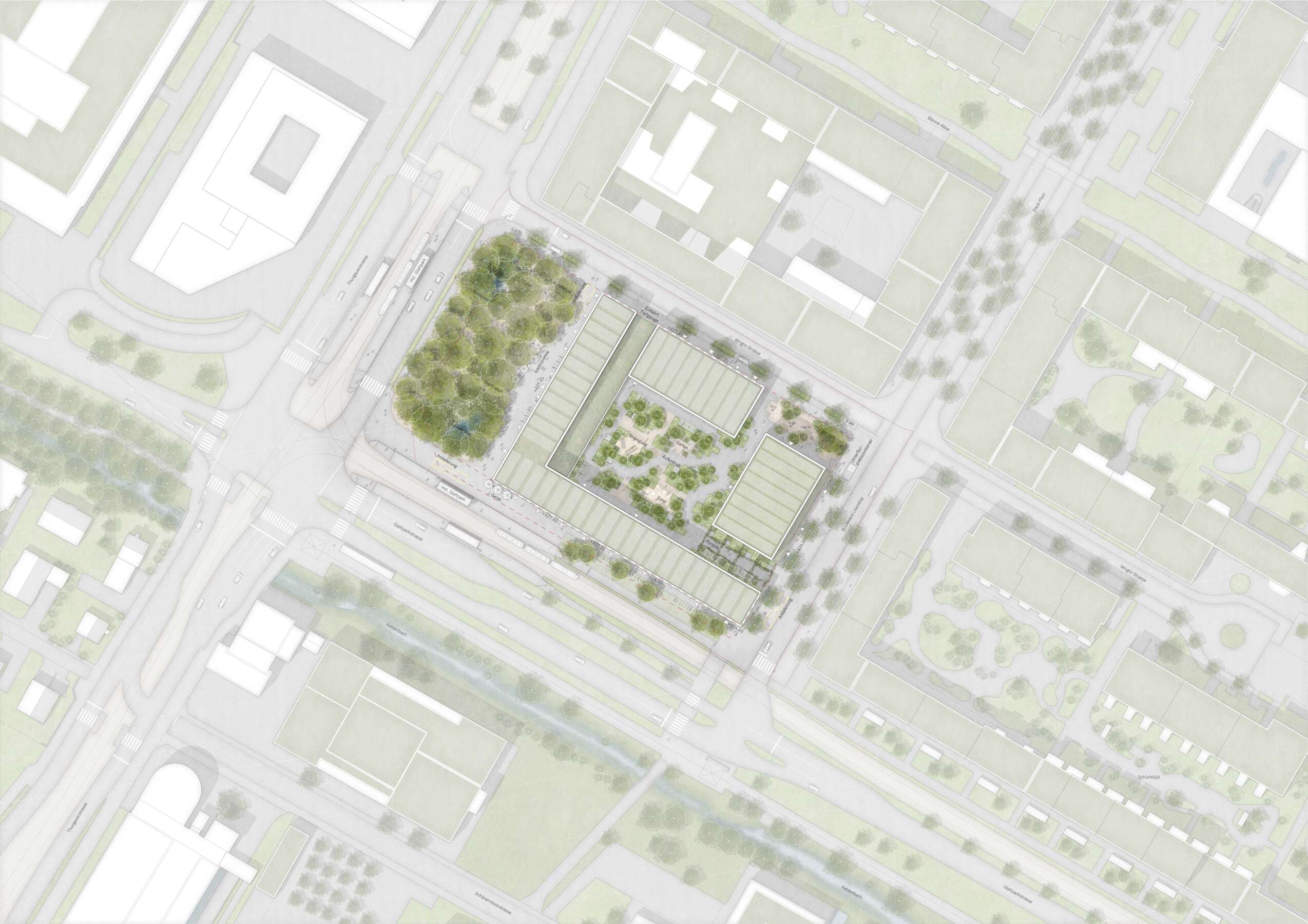 Es ist die vorletzte Brache im Glattpark und prädestiniert für eine grosse Geste: Direkt an der Kreuzung und Haltestelle, markiert sie das nördliche Eingangstor. Hier soll ein attraktiver Ort entstehen, an dem auch Bewohner und Gewerbetreibende sich beheimatet fühlen. Entwurfsziel war ein Ensemble, das zum körperhaften Gegenstück des öffentlichen Raums wird. So fügen sich nun Winkel, Riegel und Hochpunkt zum skulpturalen Blockrand, der zwischen den Glattparkbauten und Leutschenbach-Türmen vermittelt. Vor allem aber rückt er eigens um ein Drittel im Baufeld zurück, was einen grossen, baumbestandenen Platz und Mehrwert fürs Quartier freispielt. Als Gegengewicht macht das Hochhaus, von weitem sichtbar, einem Punkt.
