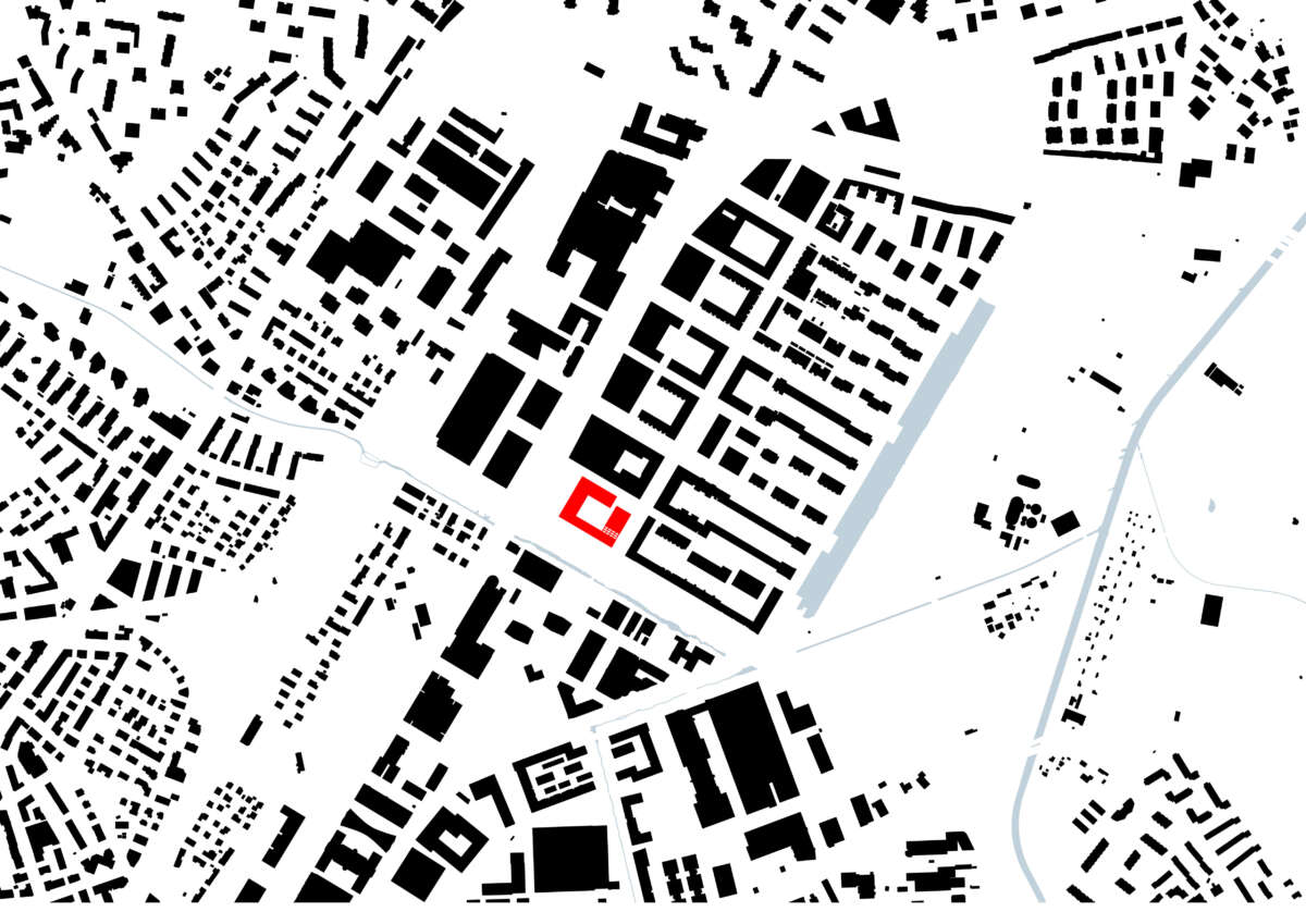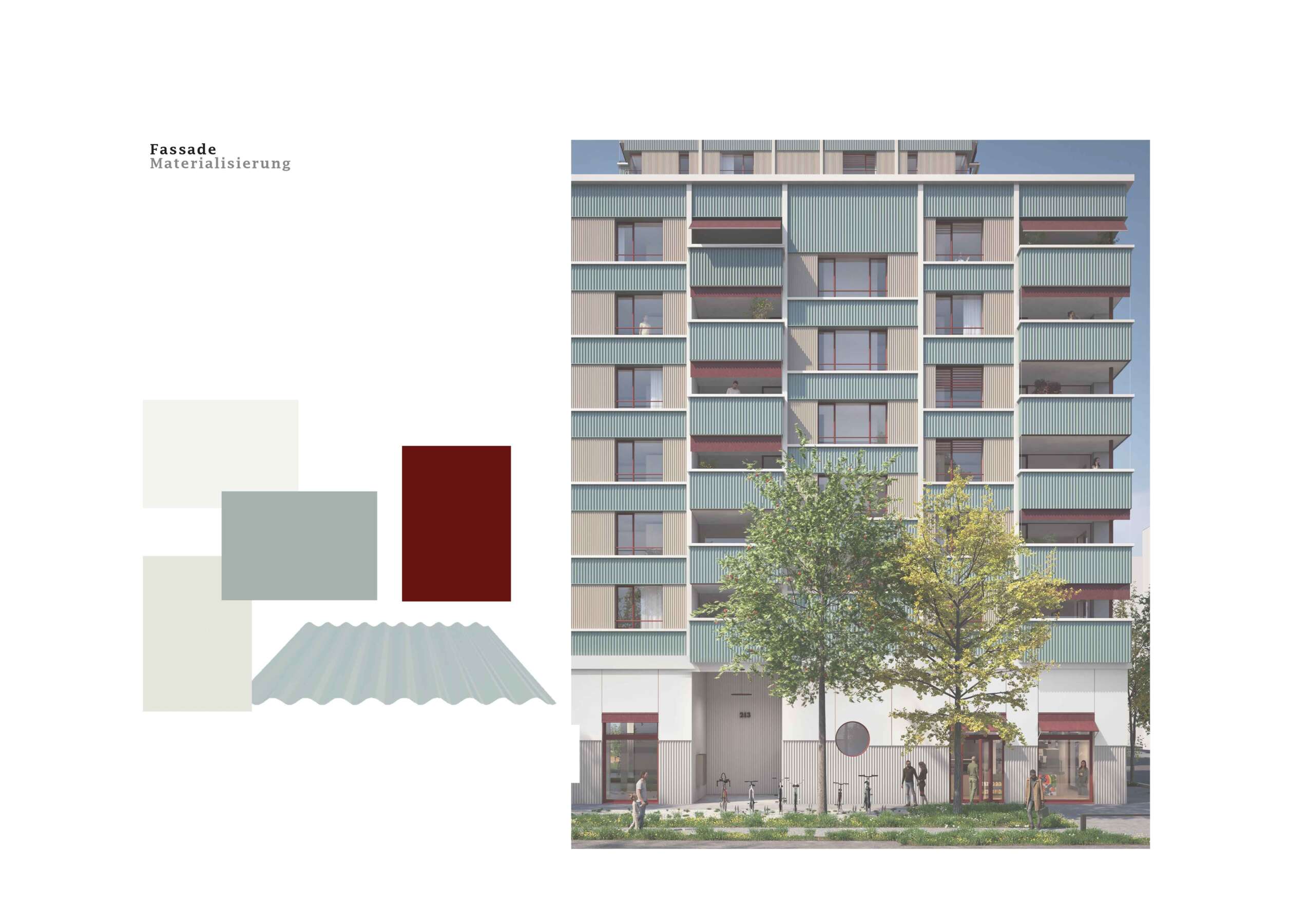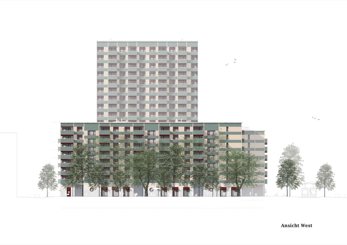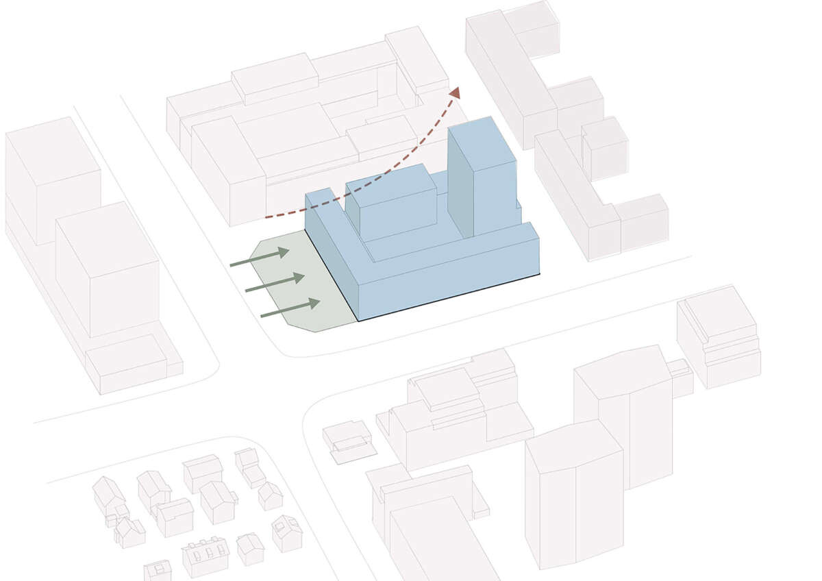 Es ist die vorletzte Brache im Glattpark und prädestiniert für eine grosse Geste: Direkt an der Kreuzung und Haltestelle, markiert sie das nördliche Eingangstor. Hier soll ein attraktiver Ort entstehen, an dem auch Bewohner und Gewerbetreibende sich beheimatet fühlen. Entwurfsziel war ein Ensemble, das zum körperhaften Gegenstück des öffentlichen Raums wird. So fügen sich nun Winkel, Riegel und Hochpunkt zum skulpturalen Blockrand, der zwischen den Glattparkbauten und Leutschenbach-Türmen vermittelt. Vor allem aber rückt er eigens um ein Drittel im Baufeld zurück, was einen grossen, baumbestandenen Platz und Mehrwert fürs Quartier freispielt. Als Gegengewicht macht das Hochhaus, von weitem sichtbar, einem Punkt.