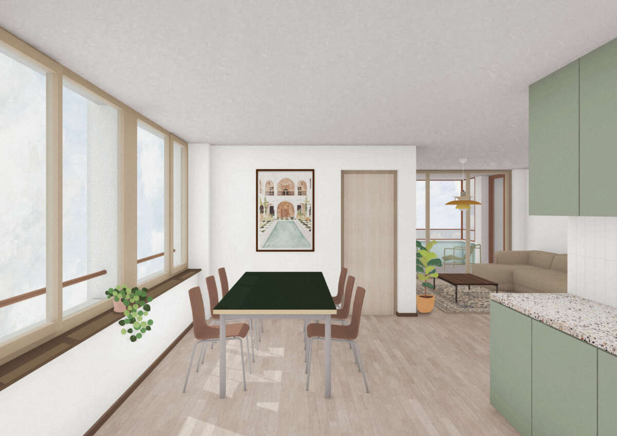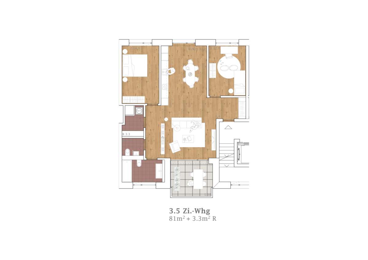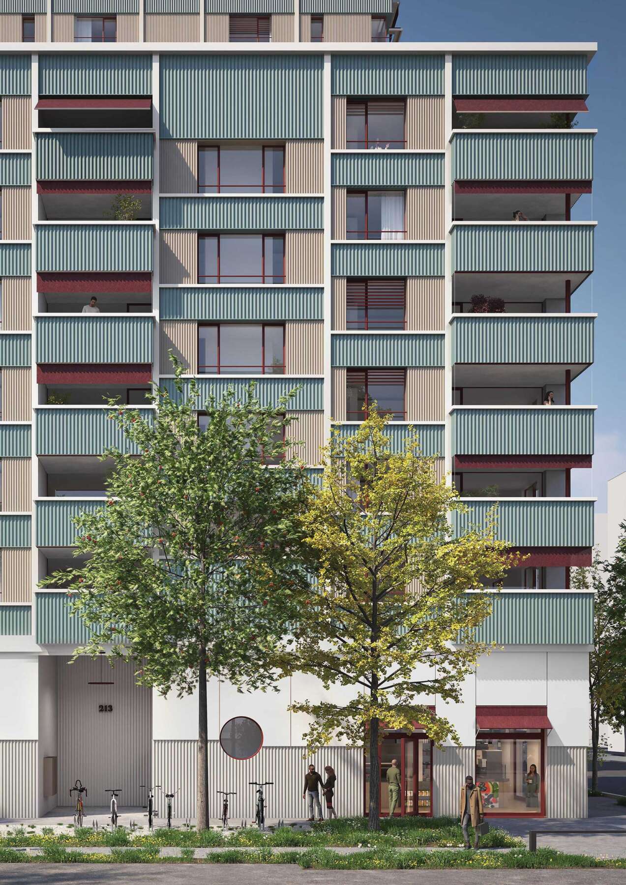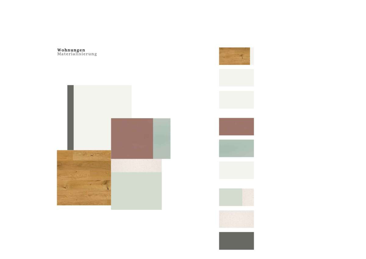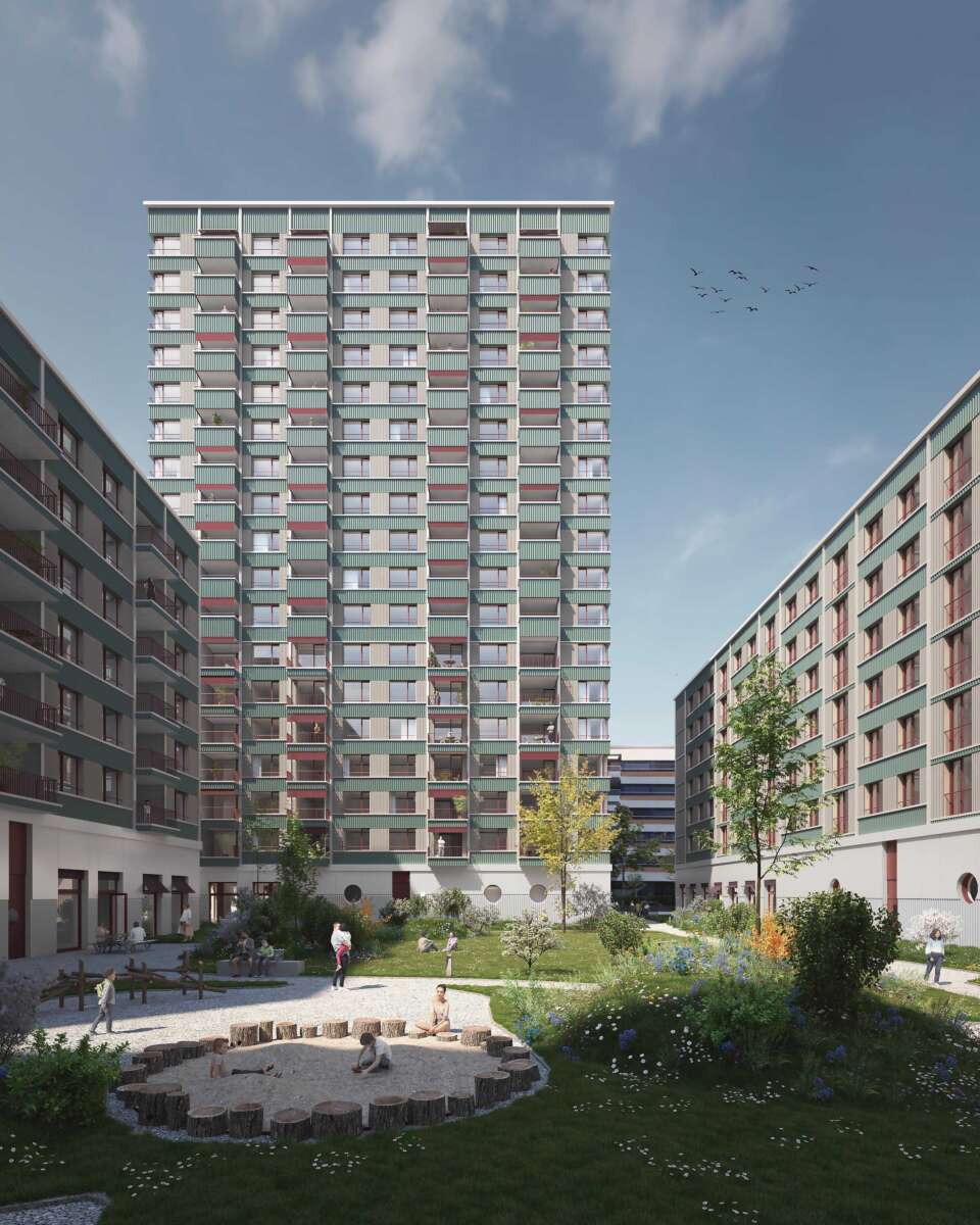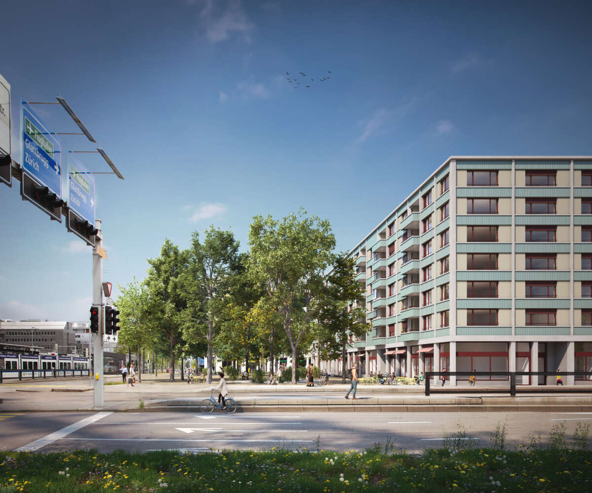 Im Blockinneren erweitert ein Wohnhof das städtische Vokabular. Von aussen adressiert und über drei – auch atmosphärisch – verschiedene Zugänge erreichbar, bietet er einen beinahe intimen Rückzugsort und beste Anbindungen. Auf Augenhöhe verbindet ein hoher Gewerbesockel das Ensemble, wobei für Gastroangebote die Platz- und Ecklagen speziell attraktiv sind. Darüber erheben sich die Wohnetagen mit 256 Einheiten. Zum Platz und zur Glattparkstrasse hin reagieren durchgestreckte Wohnungen mit Loggien auf die Lärmproblematik. Sie profitieren von bester Besonnung und der ruhigen Hofseite. Der Riegel im Nordosten fasst je zwei Eckwohnungen sowie eine durchgestreckte Einheit.