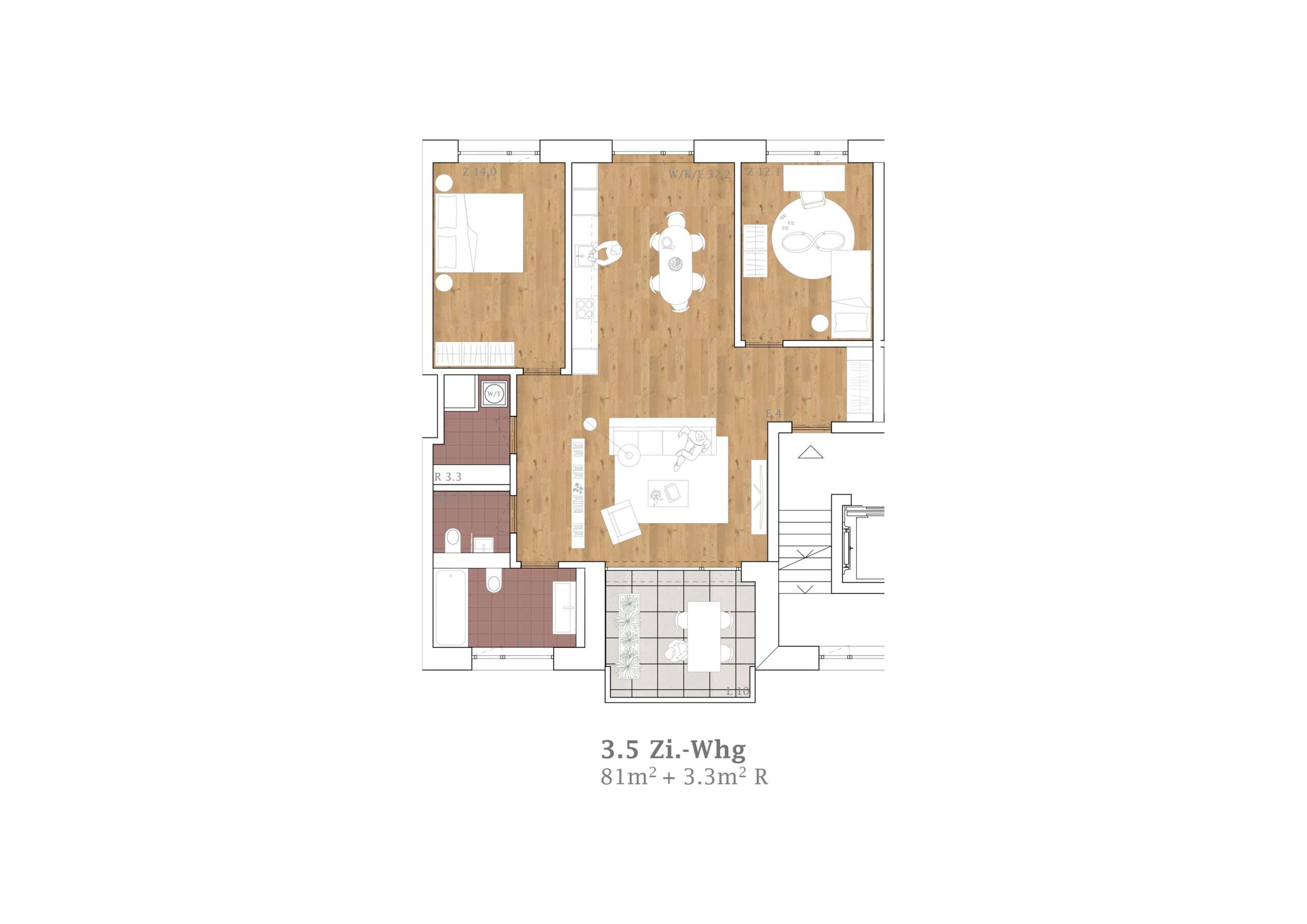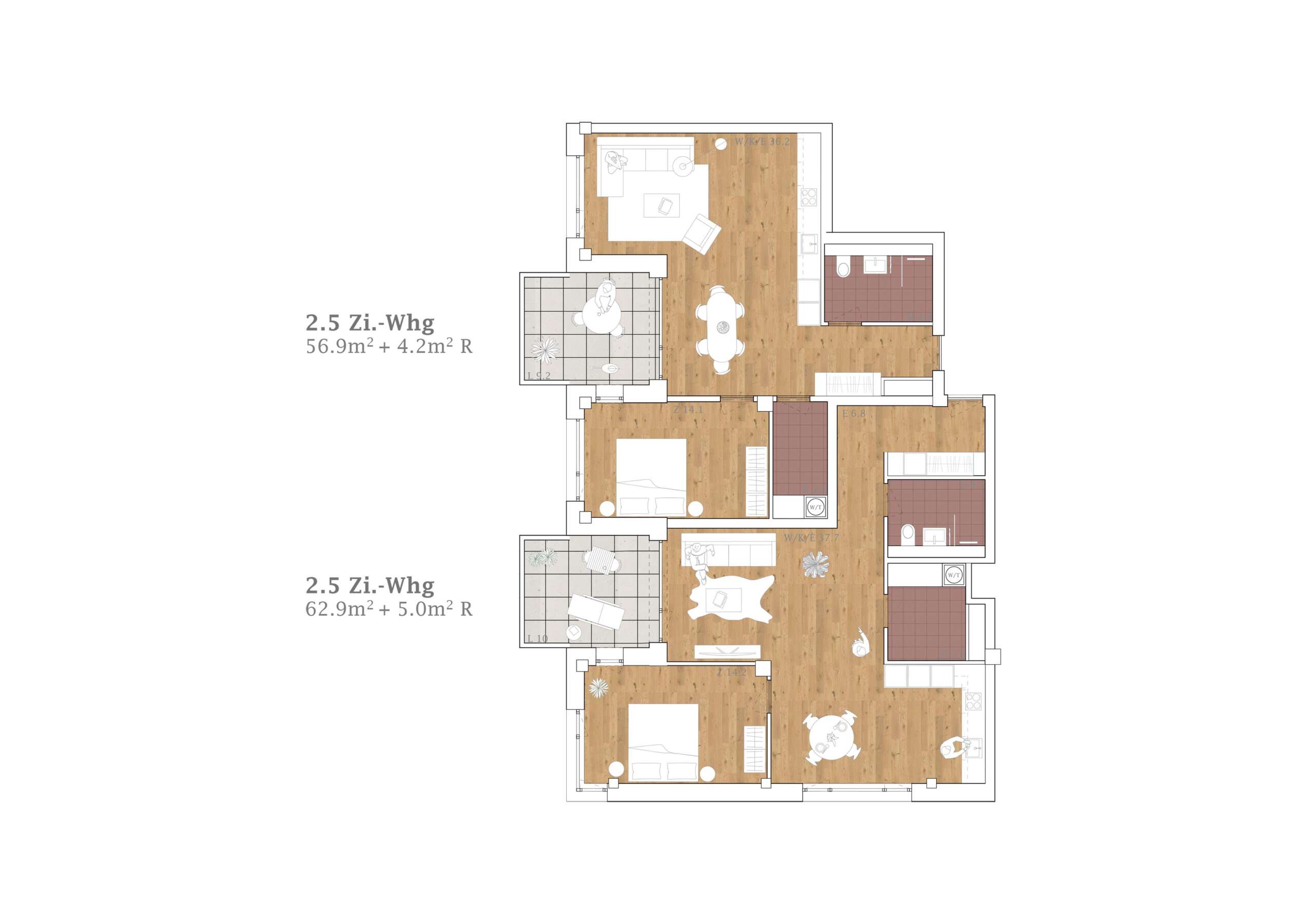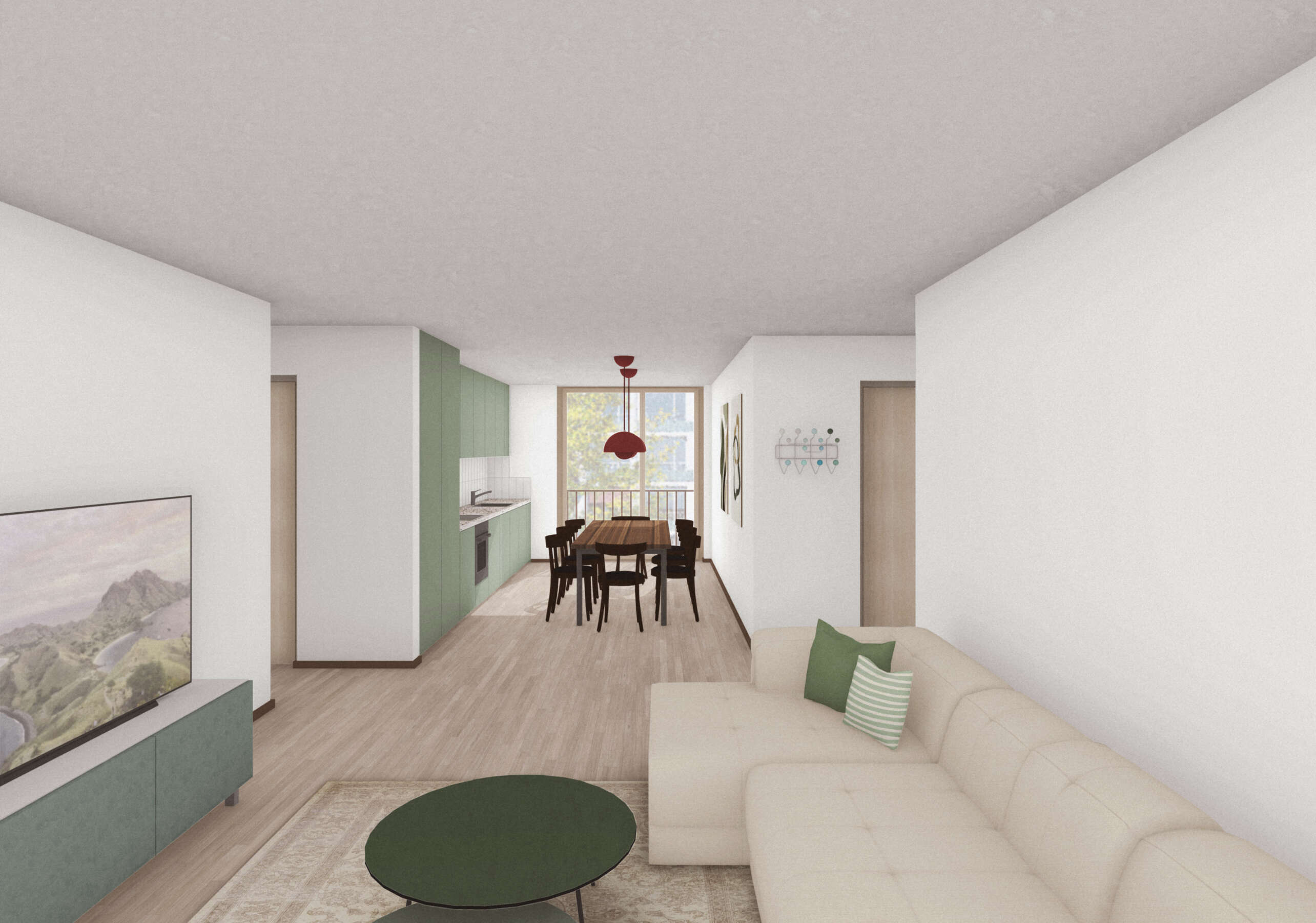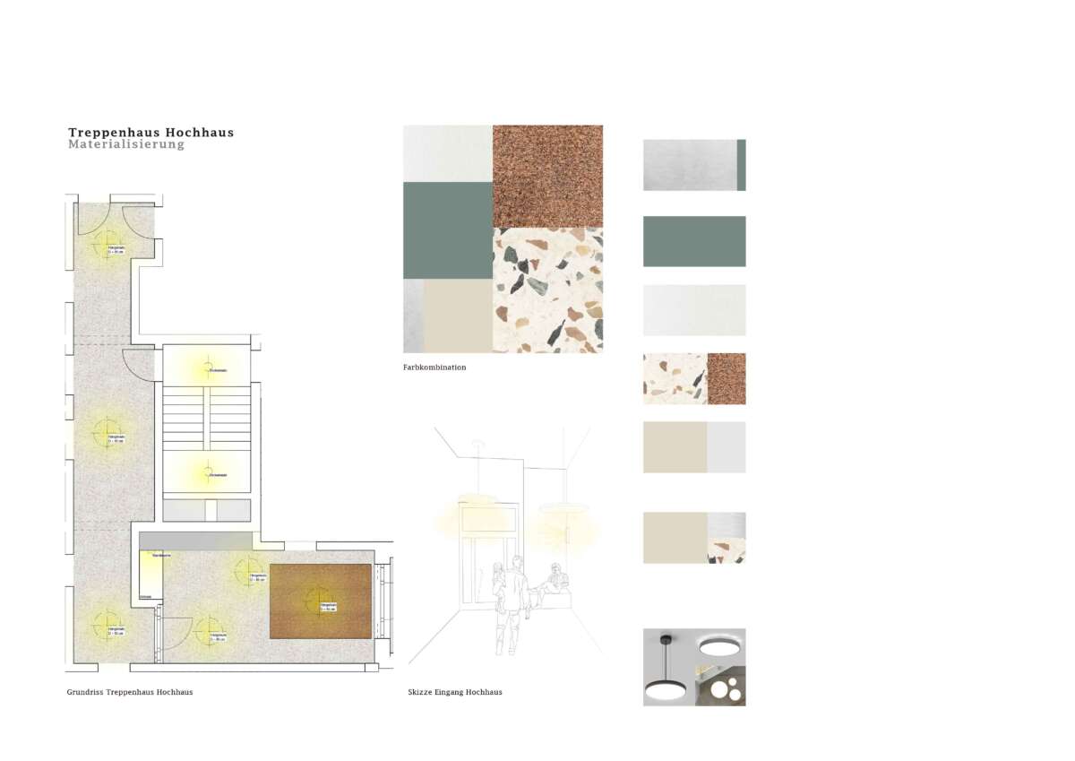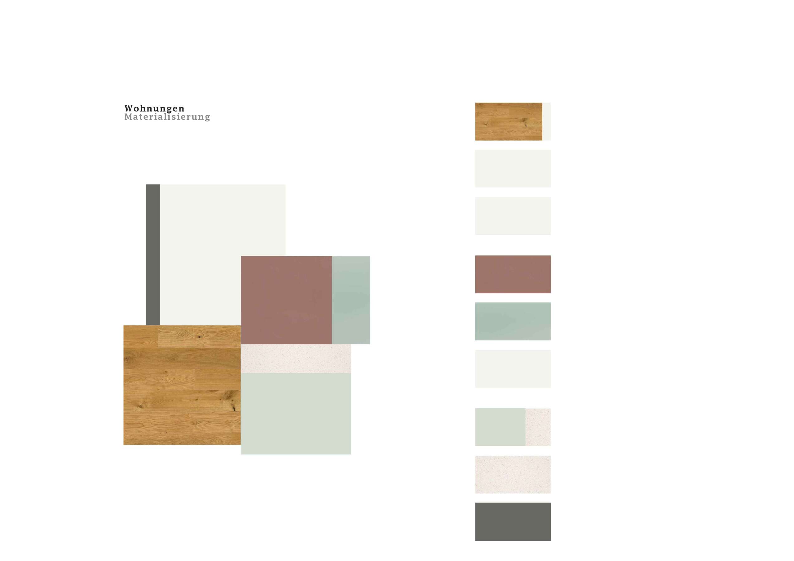 Im Blockinneren erweitert ein Wohnhof das städtische Vokabular. Von aussen adressiert und über drei – auch atmosphärisch – verschiedene Zugänge erreichbar, bietet er einen beinahe intimen Rückzugsort und beste Anbindungen. Auf Augenhöhe verbindet ein hoher Gewerbesockel das Ensemble, wobei für Gastroangebote die Platz- und Ecklagen speziell attraktiv sind. Darüber erheben sich die Wohnetagen mit 256 Einheiten. Zum Platz und zur Glattparkstrasse hin reagieren durchgestreckte Wohnungen mit Loggien auf die Lärmproblematik. Sie profitieren von bester Besonnung und der ruhigen Hofseite. Der Riegel im Nordosten fasst je zwei Eckwohnungen sowie eine durchgestreckte Einheit.