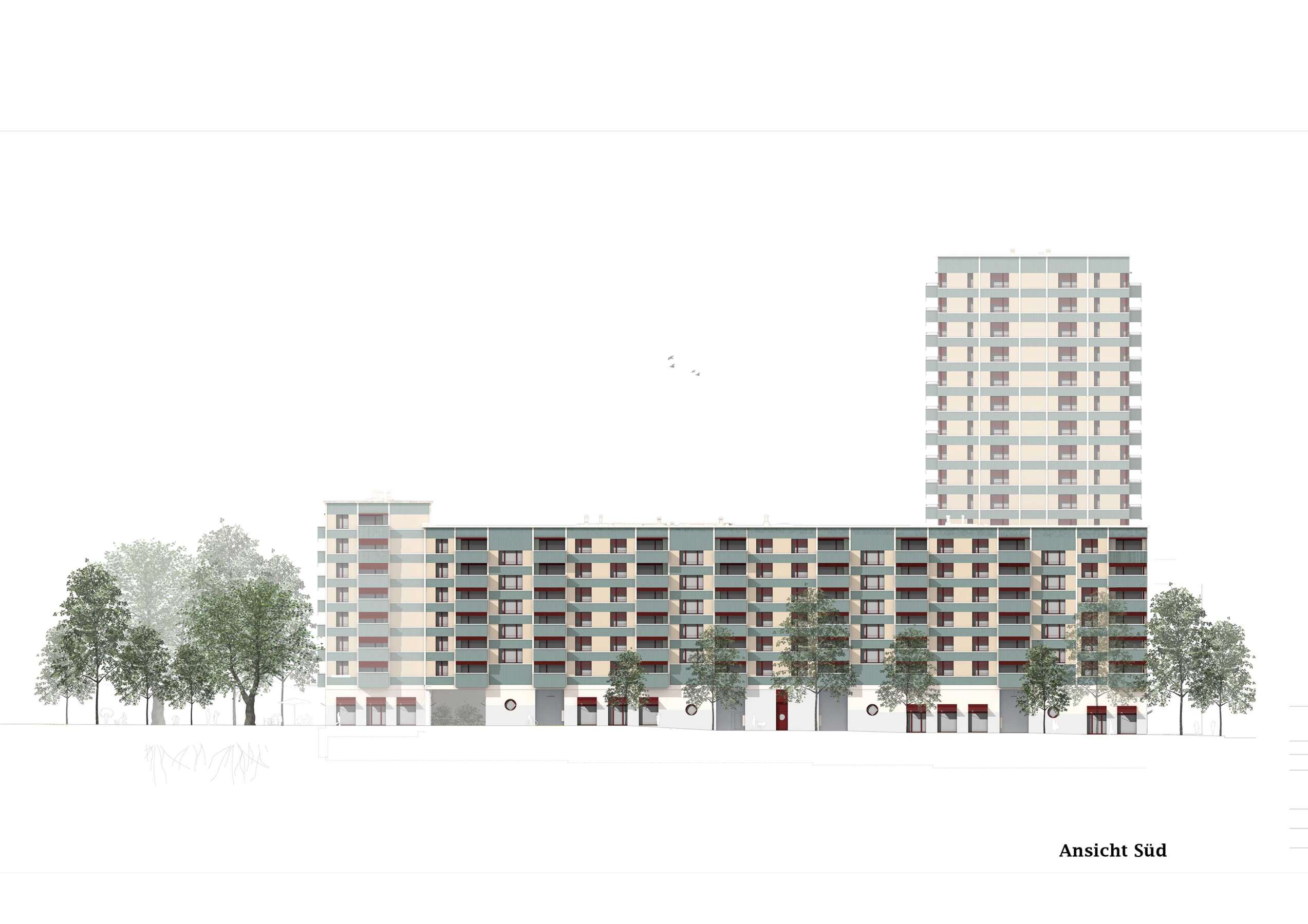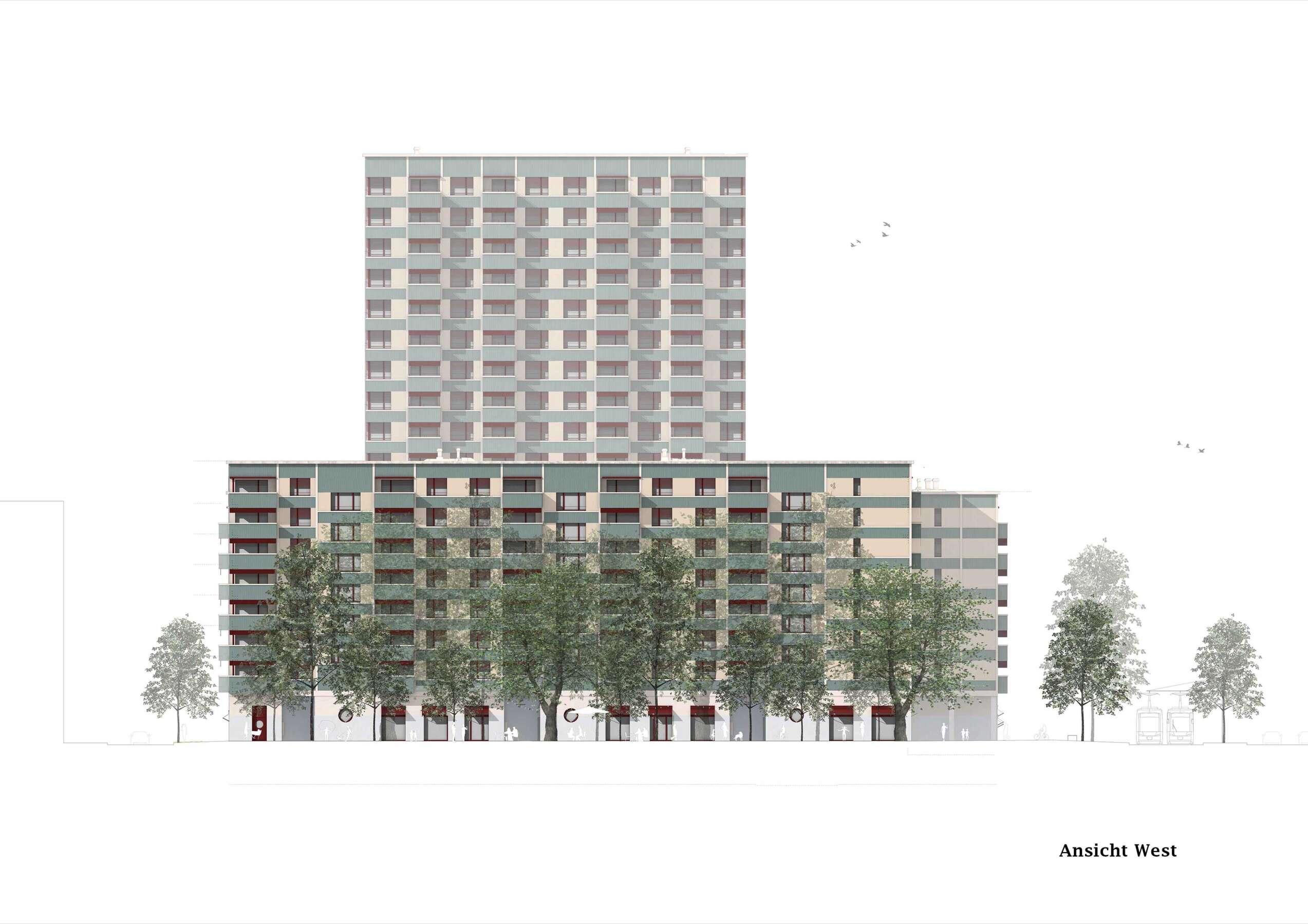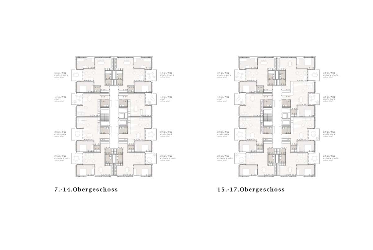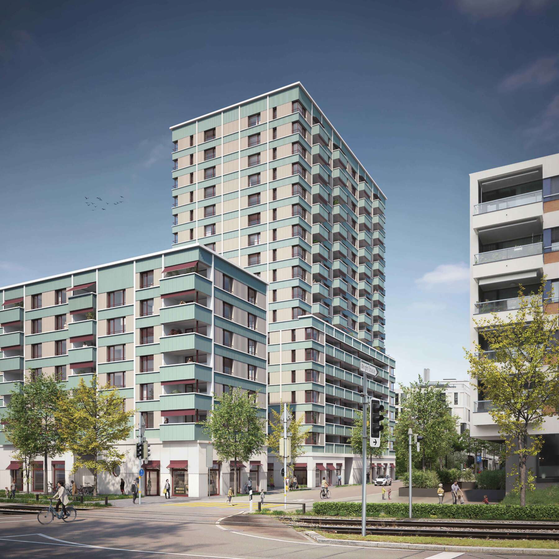 Das von der Wright-Strasse zurückversetzte Hochhaus ist als effizienter Achtspänner organisiert und zeitigt einen kleinen Quartiersplatz. Oben in den grösseren Übereck-Wohnungen bringt eine L-förmige-Anlage des Wohn-Essbereichs räumlich interessante Staffelungen, denen sich sogar noch Eckzimmer als Erweiterung zuschlagen lassen. Im Übrigen besteht das ganze Block-Ensemble aus einem einfachen wie durchgängigen Grundgerüst, was einen vielfältigen Wohnungsmix sowie künftige Anpassungen erlaubt. Von aussen ist diese innere Vielfalt nicht sichtbar. Die Fassaden sind im Gegenteil durch ihre ausgewogene Gliederung in horizontale und vertikale Elemente von angenehmer Ruhe. (mc)