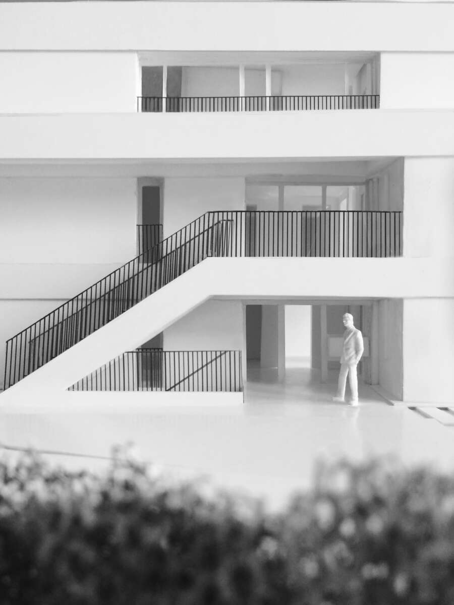 Die nach Süden ausgerichteten Häuser verfügen über eine klare Physiognomie: Sie werden von umlaufenden Stirnbändern horizontal strukturiert, die die Geschossdecken auszeichnen. Diese wiederum kontrastieren mit einem Wechselspiel aus vertikalen Wandfeldern und raumhoher Öffnungen. Die Positionierung der teils auskragenden, über Eck laufenden Terrassen machen Nähe und Weite unterschiedlich erlebbar, während organisch geschwungene Hecken die orthogonalen Hausformen konterkarieren. Raum im Freien wird auch dem Gartengeschoss zuteil, wobei grüne Hecken vor ungewollter Einsicht schützen.
