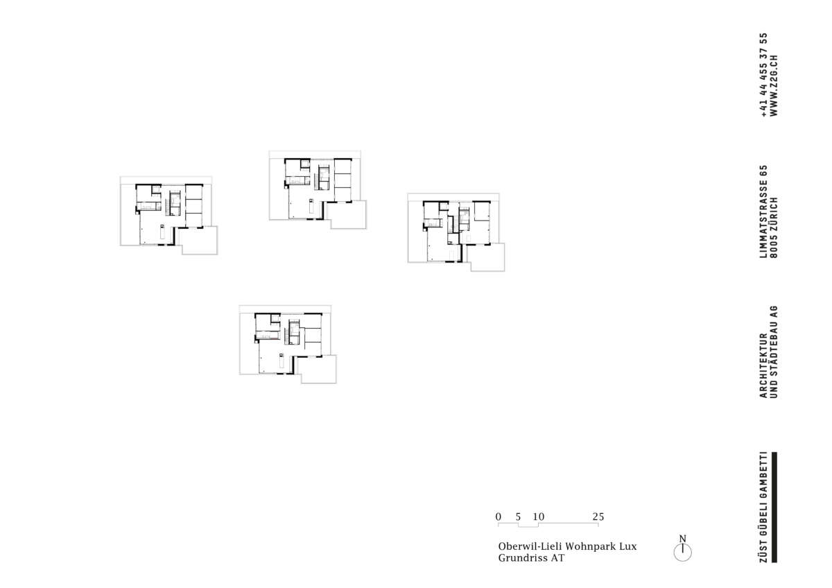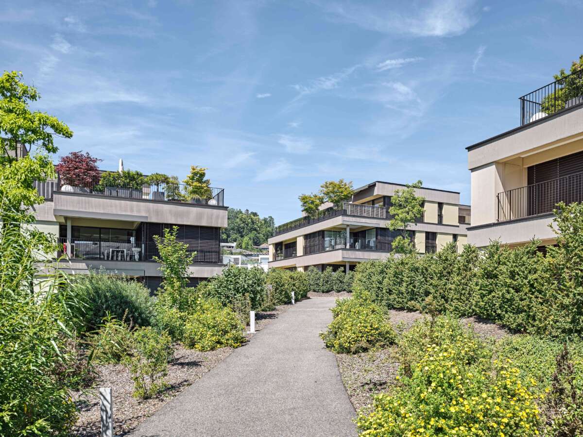 An der Nahtstelle zwischen Hangbebauung und Dorfkern haben Züst Gübeli Gambetti ein Wohnensemble entworfen, das dem Flächenfrass des Einfamilienhaus-Glücks entgegenwirken sollte. Bestehend aus nur einem einzigen Gebäudetyp, wirkt die Anlage wie ein zufällig hingeworfenes Cluster, das sich die Topografie zu Nutze macht. Bei genauer Betrachtung fällt auf, dass die im rechten Winkel versetzt zueinanderstehenden Häuser Wege, Plätze und Freiräume ausbilden, die – ganz der Idee vom «Wohnen im Park» folgend – den Aufenthalt im Freien zum Erlebnis machen. Insgesamt sind 21 Eigentumswohnungen in vier Häusern vereint, ohne dabei Abstriche in puncto Privatheit zu machen.