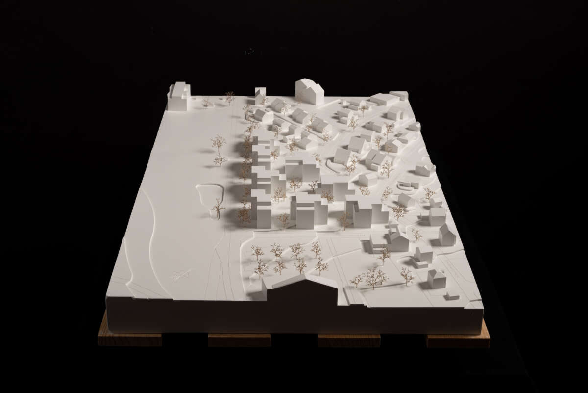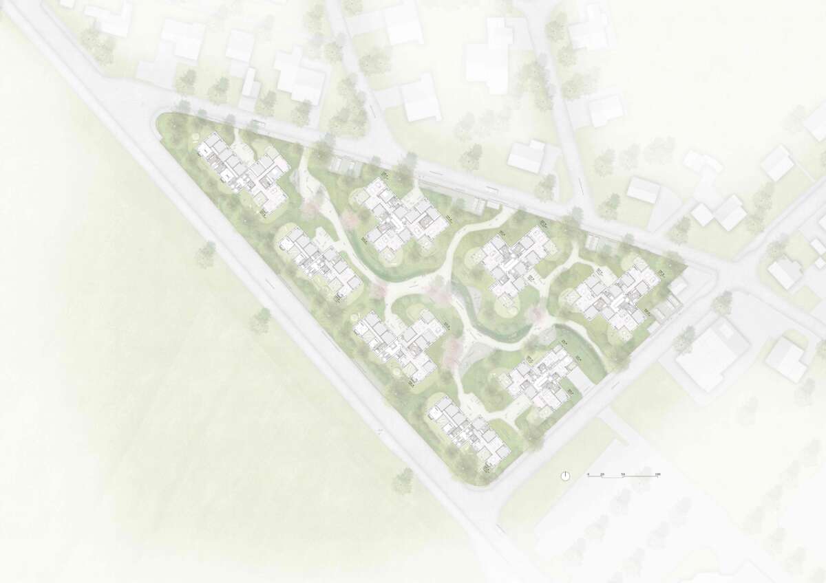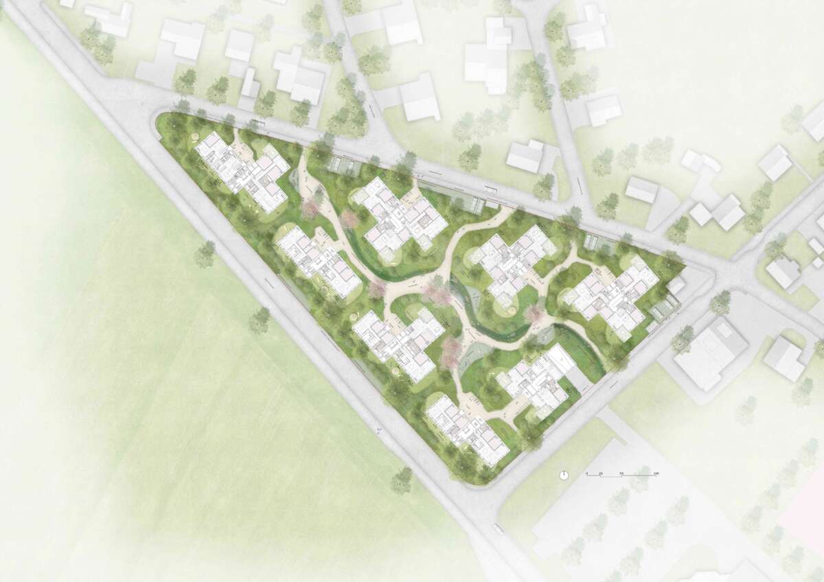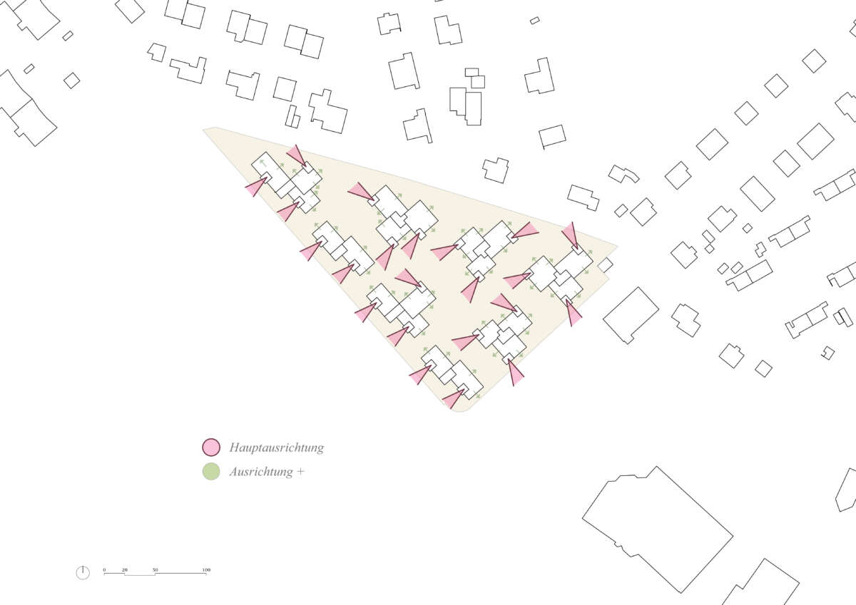 Die kubisch zergliederten Bauten sitzen in der Wiese und artikulieren eine selbstbewusste Haltung zur Urbanisierung der Landschaft. Sie basieren auf einem dreiblättrigen Grundtyp, der je nach Lage in Form und Ausdehnung variiert. Durch präzise Modulationen und Versätze wird ein städtebaulich prägnantes Cluster entwickelt, das mit durchlässigen, gleichwohl klaren Raumkanten auf den Kontext reagiert – und ins Innere hinein mit vielgestaltigen Raumsequenzen und Plätzen. Die Verzahnung mit dem nördlichen Quartier wird gefestigt durch eine Rückstaffelung in der Höhe, was sanfte Übergänge schafft.