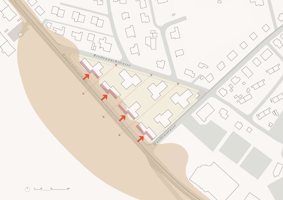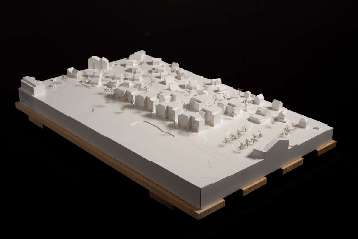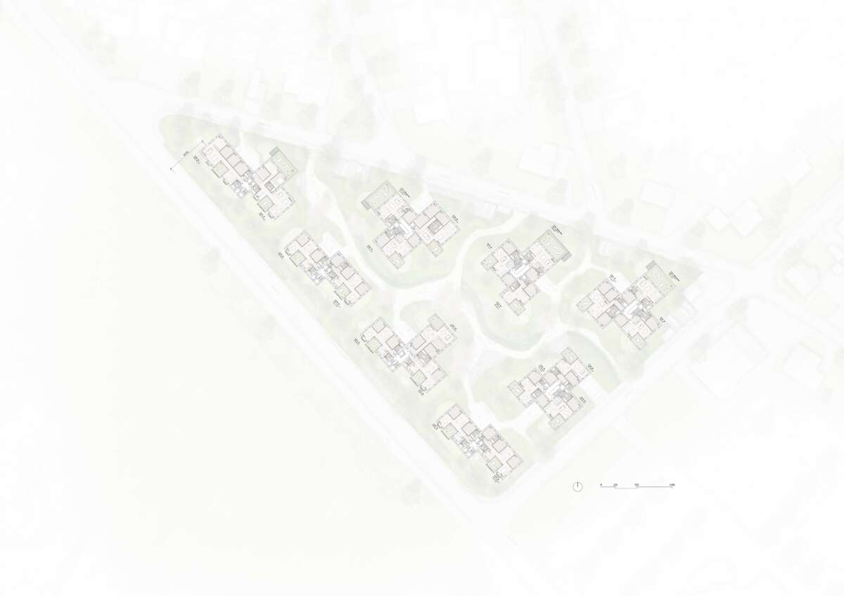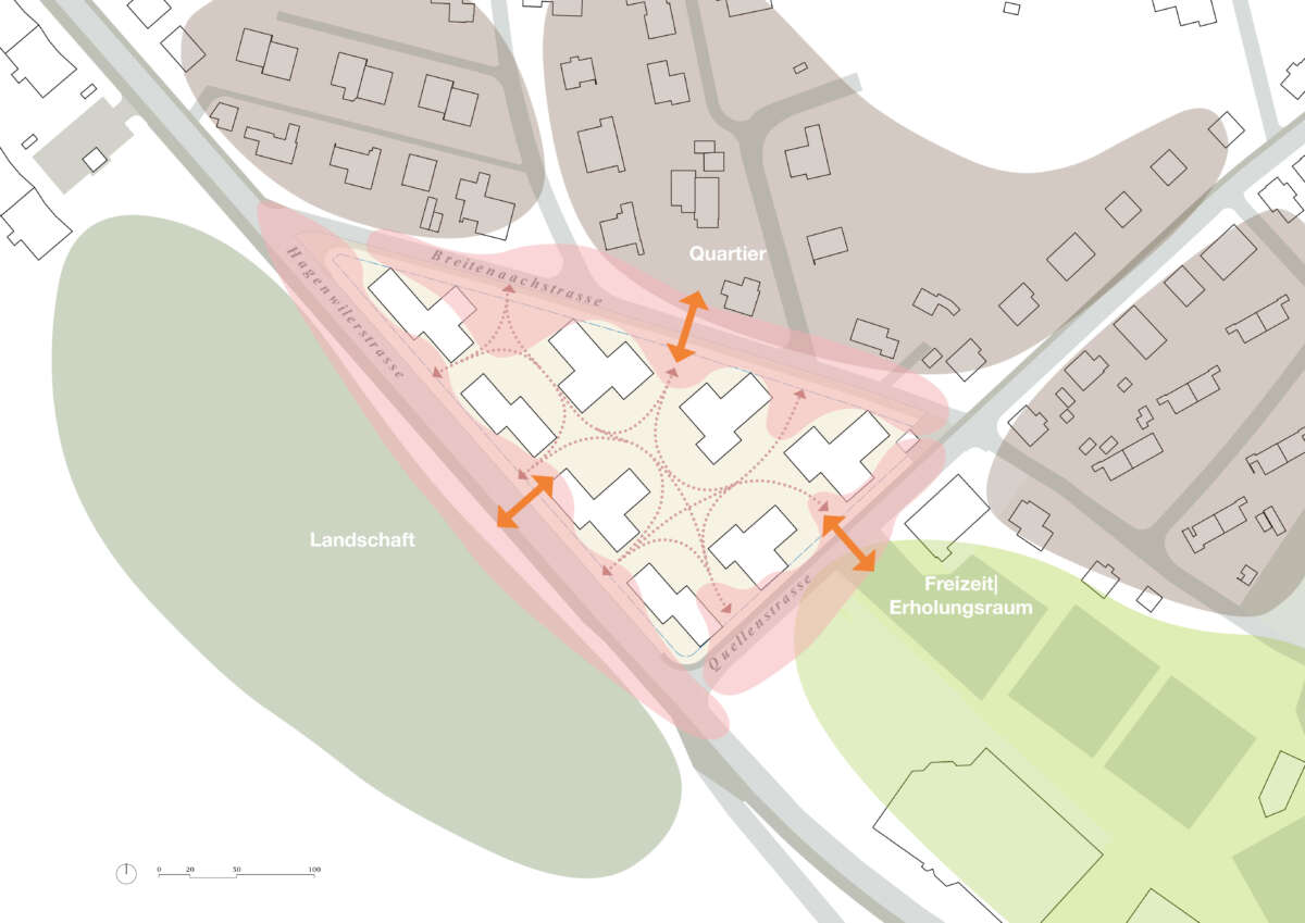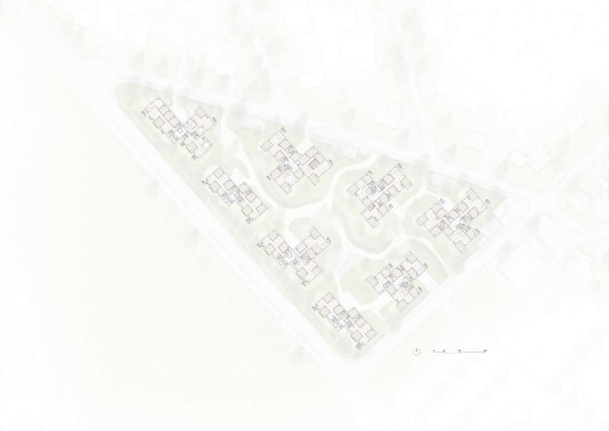 Die kubisch zergliederten Bauten sitzen in der Wiese und artikulieren eine selbstbewusste Haltung zur Urbanisierung der Landschaft. Sie basieren auf einem dreiblättrigen Grundtyp, der je nach Lage in Form und Ausdehnung variiert. Durch präzise Modulationen und Versätze wird ein städtebaulich prägnantes Cluster entwickelt, das mit durchlässigen, gleichwohl klaren Raumkanten auf den Kontext reagiert – und ins Innere hinein mit vielgestaltigen Raumsequenzen und Plätzen. Die Verzahnung mit dem nördlichen Quartier wird gefestigt durch eine Rückstaffelung in der Höhe, was sanfte Übergänge schafft.