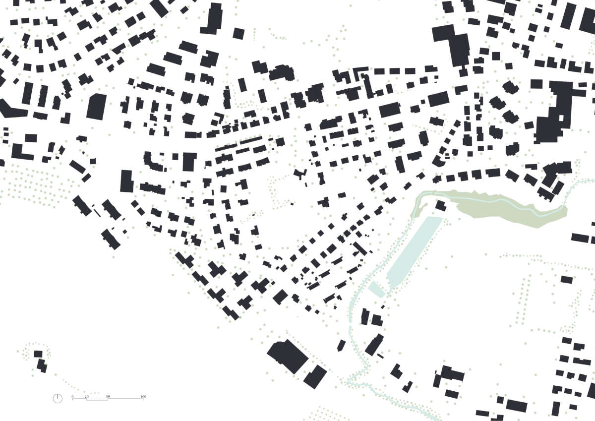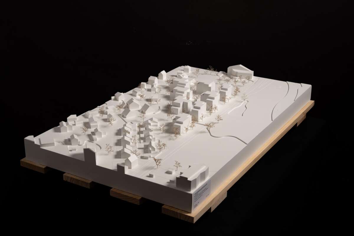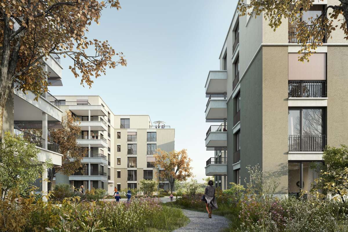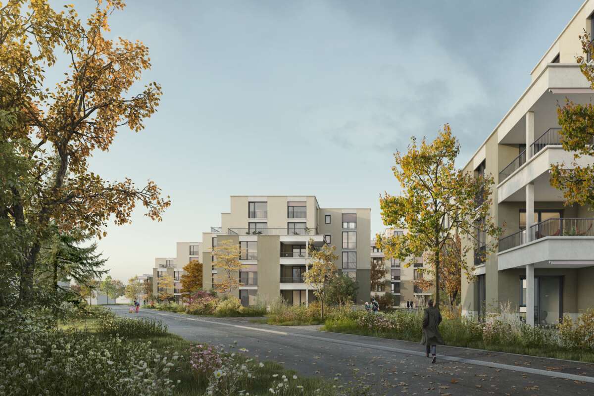 Die kubisch zergliederten Bauten sitzen in der Wiese und artikulieren eine selbstbewusste Haltung zur Urbanisierung der Landschaft. Sie basieren auf einem dreiblättrigen Grundtyp, der je nach Lage in Form und Ausdehnung variiert. Durch präzise Modulationen und Versätze wird ein städtebaulich prägnantes Cluster entwickelt, das mit durchlässigen, gleichwohl klaren Raumkanten auf den Kontext reagiert – und ins Innere hinein mit vielgestaltigen Raumsequenzen und Plätzen. Die Verzahnung mit dem nördlichen Quartier wird gefestigt durch eine Rückstaffelung in der Höhe, was sanfte Übergänge schafft.