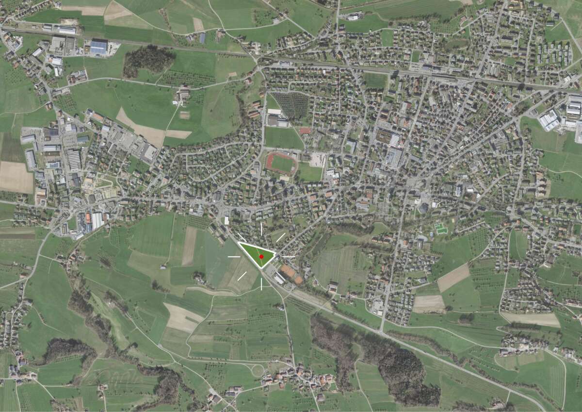 Das Verhältnis zwischen Stadt und Landschaft ist auch im verstädterten Industriedorf Amriswil ambivalent. Ein von drei Strassen beschnittenes Dreiecksareal liegt weit vorgerückt am südwestlichen Siedlungsrand. Umspült von Ausläufern des Siedlungsbreis, grossen Freizeitanlagen und Landwirtschafts-Idyll sowie beschallt von einer Verkehrsachse, verlangte es nach einem selbständigen Regelwerk auf «grüner Wiese». Züst Gübeli Gambetti präsentierten ein für die geforderte Dichte erstaunlich fein austariertes Siedlungsmuster mit acht Baukörpern. Ihr Eingriff spiegelt den Kreuzungspunkt verschiedener ortsbaulicher Bezüge.
