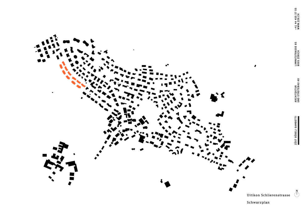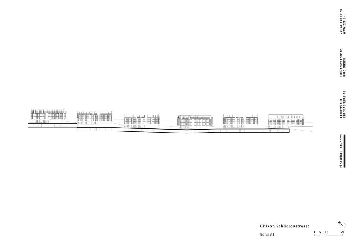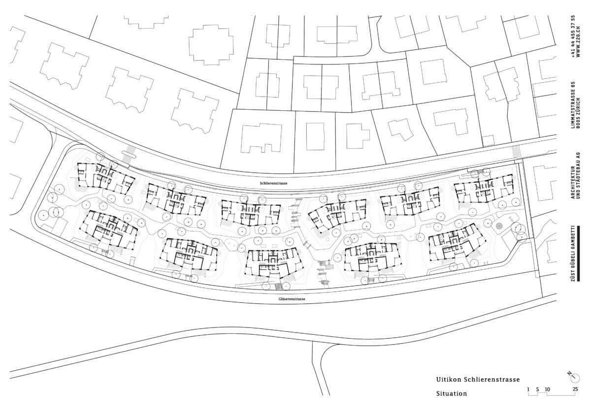 In Uitikon galt es, Herr über ein schmales, langgezogenes Grundstück zwischen Freihaltezone und lockerer Siedlungsstruktur zu werden und ihm eine urban-dörfliche Atmosphäre zu verleihen. Mit präzise kalkulierter Ungezwungenheit haben Züst Gübeli Gambetti die Forderung nach baulicher Verdichtung in eine Sequenz von elf scharfkantigen Baukörpern überführt. Das Ziel: Trotz dichter Packung sollten möglichst alle der 76 Wohnungen eine ungestörte Aussicht in die Landschaft erhalten. Dafür machte man sich auch den Verlauf des Terrains zu Nutze.