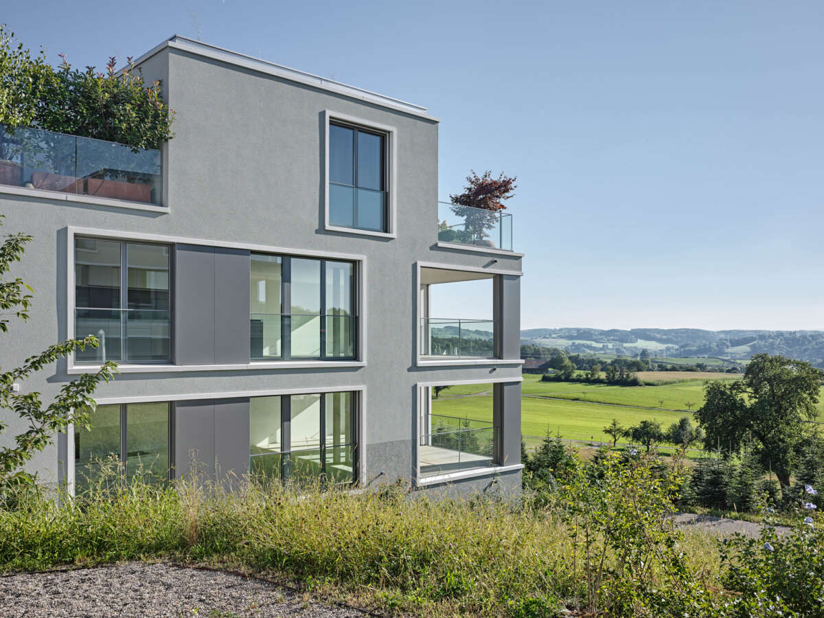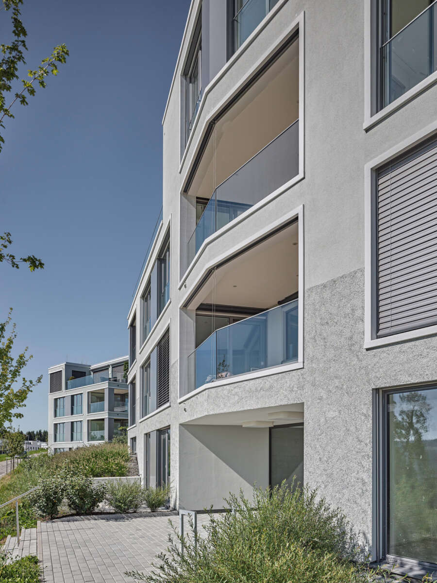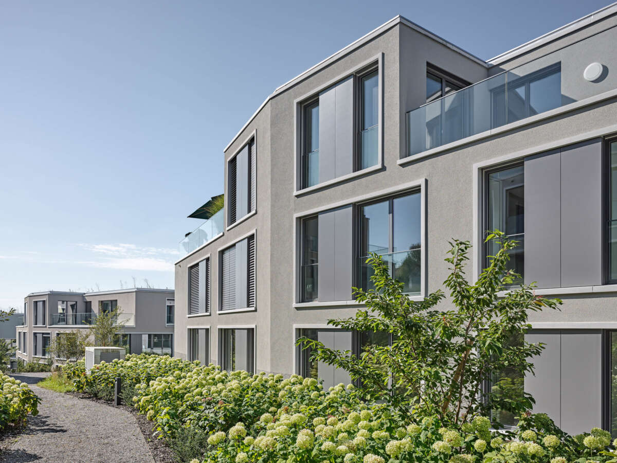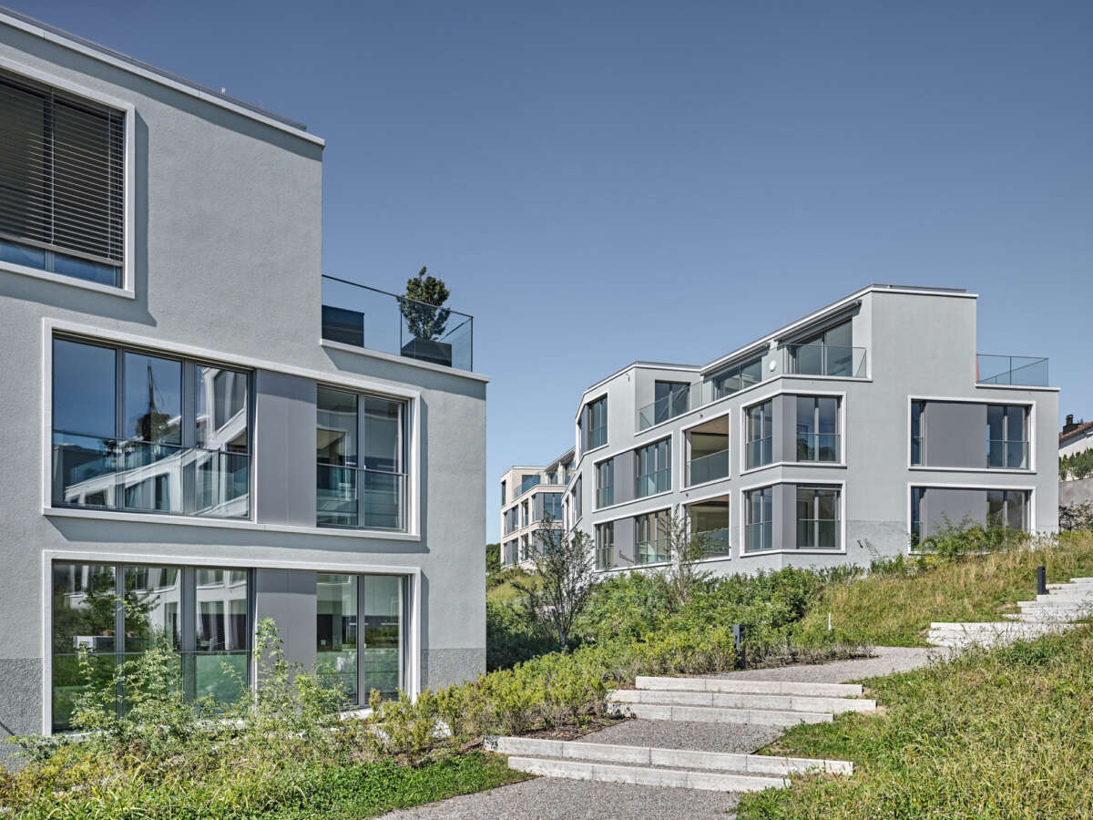 Durch Vor- und Rücksprünge im Attikageschoss erfahren die von Wiesen und Büschen umschlossenen Häuser eine zusätzliche Brechung. Sie sind der Zonenordnung geschuldet, die nur zwei Vollgeschosse erlaubt. Die expressive Gestalt ist also durch örtlich Gegebenes motiviert, formal aber bewusst und individuell gestaltet. Unterstützt wird dies durch ein Farbkonzept, das verschiedene Töne anschlägt: Elf nuanciert komponierte Grautöne ergeben zusammen mit der unterschiedlich blühenden Vegetation ein changierendes Gesamtbild, ohne dass die Farbgestaltung als solche bewusst wahrgenommen wird. (mc)