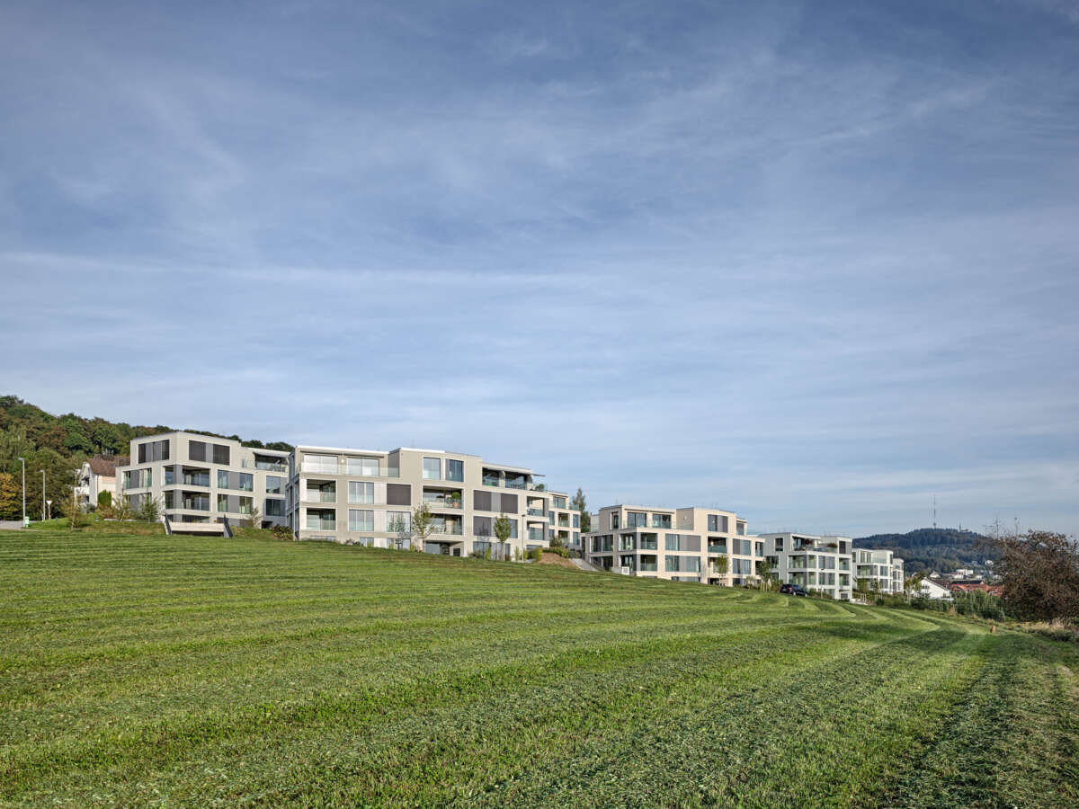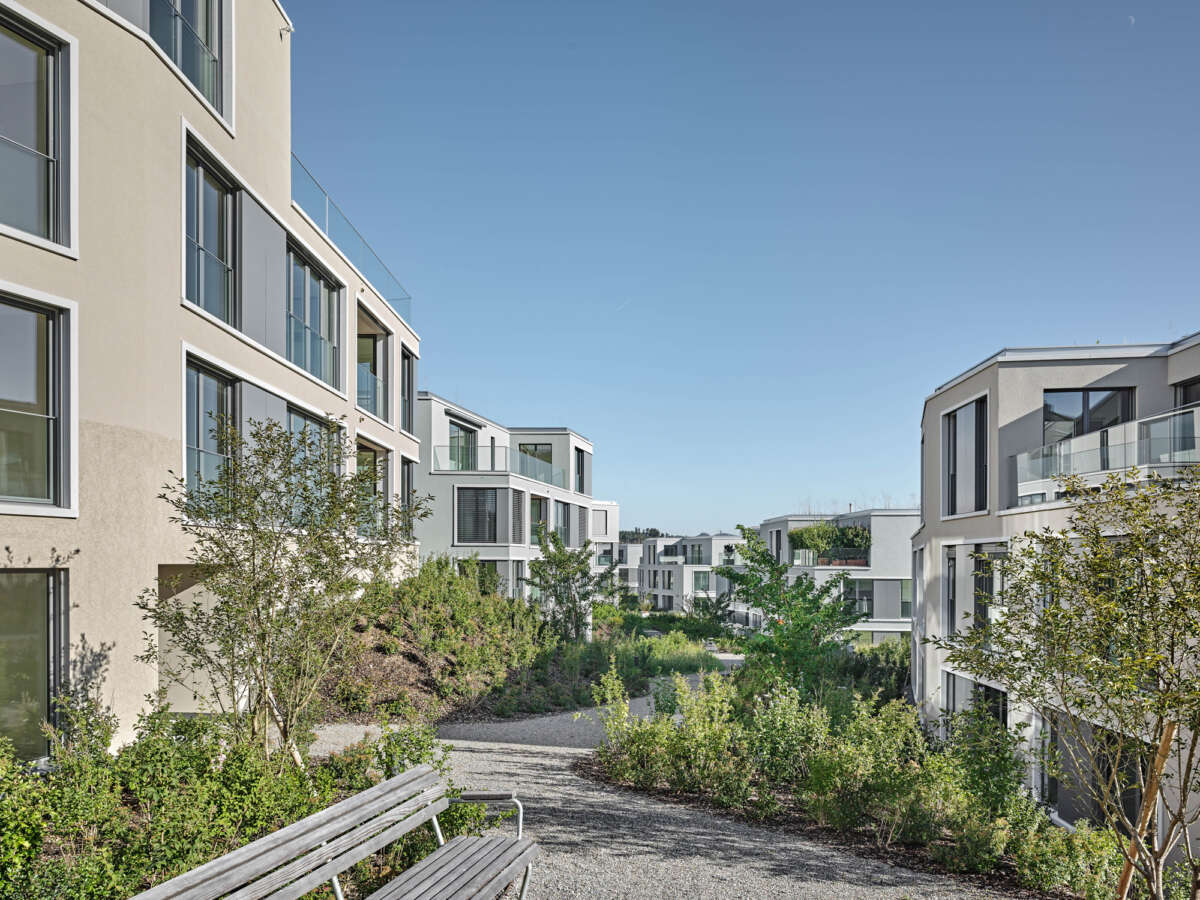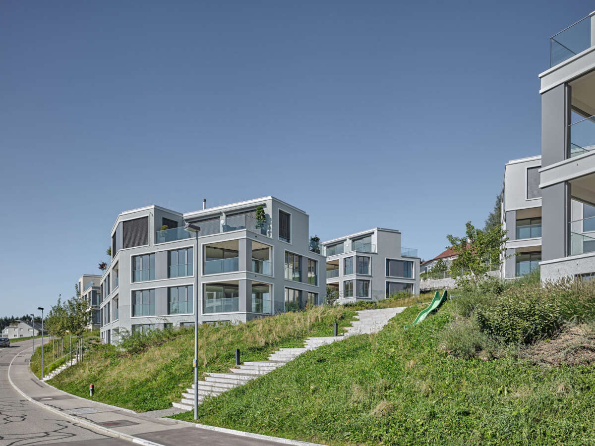 Die plastischen Baukörper wurden in einer melodisch anmutenden Komposition von zwei Reihen entlang ihrer Längsachse leicht gegeneinander versetzt. Das schafft Verbindungen und Durchlässigkeit. Dank ihrer Knicke fügen sich die Häuser als freie Figuren in die gebogene Hanglage ein. So lässt sich nicht nur ihre Masse zähmen, sondern gleichzeitig die Nähe des Vis-à-vis entschärfen. Der zwischen den Hauskolonnen entstehende Freiraum fungiert als eine Art Rückgrat. Er bindet die Gebäude über kurze Wege an sich und verfügt als siedlungsinterner Aufenthaltsort über dramaturgische Qualitäten.