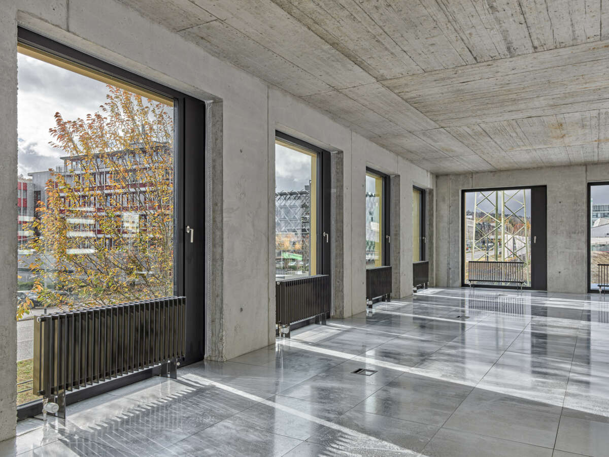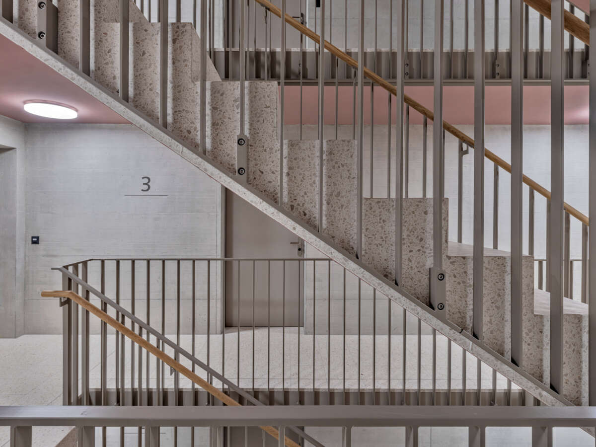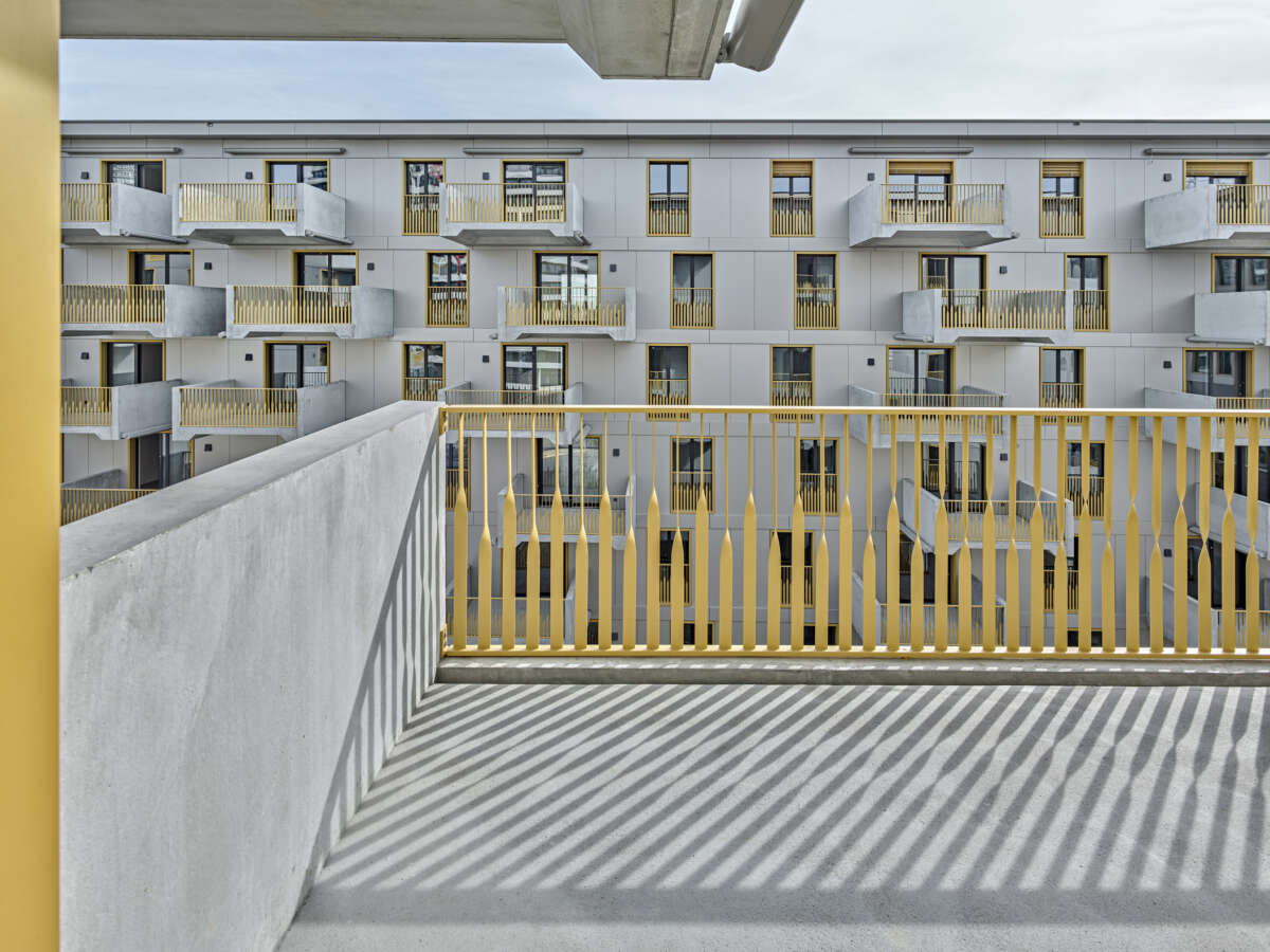 Ob Wohnen oder Arbeiten, die Fassaden dominiert ein strenges Raster aus sechs Fenstertypen, die mit den in den Wohnhof ausgreifenden Balkonschubladen alternieren. Sie überspielen die innere Variabilität der 162 Wohnungen. Daraus spricht der Spagat zwischen Wirtschaftlich- und Nachhaltigkeit: Alles ist möglichst einfach gehalten, das Material dafür am richtigen Ort investiert. Hier ein paar assoziative Einblicke in die Entstehung eines neues COSMOS …