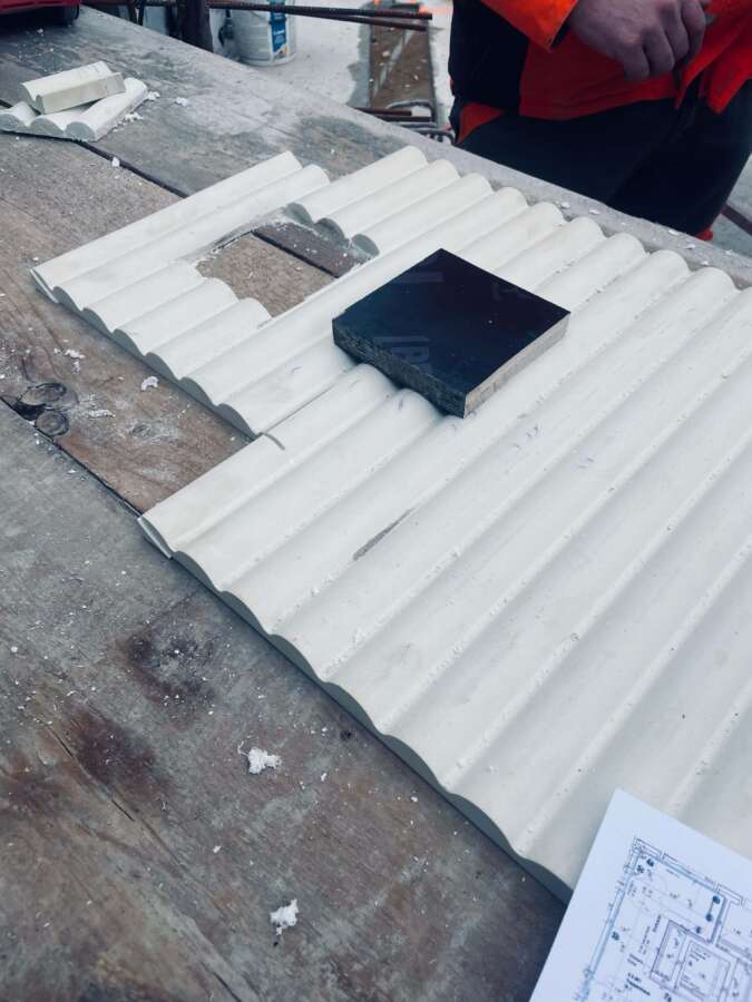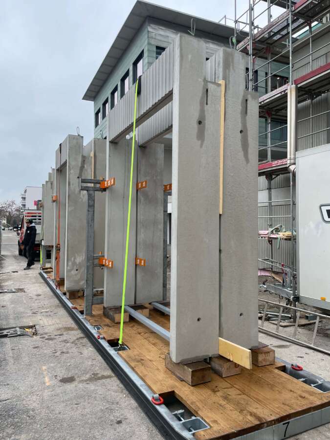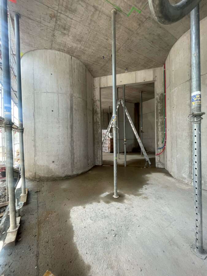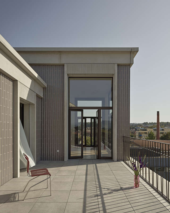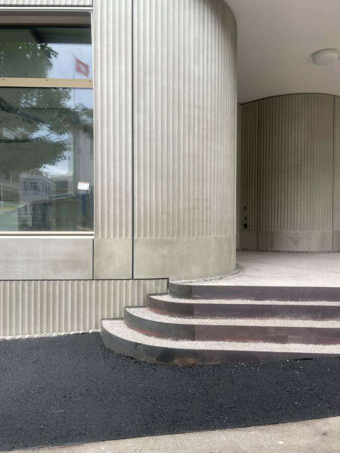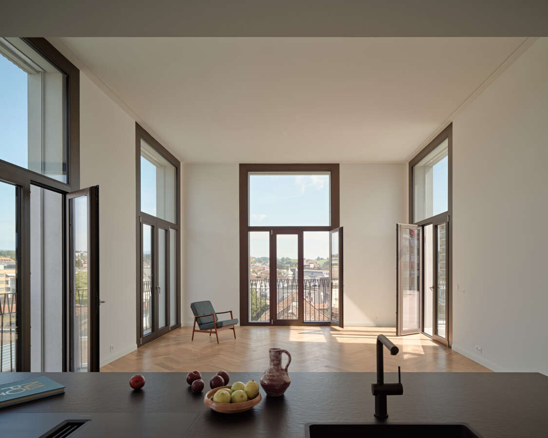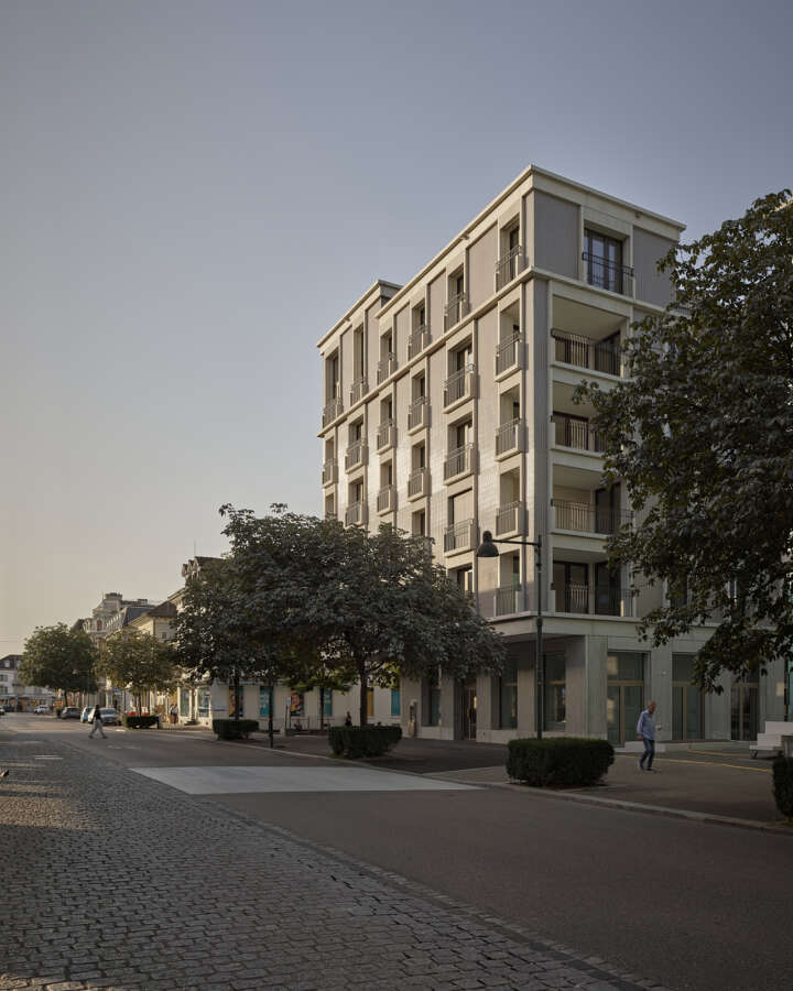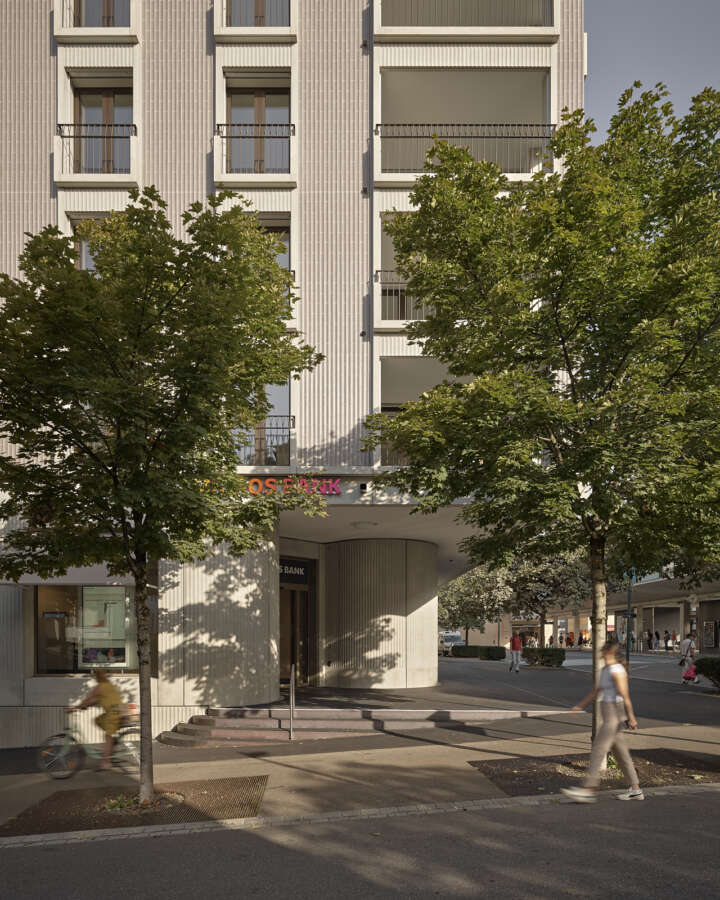 Das neue Haus am Platz spricht mit seiner dynamischen Rundung auf Augenhöhe die Einladung aus, das Geschäftslokal ruhig zu betreten. Darüber liegen die Wohnetagen mit je vier Einheiten und – natürlich! – Eck-Loggien. Ihre innere Geografie offeriert verschiedene Stimmungen und Blickbezüge. Das Attikageschoss ist je hälftig von einer Wohnung besetzt. Herzstück ist eine spektakuläre, ganz an den vorderen Rand des Gebäudes geschobene Wohnhalle. Gekleidet ist alles in städtische An-gemessenheit: Über dem elegant gerillten Betonsockel alternieren – getrennt von einem kräftigen Gurt – markante Fenstergewände mit konkaven Keramiken.