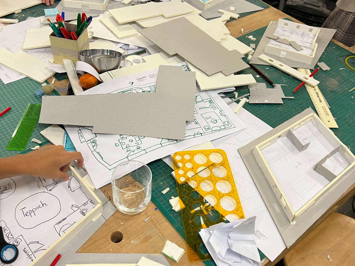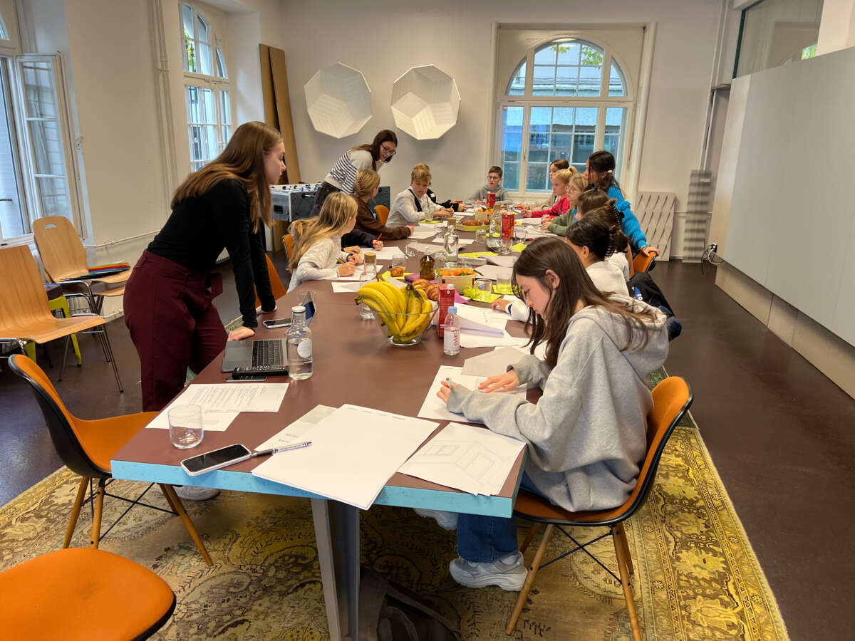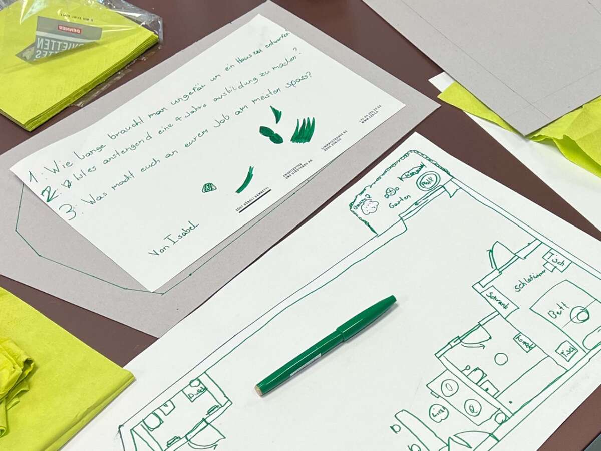 Die Welt ist aus den Fugen und dennoch gibt es Grund zur Hoffnung: Gestern wollten zehn Mädchen und vier Jungs Einblick in unseren Alltag gewinnen – so viele wie noch nie! Nachdem die ersten, finanziellen Fragen geklärt waren (Wieviel verdient man als Architekt:in?) ging es direkt in medias res: Entwerfe Dein Traumhaus mit Farb- und Materialkonzept.